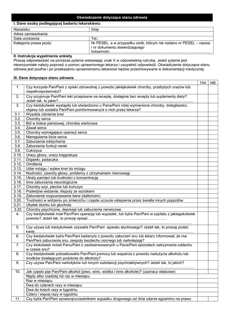 Oświadczenie dotyczące stanu zdrowia I. Dane osoby podlegającej badaniu lekarskiemu Nazwisko: Adres zamieszkania: Data urodzenia: Kategoria prawa jazdy: Imię: Tel.: Nr PESEL, a w przypadku osób, którym nie nadano nr PESEL – nazwa i nr dokumentu stwierdzającego tożsamość……………………………………………………………………… II. Instrukcja wypełnienia ankiety Proszę odpowiedzieć na poniższe pytania wstawiając znak X w odpowiednią rubrykę. Jeżeli pytanie jest niezrozumiałe należy poprosić o pomoc uprawnionego lekarza i uzupełnić odpowiedź. Oświadczenie dotyczące stanu zdrowia jest poufne i po przekazaniu uprawnionemu lekarzowi będzie przechowywane w dokumentacji medycznej. III. Dane dotyczące stanu zdrowia TAK 1. 2. 3. 3.1. 3.2. 3.3. 3.4. 3.5. 3.6. 3.7. 3.8. 3.9. 3.10. 3.11. 3.12. 3.13. 3.14. 3.15. 3.16. 3.17. 3.18. 3.19. 3.20. 3.21. 3.22 4. 5. 6. 7. 8. 9. 10. 11. Czy korzysta Pan/Pani z opieki zdrowotnej z powodu jakiejkolwiek choroby, przebytych urazów lub niepełnosprawności? Czy przyjmuje Pan/Pani leki przepisane na receptę, dostępne bez recepty lub suplementy diety? Jeżeli tak, to jakie?................................................................................................................................. Czy kiedykolwiek wystąpiły lub stwierdzono u Pana/Pani niżej wymienione choroby, dolegliwości, objawy lub został/a Pan/Pani poinformowany/a o nich przez lekarza? Wysokie ciśnienie krwi Choroby serca Ból w klatce piersiowej, choroba wieńcowa Zawał serca Choroby wymagające operacji serca Nieregularne bicie serca Zaburzenia oddychania Zaburzenia funkcji nerek Cukrzyca Urazy głowy, urazy kręgosłupa Drgawki, padaczka Omdlenia Udar mózgu / wylew krwi do mózgu Nudności, zawroty głowy, problemy z utrzymaniem równowagi Utraty pamięci lub trudności z koncentracją Inne zaburzenia neurologiczne Choroby szyi, pleców lub kończyn Podwójne widzenie, kłopoty ze wzrokiem Zaburzenie rozpoznawania barw (daltonizm) Trudności w widzeniu po zmierzchu i częste uczucie oślepienia przez światła innych pojazdów Ubytek słuchu lub głuchota Choroby psychiczne, depresje lub zaburzenia nerwicowe Czy kiedykolwiek miał Pan/Pani operację lub wypadek, lub był/a Pan/Pani w szpitalu z jakiegokolwiek powodu? Jeżeli tak, to proszę opisać……………………………………………………... …………………………………………………………………………………………………………………… Czy używa lub kiedykolwiek używał/a Pan/Pani aparatu słuchowego? Jeżeli tak, to proszę podać kiedy……………………………………………………………………………………………………………… Czy kiedykolwiek był/a Pan/Pani badany/a z powodu zaburzeń snu lub lekarz informował, że ma Pan/Pani zaburzenia snu, zespoły bezdechu nocnego lub narkolepsję? Czy ktokolwiek mówił Panu/Pani o zaobserwowanych u Pana/Pani epizodach zatrzymania oddechu w czasie snu? Czy kiedykolwiek potrzebował/a Pan/Pani pomocy lub wsparcia z powodu nadużycia alkoholu lub środków działających podobnie do alkoholu? Czy używa Pan/Pani narkotyków lub innych substancji psychoaktywnych? Jeżeli tak, to jakich? ................................................................................................................................................................ Jak często pije Pan/Pani alkohol (piwo, wino, wódka i inne alkohole)? (zaznacz właściwe) Nigdy albo rzadziej niż raz w miesiącu Raz w miesiącu Dwa do czterech razy w miesiącu Dwa do trzech razy w tygodniu Cztery i więcej razy w tygodniu Czy był/a Pan/Pani sprawcą/uczestnikiem wypadku drogowego od dnia zdania egzaminu na prawo NIE jazdy? Czy pobiera Pan/Pani rentę z tytułu niezdolności do pracy? Jeżeli tak, to z jakiego powodu?.............. ……………………………………………………………………………………………………………………... 13. Czy posiada Pan/Pani orzeczenie stwierdzające niepełnosprawność? Jeżeli tak, to jakie i z jakiej przyczyny?.............................................................................................................................................. IV. Oświadczam, że jestem świadomy/a konieczności zgłoszenia się do ponownej oceny stanu zdrowia w celu stwierdzenia istnienia lub braku przeciwskazań zdrowotnych do kierowania pojazdami w przypadku: 1) wystąpienia u osób chorych na cukrzycę w porze czuwania epizodu ciężkiej hipoglikemii, także niezwiązanego z kierowaniem pojazdami, 2) wystąpienia napadu padaczki lub drgawek. V. Pouczony/a o odpowiedzialności karnej z art.233 Kodeksu karnego – oświadczam, że podane przeze mnie dane są zgodne z prawdą. 12. …………………………………………………………… Podpis osoby składającej oświadczenie …………………………………………………………… Data