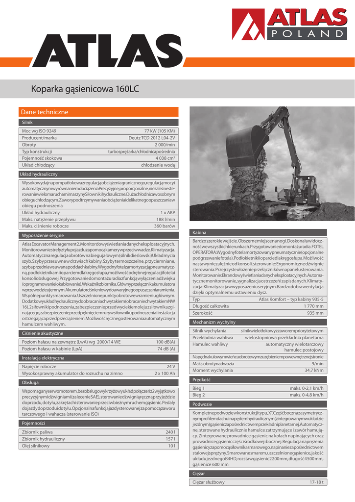 Koparka gąsienicowa 160LC Dane techniczne Silnik Moc wg ISO 9249 Producent/marka Obroty Typ konstrukcji Pojemność skokowa Układ chłodzący 77 kW (105 KM) Deutz TCD 2012 L04-2V 2 000/min turbosprężarka/chłodnicapośrednia 4 038 cm3 chłodzenie wodą Układ hydrauliczny Wysokowydajnapompatłokowazregulacjąobciążeniagranicznego,regulacjąmocyi automatycznymwyrównaniemobciążeniaPrecyzyjne,proporcjonalne,niezależnesterowaniewielomaruchamimaszynySiłownikihydrauliczne.Dużachłodnicawosobnym obieguchłodzącym.Zaworypodtrzymywaniaobciążeniaidelikatnegoopuszczaniaw obiegu podnoszenia Układ hydrauliczny 1 x AKP Maks. natężenie przepływu 188 l/min Maks. ciśnienie robocze 360 barów Kabina Wyposażenie seryjne AtlasExcavatorManagement2.Monitordowyświetlaniadanycheksploatacyjnych. Monitorowaniestrefyztyłupojazduzapomocąkamerywprzeciwwadze.Klimatyzacja. Automatycznaregulacjaobrotównabiegujałowym(silnikdieslowski)Układmycia szyb. Szyby przesuwne w drzwiach kabiny. Szyby termoszczelne, przyciemniane, szybaprzedniawsuwanapoddachkabiny.Wygodnyfotelzamortyzacjąpneumatyczną,podłokietnikamiioparciemdlakręgosłupa,możliwośćodrębnejregulacjifotelai konsoliobsługowej.Przygotowaniedomontażuradiazfunkcjąwyłączeniadźwięku (oprogramowanieiokablowanie).Wskaźnikzbiornika.Głównyprzełącznikakumulatora wprzewodzieujemnym.Akumulatorciśnieniowydoawaryjnegoopuszczaniaramienia. Wspólnepunktysmarowania.Uszczelnionepunktyobrotowewramieniugłównym. Dodatkowyukładhydraulicznydoobracaniachwytakiem(obracaniechwytakiemNW 16).2siłownikipodnoszenia,zabezpieczenieprzedwyciekiemolejuzsiłownikazginającego,zabezpieczenieprzedpęknięciemrurywsiłownikupodnoszeniaiinstalacja ostrzegającaprzedprzeciążeniem.Możliwośćręcznegosterowaniaautomatycznym hamulcem wahliwym. Ciśnienie akustyczne Poziom hałasu na zewnątrz (LwA) wg 2000/14 WE Poziom hałasu w kabinie (LpA) 100 dB(A) 74 dB (A) Instalacja elektryczna Napięcie robocze Wysokosprawny akumulator do rozruchu na zimno 24 V 2 x 100 Ah Mechanizm wychylny Silnik wychylania Przekładnia wahliwa Hamulec wahliwy silnikwielotłokowyzzaworempriorytetowym wielostopniowa przekładnia planetarna automatyczny wielotarczowy hamulec postojowy Napędnakulowymwieńcuobrotowymzuzębieniempowewnętrznejstronie Maks.obrotynadwozia 9/min Moment wychylania 34,7 kNm Prędkość Obsługa Wspomaganyserwomotorem,bezobsługowykrzyżowyukładpołączeńz2wyjątkowo precyzyjnymidźwigniami(zalecenieSAE),sterowaniedźwigniąręcznąprzyjeździe doprzodu,dotyłu,zakrętachisterowanieprzeciwbieżnymruchemgąsienic.Pedały dojazdydoprzoduidotyłu.Opcjonalnafunkcjajazdysterowanejzapomocązaworu tarczowego i wahacza (sterowanie ISO) Pojemności Zbiornik paliwa Zbiornik hydrauliczny Olej silnikowy Bardzo szerokie wejście. Obszerne miejsce na nogi. Doskonała widocznośćwewszystkichkierunkach.Przygotowaniedomontażuradia.FOTEL OPERATORA:Wygodnyfotelamortyzowanypneumatycznie(opcjonalne podgrzewaniefotela).Podłokietnikiioparciedlakręgosłupa.Możliwość nastawy niezależnie od konsoli. sterowanie: Ergonomiczne dźwignie sterowania. Przejrzyste ułożenie przełączników na panelu sterowania. Monitorowanie:Ekrandowyświetlaniadanycheksploatacyjnych.Automatyczne monitorowanie, sygnalizacja ostrzeżeń i zapis danych. Klimatyzacja:Klimatyzacjawwyposażeniu seryjnym.Bardzodobra wentylacja dzięki optymalnemu ustawieniu dysz. Typ Atlas Komfort – typ kabiny 935-5 Długość całkowita 1 770 mm Szerokość 935 mm 240 l 157 l 10 l Bieg 1 Bieg 2 maks. 0-2,1 km/h maks. 0-4,8 km/h Podwozie Kompletnepodwoziewkonstrukcjitypu„X”.Częśćbocznazasymetrycznymprofilemdachuinapędemhydraulicznym(zintegrowanymwukładzie jezdnym)gąsieniczapośrednictwemprzekładniplanetarnej.Automatyczne, sterowane hydraulicznie hamulce zatrzymujące i zawór hamujący. Zintegrowane prowadnice gąsienic na kołach napinających oraz prowadnice gąsienic części środkowej i bocznej. Regulacja naprężenia gąsienicyzapomocąsiłownikasmarowego,napinaniezapośrednictwem stalowejsprężyny.Smarowanesmarem,uszczelnionegąsienice,jakość układu jezdnego B4HD, rozstaw gąsienic 2 200 mm, długość 4 500 mm, gąsienice 600 mm Ciężar Ciężar służbowy 17-18 t Główne wymiary Pozycja transportowa 160LC B I A H D G C A C WYSOKOŚĆ TRANSPORTOWA B E F DŁUGOŚĆ TRANSPORTOWA Wysięgnik przestawny 1,95 m (C3.41), 2,94 m (C346), 2,50 m (D33).......3,00 m Wysięgnik przestawny 1,95 m (C3.41), 2,94 m (C346), 2,50 m (D35......... 7,65 m Wysięgnik przestawny 1,95 m (C3.41), 2,94 m (C346), 3,06 m (D331).....3,10 m Wysięgnik przestawny 1,95 m (C3.41), 2,94 m (C346), 3,06 m (D331)..... 7,65 m Wysięgnik przestawny 1,95 m (C3.41), 2,94 m (C346), 3,55 m (D35).......3,00 m Wysięgnik przestawny 1,95 m (C3.41), 2,94 m (C346), 3,55 m (D35)....... 7,75 m Wysięgnik przestawny 1,95 m (C3.41), 3,58 m (C346.1), 2,50 m (D33)....3,10 m Wysięgnik przestawny 1,95 m (C3.41), 3,58 m (C346.1), 2,50 m (D33).... 8,05 m Wysięgnik przestawny 1,95 m (C3.41), 3,58 m (C346,1), 3,06 m (D331)..3,10 m Wysięgnik przestawny 1,95 m (C3.41), 3,58 m (C346.1), 3,06 m (D331).. 8,20 m Wysięgnik typu monoblok 4,30 m (C3.3MG) z ramieniem 1,96 m (D32).2,95 m Wysięgnik typu monoblok 4,22 m (C3.3M) z ramieniem 1,96 m (D32)... 7,55 m Wysięgnik typu monoblok 4,30 m (C3.3MG) z ramieniem 2,50 m (D33).2,95 m Wysięgnik typu monoblok 4,30 m (C3.3MG) z ramieniem 2,50 m (D33).7,55 m SZEROKOŚĆ TRANSPORTOWA F DŁUGOŚĆ PODWOZIA..........................................................................................4,50 m Szerokość płytek gąsienicowych 600 mm.................................................... 2,80 m ROZSTAW GĄSIENIC 2,20 m G PRZEŚWIT PODŁUŻNY..........................................................................................0,46 m D PROMIEŃ OBROTU TYŁU MASZYNY................................................................ 2,19 m H WYSOKOŚĆ DO DACHU KABINY..........................................
