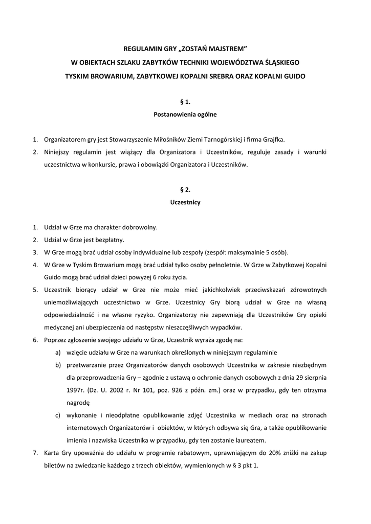 REGULAMIN GRY „ZOSTAŃ MAJSTREM” W OBIEKTACH SZLAKU ZABYTKÓW TECHNIKI WOJEWÓDZTWA ŚLĄSKIEGO TYSKIM BROWARIUM, ZABYTKOWEJ KOPALNI SREBRA ORAZ KOPALNI GUIDO § 1. Postanowienia ogólne 1. Organizatorem gry jest Stowarzyszenie Miłośników Ziemi Tarnogórskiej i firma Grajfka. 2. Niniejszy regulamin jest wiążący dla Organizatora i Uczestników, reguluje zasady i warunki uczestnictwa w konkursie, prawa i obowiązki Organizatora i Uczestników. § 2. Uczestnicy 1. Udział w Grze ma charakter dobrowolny. 2. Udział w Grze jest bezpłatny. 3. W Grze mogą brać udział osoby indywidualne lub zespoły (zespół: maksymalnie 5 osób). 4. W Grze w Tyskim Browarium mogą brać udział tylko osoby pełnoletnie. W Grze w Zabytkowej Kopalni Guido mogą brać udział dzieci powyżej 6 roku życia. 5. Uczestnik biorący udział w Grze nie może mieć jakichkolwiek przeciwskazań zdrowotnych uniemożliwiających uczestnictwo w Grze. Uczestnicy Gry biorą udział w Grze na własną odpowiedzialność i na własne ryzyko. Organizatorzy nie zapewniają dla Uczestników Gry opieki medycznej ani ubezpieczenia od następstw nieszczęśliwych wypadków. 6. Poprzez zgłoszenie swojego udziału w Grze, Uczestnik wyraża zgodę na: a) wzięcie udziału w Grze na warunkach określonych w niniejszym regulaminie b) przetwarzanie przez Organizatorów danych osobowych Uczestnika w zakresie niezbędnym dla przeprowadzenia Gry – zgodnie z ustawą o ochronie danych osobowych z dnia 29 sierpnia 1997r. (Dz. U. 2002 r. Nr 101, poz. 926 z późn. zm.) oraz w przypadku, gdy ten otrzyma nagrodę c) wykonanie i nieodpłatne opublikowanie zdjęć Uczestnika w mediach oraz na stronach internetowych Organizatorów i obiektów, w których odbywa się Gra, a także opublikowanie imienia i nazwiska Uczestnika w przypadku, gdy ten zostanie laureatem. 7. Karta Gry upoważnia do udziału w programie rabatowym, uprawniającym do 20% zniżki na zakup biletów na zwiedzanie każdego z trzech obiektów, wymienionych w § 3 pkt 1. 8. Jedna Karta Gry przysługuje jednej drużynie (drużyna = od 1 do 5 osób). 9. Liczba osób uprawnionych do skorzystania ze zniżki, opisanej w § 2. pkt 7 jest równa liczbie osób w drużynie. 10. Każdy Uczestnik Gry ma obowiązek zapoznania się z treścią niniejszego regulaminu. § 3. Termin, miejsce i przebieg gry 1. Gra zostanie przeprowadzona w dniu 12.12.2015r. jednocześnie w trzech obiektach Szlaku Zabytków Techniki: a) Zabytkowa Kopalnia Srebra: ul. Szczęść Boże 81, Tarnowskie Góry b) Tyskie Browarium: ul. Katowicka 9, Tychy c) Kopalnia GUIDO: ul. 3 Maja 93, Zabrze 2. Uczestnicy wybierają jeden z obiektów na miejsce gry i rejestrują swój udział pod numerem telefonu: 792 200 449, od poniedziałku do soboty w godzinach od 10.00 do 20.00. 3. Drużyny/Uczestnicy rozpoczynają grę o wyznaczonej godzinie, podanej przy rezerwacji. 4. W Grze „Zostań Majstrem” Uczestnicy są czeladnikami, którzy mogą zdobyć fach, przechodząc kolejne stopnie wtajemniczenia – poznając zasady zawodu, wierzenia i obyczaje górników/gwarków/ piwowarów. Gra polega na odnalezieniu w każdym z obiektów stacji Gry, przy której są postacie i zadania. Obowiązkiem Uczestników jest dotarcie do wszystkich stacji i rozwiązanie powierzonych tam zadań. 5. Na starcie Uczestnicy otrzymują woreczek ze środkiem płatniczym w liczbie 10 sztuk (1 sztuka środka płatniczego=1 punkt), będącym przepustką do rozpoczęcia gry. Przy każdym z zadań za poprawne odpowiedzi uczestnicy otrzymają kolejne punkty. Błędne odpowiedzi oznaczają punkty karne, za które środki płatnicze będą odbierane. 6. W każdym obiekcie podczas Gry można zdobyć maksymalnie 50 punktów. Wygrywa osoba/drużyna, która skończy grę, będąc w posiadaniu największej liczby punktów. 7. Na trasie będą znajdowały się ukryte pytania. Odnalezienie ich oraz poprawna odpowiedź będzie oznaczała dodatkowe punkty, a udzielenie błędnych odpowiedzi - stratę punktów. Szukanie dodatkowych pytań jest opcjonalne. 8. Punktowane są tylko odpowiedzi udzielane samodzielnie. Wszelkie próby korzystania z Internetu podczas wykonywania zadań oznaczają dyskwalifikację. § 4. Ogłoszenie wyników, nagrody 1. Fundatorem nagród w konkursie jest Kompania Piwowarska SA. 2. Nagrodą główną jest nagroda rzeczowa w postaci bonów upominkowych o wartości 500 złotych do podziału w równych częściach między członków drużyny. 3. W każdym z trzech obiektów zostanie przyznana jedna nagroda główna. 4. Wyłonienie laureata nastąpi po dotarciu na metę ostatniej grupy. O wygranej zwycięzca zostanie poinformowany telefonicznie w terminie do 3 dni roboczych. 5. W przypadku, gdy w obiekcie liczba drużyn z tą samą liczbą punktów będzie większa, drużyna otrzyma zadanie dodatkowe, które pozwoli wyłonić laureata. O zadaniu dodatkowym drużyna zostanie poinformowana telefonicznie, a laureata wyłoni powołane w tym celu jury. 6. Nagrody zostaną wysłane kurierem na podany adres w terminie 14 dni od wyłonienia laureata. Istnieje możliwość osobistego odbioru nagrody po wcześniejszym uzgodnieniu terminu odbioru. Odbiór nagrody zostanie potwierdzony przez laureata podpisaniem protokołu nagrody. 7. Nie ma możliwości wymiany nagrody na ekwiwalent pieniężny. W przypadku rezygnacji z nagrody zostaje ona przekazana kolejnej osobie/drużynie z listy laureatów. § 5. Reklamacje 1. Wszelkie reklamacje Uczestników dotyczące przebiegu konkursu mogą być składane przez Uczestników w terminie do dnia 20 grudnia 2015 r. Reklamacja powinna być przesłana na adres poczty elektronicznej Organizatora: [email protected] i zawierać dane Uczestnika oraz dokładny opis okoliczności stanowiących podstawę reklamacji. 2. Reklamacje zgłoszone po terminie określonym w ustępie poprzedzającym, jak również nie spełniające pozostałych wymogów przewidzianych w ustępie poprzedzającym, nie będą rozpatrywane. 3. Złożo