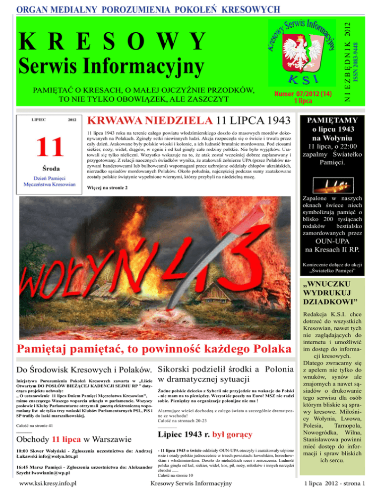 ISSN 2083-9448 K R E S OWY Serwis Informacyjny PAMIĘTAĆ O KRESACH, O MAŁEJ OJCZYŹNIE PRZODKÓW, TO NIE TYLKO OBOWIĄZEK, ALE ZASZCZYT N I E Z B Ę D N I K 2012 ORGAN MEDIALNY POROZUMIENIA POKOLEŃ KRESOWYCH Numer 07/2012 (14) 1 lipca KRWAWA NIEDZIELA 11 LIPCA 1943 11 lipca 1943 roku na terenie całego powiatu włodzimierskiego doszło do masowych mordów dokonywanych na Polakach. Zginęły setki niewinnych ludzi. Akcja rozpoczęła się o świcie i trwała przez cały dzień. Atakowane były polskie wioski i kolonie, a ich ludność brutalnie mordowana. Pod ciosami siekier, noży, wideł, drągów, w ogniu i od kul ginęły całe rodziny polskie. Nie było wyjątków. Uratowali się tylko nieliczni. Wszystko wskazuje na to, że atak został wcześniej dobrze zaplanowany i przygotowany. Z relacji naocznych świadków wynika, że atakowali żołnierze UPA (przez Polaków nazywani banderowcami lub bulbowcami) wspomagani przez uzbrojone oddziały chłopów ukraińskich, nierzadko sąsiadów mordowanych Polaków. Około południa, najczęściej podczas sumy zaatakowane zostały polskie świątynie wypełnione wiernymi, którzy przybyli na niedzielną mszę. PAMIĘTAMY o lipcu 1943 na Wołyniu 11 lipca, o 22:00 zapalmy Światełko Pamięci. Więcej na stronie 2 Zapalone w naszych oknach świece niech symbolizują pamięć o blisko 200 tysiącach rodaków bestialsko zamordowanych przez OUN-UPA na Kresach II RP. Koniecznie dołącz do akcji „Światełko Pamięci” „WNUCZKU WYDRUKUJ DZIADKOWI” Pamiętaj pamiętać, to powinność każdego Polaka Do Środowisk Kresowych i Polaków. Sikorski podzielił środki a Polonia Inicjatywa Porozumienia Pokoleń Kresowych zawarta w „Liście w dramatycznej sytuacji Otwartym DO POSŁÓW BIEŻĄCEJ KADENCJI SEJMU RP ” dotycząca projektu uchwały: „ O ustanowienie 11 lipca Dniem Pamięci Męczeństwa Kresowian", mimo znaczącego Waszego wsparcia utknęła w parlamencie. Wszyscy posłowie i Kluby Parlamentarne otrzymali pocztą elektroniczną wspomniany list ale tylko trzy wnioski Klubów Parlamentarnych PSL, PiS i SP trafiły do laski marszałkowskiej. Całość na stronie 41 _______ Alarmujące wieści dochodzą z całego świata a szczególnie dramatyczne ze wschodu! Całość na stronach 20-23 ________ Lipiec 1943 r. był gorący Obchody 11 lipca w Warszawie 10:00 Skwer Wołyński - Zgłoszenia uczestnictwa do: Andrzej Łukawski [email protected] 16:45 Marsz Pamięci - Zgłoszenia uczestnictwa do: Aleksander Szycht [email protected] www.ksi.kresy.info.pl Żadne polskie dziecko z Syberii nie przyjedzie na wakacje do Polski - nie mam na to pieniędzy. Wszystkie poszły na Euro! MSZ nie radzi sobie. Pieniędzy na organizacje polonijne nie ma ! - 11 lipca 1943 o świcie oddziały OUN-UPA otoczyły i zaatakowały uśpione wsie i osady polskie jednocześnie w trzech powiatach: kowelskim, horochowskim i włodzimierskim. Doszło do nieludzkich rzezi i zniszczenia. Ludność polska ginęła od kul, siekier, wideł, kos, pił, noży, młotków i innych narzędzi zbrodni ...... Całość na stronie 10 Kresowy Serwis Informacyjny Redakcja K.S.I. chce dotrzeć do wszystkich Kresowian, nawet tych nie zaglądających do internetu i umożliwić im dostęp do informacji kresowych. Dlatego zwracamy się z apelem nie tylko do wnuków, synów ale znajomych a nawet sąsiadów o drukowanie tego serwisu dla osób którym bliskie są sprawy kresowe. Miłośnicy Wołynia, Lwowa, Polesia, Tarnopola, Nowogródka, Wilna, Stanisławowa powinni mieć dostęp do informacji i spraw bliskich ich sercu. 1 lipca 2012 - strona 1 HISTORIA - WSPOMNIENIA - RELACJE KRWAWA NIEDZIELA 11 LIPCA 1943 Sławomir Tomasz Roch 11 lipca 1943 roku na terenie całego powiatu włodzimierskiego doszło do masowych mordów dokonywanych na Polakach. Zginęły setki niewinnych ludzi. Akcja rozpoczęła się o świcie i trwała przez cały dzień. Atakowane były polskie wioski i kolonie, a ich ludność brutalnie mordowana. Pod ciosami siekier, noży, wideł, drągów, w ogniu i od kul ginęły całe rodziny polskie. Nie było wyjątków. Uratowali się tylko nieliczni. Wszystko wskazuje na to, że atak został wcześniej dobrze zaplanowany i przygotowany. Z relacji naocznych świadków wynika, że atakowali żołnierze UPA (przez Polaków nazywani banderowcami lub bulbowcami) wspomagani przez uzbrojone oddziały chłopów ukraińskich, nierzadko sąsiadów mordowanych Polaków. Około południa, najczęściej podczas sumy zaatakowane zostały polskie świątynie wypełnione wiernymi, którzy przybyli na niedzielną mszę. W Chrynowie gm. Grzybowica przy drogach i ścieżkach, prowadzących do kaplicy, banderowcy od rana rozłożyli swoje posterunki, które przepuszczały bez przeszkód ludność polską zdążającą na mszę, nie przepuszczały natomiast nikogo, kto by chciał udać się do domu, zawracając wszystkich z powrotem do kaplicy. Tego dnia zgromadziło się około 200 wiernych. Większość z nich zginęła po tym, jak banderowcy otworzyli ogień do zgromadzonych. Wraz ze swymi wiernymi śmierć poniósł ksiądz Jan Kotwicki. [1] W Porycku banderowcy zaatakowali Polaków tuż przed nabożeństwem około godz. 11.00, kiedy do ludzi otworzyli ogień z broni ręcznej i maszynowej. Z masakry uratowali się tylko nieliczni, którzy udawali zabitych. Wśród wielu ciężko rannych znalazł się także ksiądz Bolesław Szawłowski, który niedługo później zmarł, uzupełniając liczbę około 200 osób zabitych tego dnia w kościele i jego okolicach. Na zakończenie rzezi Ukraińcy usiłowali zburzyć murowany Kościół pw. św. Trójcy i św. Michała Archanioła postawiony w latach 1759-1774. Na dywan na ołtarzu nanieśli słomy, włożyli w nią pocisk artyleryjski i podpalili. Pocisk eksplodował, ale mury pozostały nienaruszone, a tylko uszkodzona została dolana część ołtarza i zniszczone wnętrza. [2] Podobnież w interesującym nas Swojczowie gm. Werba, rzeź rozpoczęła