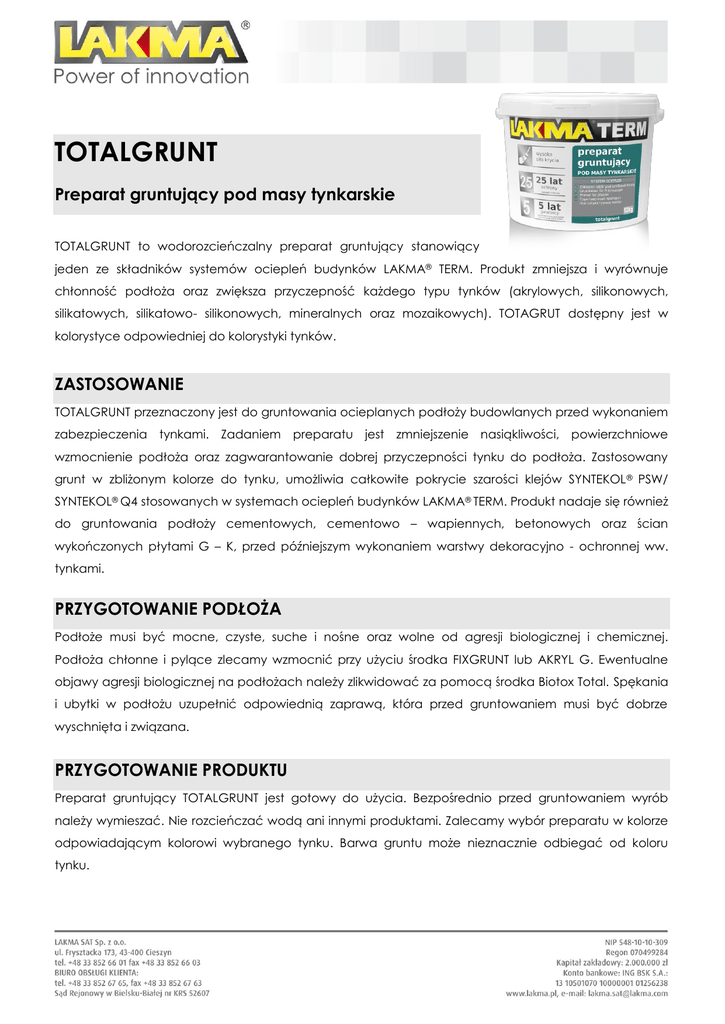 TOTALGRUNT Preparat gruntujący pod masy tynkarskie TOTALGRUNT to wodorozcieńczalny preparat gruntujący stanowiący jeden ze składników systemów ociepleń budynków LAKMA® TERM. Produkt zmniejsza i wyrównuje chłonność podłoża oraz zwiększa przyczepność każdego typu tynków (akrylowych, silikonowych, silikatowych, silikatowo- silikonowych, mineralnych oraz mozaikowych). TOTAGRUT dostępny jest w kolorystyce odpowiedniej do kolorystyki tynków. ZASTOSOWANIE TOTALGRUNT przeznaczony jest do gruntowania ocieplanych podłoży budowlanych przed wykonaniem zabezpieczenia tynkami. Zadaniem preparatu jest zmniejszenie nasiąkliwości, powierzchniowe wzmocnienie podłoża oraz zagwarantowanie dobrej przyczepności tynku do podłoża. Zastosowany grunt w zbliżonym kolorze do tynku, umożliwia całkowite pokrycie szarości klejów SYNTEKOL ® PSW/ SYNTEKOL® Q4 stosowanych w systemach ociepleń budynków LAKMA® TERM. Produkt nadaje się również do gruntowania podłoży cementowych, cementowo – wapiennych, betonowych oraz ścian wykończonych płytami G – K, przed późniejszym wykonaniem warstwy dekoracyjno - ochronnej ww. tynkami. PRZYGOTOWANIE PODŁOŻA Podłoże musi być mocne, czyste, suche i nośne oraz wolne od agresji biologicznej i chemicznej. Podłoża chłonne i pylące zlecamy wzmocnić przy użyciu środka FIXGRUNT lub AKRYL G. Ewentualne objawy agresji biologicznej na podłożach należy zlikwidować za pomocą środka Biotox Total. Spękania i ubytki w podłożu uzupełnić odpowiednią zaprawą, która przed gruntowaniem musi być dobrze wyschnięta i związana. PRZYGOTOWANIE PRODUKTU Preparat gruntujący TOTALGRUNT jest gotowy do użycia. Bezpośrednio przed gruntowaniem wyrób należy wymieszać. Nie rozcieńczać wodą ani innymi produktami. Zalecamy wybór preparatu w kolorze odpowiadającym kolorowi wybranego tynku. Barwa gruntu może nieznacznie odbiegać od koloru tynku. SPOSÓB UŻYCIA TOTALGRUNT należy nanosić pędzlem, szczotką lub metodą natryskową. Gruntowanie warstwy zbrojącej można rozpocząć po min. po trzech dniach od momentu zakończenia jej wykonania. Prace należy prowadzić w temperaturze od +5° C do +25° C (temp. otoczenia i podłoża). DODATKOWE INFORMACJE Wszystkie etapu prac ociepleniowych ścian zewnętrznych zaleca się wykonać w czasie jednego sezonu. Gruntowane powierzchnie ścian zewnętrznych bez wykonania warstwy dekoracyjno – ochronnej tynkami cienkowarstwowymi mogą być sezonowane nie dłużej niż 3 miesiące. Po tym okresie ściana musi zostać umyta np. za pomocą myjki ciśnieniowej i ponownie zagruntowana. Zaleca się stosowanie osłon chroniących przed bezpośrednim nasłonecznienie i opadami atmosferycznymi. Po zakończeniu prac narzędzia należy umyć wodą. DANE TECHNICZNE Sposób nanoszenia pędzel, szczotka, agregat natryskowy Temperatura pracy temperatura wyrobu, podłoża i powietrza + 5o C- +25 o C Ilość warstw 1- 2 Schnięcie 12- 24 godzin* Nanoszenie kolejnej warstwy 12- 24 godzin* Lepkość (kubek wypływowy KW6mm, wypływ 50ml) ok. 40 sek. Gęstość ok. 1,35g/cm3 Zawartość substancji stałych >54% Rozcieńczalnik woda Czyszczenie narzędzi woda Wydajność w zależności od chłonności podłoża 0,3 kg/ m2 przy jednokrotnym gruntowaniu * przy temperaturze powietrza i podłoża ok. 20oC i wilg. wzgl. powietrza ok. 55%. KOLORYSTYKA Biały (baza P1), baza TR3, system kolorowania LAKMA. SKŁADOWANIE 24 miesiące od daty produkcji. Przechowywać w oryginalnych, szczelnie zamkniętych opakowaniach w temperaturze od +5°C do +35°C w suchym i zaciemnionym miejscu. INFORMACJE LOGISTYCZNE Pojemność opakowania Ilość sztuk w opakowaniu Ilość opakowań na jednostkowego zbiorczym palecie 3,5 kg - 120 420 kg 12 kg - 33 396 kg Waga towaru na palecie DOPUSZCZENIA, ATESTY, NORMY Europejska Ocena Techniczna LAKMA TERM ST 16/0384 zgodnie z ETAG 004 Deklaracja Właściwości Użytkowych BL1/10/2016 Certyfikat Zgodności 1020-CPR-060-043140 Europejska Ocena Techniczna LAKMA TERM WM 16/0385 zgodnie z ETAG 004 Deklaracja Właściwości Użytkowych BL1/11/2016 Certyfikat Zgodności 1020-CPR-060-043138 Aprobata Techniczna ITB AT-15-9004/2014 Aneks numer 1 do AT-15-9004/2014 z dnia 13.07.2016 Krajowa Deklaracja Zgodności 2/2014 z dnia 13.07.2016 Certyfikat Zakładowej Kontroli Produkcji numer ITB0181/Z BHP I P POŻ. Wyrób niepalny. Chronić przed dziećmi. Zawiera mieszaninę 5-chloro-2-metylo-2H-izotiazol-3-onu i 2 metylo-2H-izotiazole-3-onu (3:1); Może powodować wystąpienie reakcji alergicznej. W razie konieczności należy zasięgnąć porady lekarza, pokazać pojemnik lub etykietę. Zawartość LZO Limit zawartości Dopuszczalne 30 g/l LZO dla produktu Zawartość w produkcie max. 10 g/l Kat A/g/FW Aktualizacja 20.06.2016 Informacje zawarte w niniejszej Karcie Technicznej mają na celu zapewnienie optymalnego wykorzystania produktu, jednak nie są podstawą do odpowiedzialności prawnej Producenta, gdyż warunki wykonawstwa pozostają poza jego kontrolą. Zaproponowane sposoby postępowania uznane są za powszechne, jednak każdy z użytkowników tego materiału powinien upewnić się na wszelkie możliwe sposoby, włącznie ze sprawdzeniem produktu końcowego, o przydatności dostarczanych materiałów do osiągnięcia zamierzonych celów. W przypadku połączenia z wyrobami innych Producentów nie ponosimy żadnej odpowiedzialności. Powyższe dane, zalecenia i wskazówki opierają się na naszej najlepszej wiedzy, badaniach oraz doświadczeniach i zostały udzielone w dobrej wierze, zgodnie z zasadami obowiązującymi w naszej firmie i u naszych dostawców. Producent zastrzega sobie prawo do zmiany treści w kolejnych edycjach bez wcześniejszego informowania o tym fakcie odbiorców. Wraz z ukazaniem się tej Karty Technicznej, karty wcześniejsze tracą ważność.