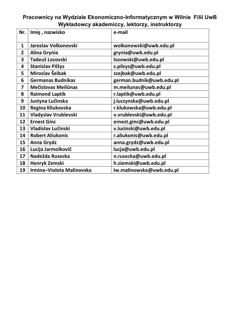 Pracownicy na Wydziale Ekonomiczno-Informatycznym w Wilnie Filii UwB Wykładowcy akademiccy, lektorzy, instruktorzy Nr. Imię , nazwisko e-mail 1 2 3 4 5 6 7 8 9 10 11 12 13 14 15 16 17 18 19 Jaroslav Volkonovski Alina Grynia Tadeuš Lozovski Stanislav Pilžys Miroslav Šeibak Germanas Budnikas Mečislovas Meilūnas Raimond Laptik Justyna Lučinska Regina Kliukovska Vladyslav Vrublevski Ernest Ginc Vladislav Lučinski Robert Aliukonis Anna Grydz Lucija Jarmolkovič Nadežda Rusecka Henryk Zemski Irmina–Violeta Malinovska [email protected] [email protected] [email protected] [email protected] [email protected] [email protected] [email protected] [email protected] [email protected] [email protected] [email protected] [email protected] [email protected] [email protected] [email protected] [email protected] [email protected] [email protected] [email protected]