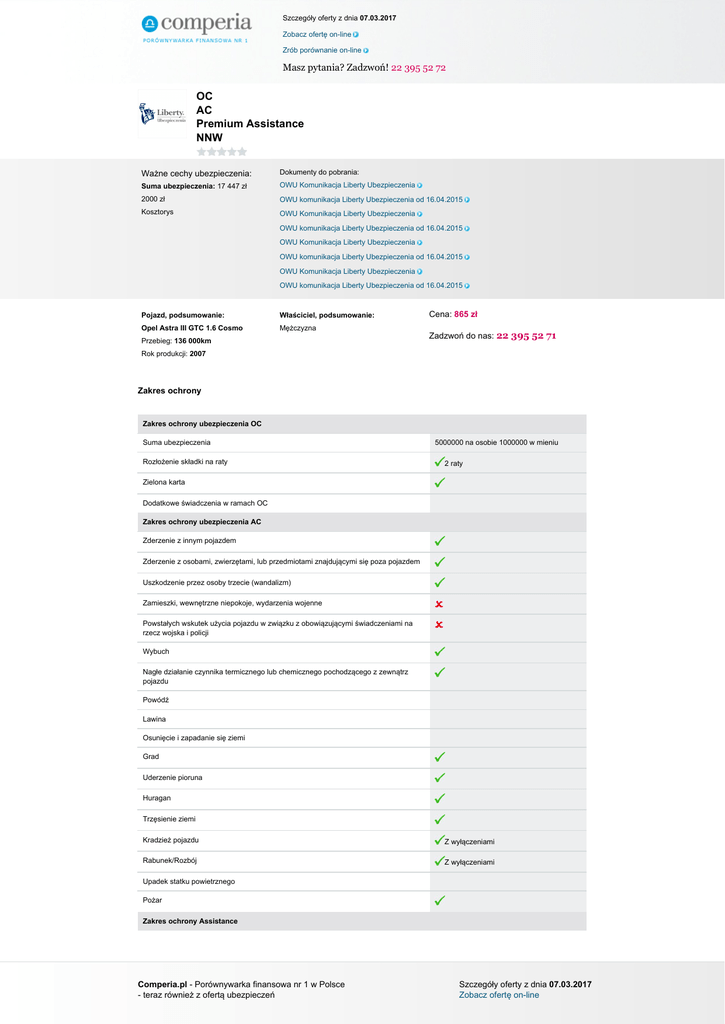 Szczegóły oferty z dnia 07.03.2017 Zobacz ofertę on-line Zrób porównanie on-line Masz pytania? Zadzwoń! 22 395 52 72 OC AC Premium Assistance NNW Ważne cechy ubezpieczenia: Dokumenty do pobrania: Suma ubezpieczenia: 17 447 zł OWU Komunikacja Liberty Ubezpieczenia 2000 zł OWU komunikacja Liberty Ubezpieczenia od 16.04.2015 Kosztorys OWU Komunikacja Liberty Ubezpieczenia OWU komunikacja Liberty Ubezpieczenia od 16.04.2015 OWU Komunikacja Liberty Ubezpieczenia OWU komunikacja Liberty Ubezpieczenia od 16.04.2015 OWU Komunikacja Liberty Ubezpieczenia OWU komunikacja Liberty Ubezpieczenia od 16.04.2015 Pojazd, podsumowanie: Właściciel, podsumowanie: Opel Astra III GTC 1.6 Cosmo Mężczyzna Przebieg: 136 000km Cena: 865 zł Zadzwoń do nas: 22 395 52 71 Rok produkcji: 2007 Zakres ochrony Zakres ochrony ubezpieczenia OC Suma ubezpieczenia Rozłożenie składki na raty 5000000 na osobie 1000000 w mieniu 2 raty Zielona karta Dodatkowe świadczenia w ramach OC Zakres ochrony ubezpieczenia AC Zderzenie z innym pojazdem Zderzenie z osobami, zwierzętami, lub przedmiotami znajdującymi się poza pojazdem Uszkodzenie przez osoby trzecie (wandalizm) Zamieszki, wewnętrzne niepokoje, wydarzenia wojenne Powstałych wskutek użycia pojazdu w związku z obowiązującymi świadczeniami na rzecz wojska i policji Wybuch Nagłe działanie czynnika termicznego lub chemicznego pochodzącego z zewnątrz pojazdu Powódź Lawina Osunięcie i zapadanie się ziemi Grad Uderzenie pioruna Huragan Trzęsienie ziemi Kradzież pojazdu Z wyłączeniami Rabunek/Rozbój Z wyłączeniami Upadek statku powietrznego Pożar Zakres ochrony Assistance Comperia.pl - Porównywarka finansowa nr 1 w Polsce - teraz również z ofertą ubezpieczeń Szczegóły oferty z dnia 07.03.2017 Zobacz ofertę on-line Szczegóły oferty z dnia 07.03.2017 Zobacz ofertę on-line Zrób porównanie on-line Masz pytania? Zadzwoń! 22 395 52 72 Suma ubezpieczenia Brak Zakres terytorialny Polska i Europa Wiek pojazdu do którego można wykupić ubezpieczenie Do 12 lat Rodzaj pojazdu na który można wykupić ubezpieczenie Samochody osobowe i ciężarowe Ograniczenia ze względu na sposób użytkowania pojazdu (np. taxi, nauka jazdy, rent a car) Nie są objęte ubezpieczeniem Opcje zawarcia Tylko z OC lub z OC i AC Usprawnienie pojazdu na miejscu zdarzenia Do wysokości 600 zł. (na terytorium Polski lub 500 euro (za granicą) oraz naprawa nie przekroczy 1 godziny Pomoc w razie awarii Pomoc w razie wypadku Limit odległości od miejsca zamieszkania 150 km od miejsca zdarzenia Miejsce holowania Do warsztatu lub do najbliższego miejsca czasowego postoju położonego w odległości nie większej niż 150 km od miejsca zdarzenia Samochód zastępczy Po wypadku i kradzieży (bez względu na odległość miejsca zdarzenia od miejsca zamieszkania), po awarii tylko w sytuacji gdy awaria nastąpiła w odległości co najmniej 50 km od miejsca zamieszkani Ubezpieczonego Złomowanie pojazdu Parkowanie pojazdu Do 4 dób do wysokości 50 zł. na terytorium Polski lub 30 euro za granicą . Świadczenie przysługuje tylko gdy unieruchomienie nastąpiło powyżej 50 km od miejsca zamieszkaniaUbezpieczonego Transport zastępczy/przewóz osób O ile unieruchomienie na skutek awarii lub wypadku miało miejsce w odległości 50 km od początku lub celu podróży Nocleg/zakwaterowanie Maksymalnie 1 doba, o ile unieruchomienie na skutek awarii lub wypadku miało miejsce w odległości 50 km od początku lub celu podróży Dodatkowe informacje Pomoc przy wymianie koła, holowanie pojazdu poszkodowanego, pomoc przy otwarciu pojazdu, dowóz paliwa lub pomoc w przypadku zatankowani niewłaściwego paliwa, pomoc w przypadku zagubienia lub uszkodzenia kluczyków, dostarczenie części zamiennych, odbiór pojazdu po naprawie, kierowca zastępczy, przewóz medyczny, opieka nad dziećmi dostawa leków Zakres ochrony NNW Suma ubezpieczenia Wypłata świadczenia w razie śmierci Śmierć ubezpieczonego, o ile śmierć była następstwem nieszczęśliwego wypadku i nastąpiła przed upływem 2 lat od dnia wypadku -100% świadczenia Wsiadanie i wysiadanie z pojazdu Załadowanie lub wyładowanie pojazdu Pożar, wybuch pojazdu Zatrzymanie, postój, naprawa pojazdu Podwójne świadczenie w przypadku 90% trwałego uszczerbku na zdrowiu Garażowanie pojazdu Terytorium ochrony Terytorium ochrony ubezpieczenia AC Comperia.pl - Porównywarka finansowa nr 1 w Polsce - teraz również z ofertą ubezpieczeń Szczegóły oferty z dnia 07.03.2017 Zobacz ofertę on-line Szczegóły oferty z dnia 07.03.2017 Zobacz ofertę on-line Zrób porównanie on-line Masz pytania? Zadzwoń! 22 395 52 72 Kraje Unii Europejskiej Algeria Albania Libia Maroko Mołdawia Białoruś Bez kradzieży i wandalizmu Rosja (część europejska) Czarnogóra Serbia Bośnia i Hercegowina Tunezja Iran Turcja Izrael Ukraina Bez kradzieży i wandalizmu Wyłączenia Wyłączenia ubezpieczenia AC Udział własny w szkodzie Wprowadzony ( jego udział ustala się na etapie zawierania umowy) Amortyzacja za części Do 3 lat 20%; 3-5 lat 35%; 5-8 lat 45%; 8 lat i więcej 55% Rodzaj stacji naprawczej (ze względu na metodę naprawy) Warsztaty nieautoryzowane Rodzaj używanych części do naprawy Części zamienne o porównywalnej jakości Okres eksploatacji pojazdu w jakim można wykupić polisę AutoCasco Do 12 lat Minimalna szkoda (franszyza integralna) 200 zł. Szkoda została spowodowana wskutek rażącego niedbalstwa Nie wypłaci Kierowanie pojazdem w stanie nietrzeźwości, po zażyciu alkoholu, środków odurzających, substancji psychotropowych, lub jego pochodnych Nie wypłaci Kierujący pojazdem nie posiadał uprawnień do prowadzenia pojazdu Nie wypłaci Sprawca zbiegł lub oddalił się z miejsca zdarzenia nie wypłaci Pojazd nie miał ważnego przeglądu technicznego lub nie jest dopuszczony do ruchu Nie wypłaci Przywłaszczenie pojazdu Nie wypłaci Kradzież wyposażenia dodatkowego Uszkodzenie wyposażenia dodatkowe
