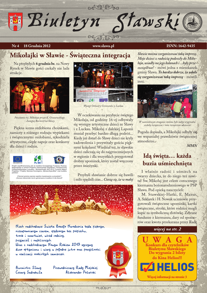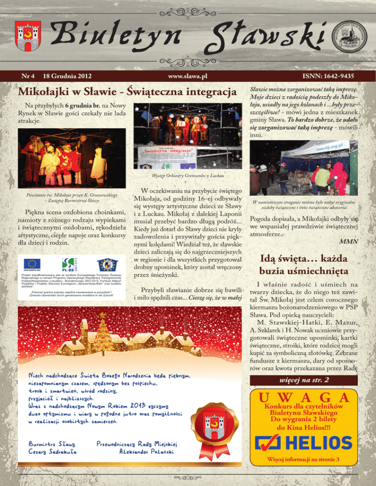 3/2012 Nr 4 Biuletyn Sławski Biuletyn Sławski 18 Grudnia 2012 www.slawa.pl Mikołajki w Sławie - Świąteczna integracja Na przybyłych 6 grudnia br. na Nowy Rynek w Sławie gości czekały nie lada atrakcje. 1 ISNN: 1642-9435 Sławie można zorganizować taką imprezę. Moje dzieci z radością podeszły do Mikołaja, usiadły na jego kolanach i ...były przeszczęśliwe! - mówi jedna z mieszkanek gminy Sława. To bardzo dobrze, że udało się zorganizować taką imprezę - mówili inni. Występ Orkiestry Grenzenlos z Luckau Powitanie św. Mikołaja przez K. Gruszewskiego - Zastępcę Burmistrza Sławy Piękna scena ozdobiona choinkami, namioty z różnego rodzaju wypiekami i świątecznymi ozdobami, rękodzieła artystyczne, ciepłe napoje oraz konkursy dla dzieci i rodzin. Projekt współfinansowany jest ze środków Europejskiego Funduszu Rozwoju Regionalnego w ramach Programu Operacyjnego Współpracy Transgranicznej Polska(Województwo Lubuskie) - Brandenburgia 2007-2013, Fundusz Małych Projektów i Projekty Sieciowe Euroregionu „Sprewa-Nysa-Bóbr” oraz budżetu państwa”. „Pokonać granice poprzez wspólne inwestowanie w przyszłość”/ „Grenzen überwinden durch gemeinsame investition In die Zukunft” W oczekiwaniu na przybycie świętego Mikołaja, od godziny 16-ej odbywały się występy artystyczne dzieci ze Sławy i z Luckau. Mikołaj z dalekiej Laponii musiał przebyć bardzo długą podróż... Kiedy już dotarł do Sławy dzieci nie kryły zadowolenia i przywitały gościa pięknymi kolędami! Wiedział też, że sławskie dzieci zaliczają się do najgrzeczniejszych w regionie i dla wszystkich przygotował drobny upominek, który został wręczony przez śnieżynki. Przybyli sławianie dobrze się bawili i miło spędzili czas... Cieszę się, że w małej W namiotowym straganie można było nabyć oryginalne ozdoby świąteczne i inne świąteczne akcesoria Pogoda dopisała, a Mikołajki odbyły się we wspaniałej prawdziwie świątecznej atmosferze. MMN Idą święta… każda buzia uśmiechnięta I właśnie radość i uśmiech na twarzy dziecka, że do niego też zawitał Św. Mikołaj jest celem corocznego kiermaszu bożonarodzeniowego w PSP Sława. Pod opieką nauczycieli: M. Stawskiej-Hatki, E. Mazur, A. Szklarek i H. Nowak uczniowie przygotowali świąteczne upominki, kartki świąteczne, stroiki, które rodzice mogli kupić za symboliczną złotówkę. Zebrane fundusze z kiermaszu, dary od sponsorów oraz kwota przekazana przez Radę więcej na str. 2 UKonkurs W dlaAczytelników G A Biuletynu Sławskiego Do wygrania 2 bilety do Kina Helios!!! Więcej informacji na stronie 3 Biuletyn Sławski 2 50-lecie Zespołu Szkół Ponadgimnazjalnych w Sławie Dnia 16 listopada br. odbyła się uroczystość z okazji 50-lecia istnienia Zespołu Szkół Ponadgimnazjalnych w Sławie. Wśród zaproszonych gości było kilku naszych znamienitych absolwentów, m.in. Burmistrz Sławy - Cezary Sadrakuła, Zastępca Burmistrza - Krzysztof Gruszewski, Starosta powiatu wschowskiego - Marek Boryczka. Ponadto gościliśmy dyrektorów placówek oświatowych z terenu gminy Sława oraz byłych pracowników ZSP. Program artystyczny przygotowany przez Urszulę Drożdżyńską Uroczystość była okazją do podziękowań za współpracę i pomoc placówce K. Gruszewski, C. Sadrakuła, E. Boks Podczas uroczystości padło wiele ciepłych słów i życzeń dalszej owocnej pracy. Była to chwila wspomnień, wzruszeń. Zaproszeni goście wspominali bardzo 3/2012 dokończenie ze str. 1 Kiermasz w PSP Sława Zebrane fundusze zostaną przekazane najbardziej potrzebującym uczniom ciepło szkołę, wielokrotnie powtarzali, że czas spędzony w tej placówce to bardzo ważny okres w ich życiu, który miał wpływ na ich dalszy rozwój. Rodziców pomogą przygotować paczki dla najbardziej potrzebujących uczniów naszej szkoły. Wszystkim ofiarodawcom serdecznie dziękujemy za okazane serce. Joanna Adamczewska M. Stawska-Hatka, E. Mazur BURMISTRZ SŁAWY przyjmuje: w poniedziałki w godz. 14.00 - 16.00 PRZEWODNICZĄCY RADY MIEJSKIEJ przyjmuje: w poniedziałki w godz. 8.00 - 12.00 Godziny pracy URZĘDU MIEJSKIEGO W SŁAWIE od poniedziałku do piątku w godz. 7.30 - 15.30 tel. 68 355 83 10, e-mail: [email protected] 3/2012 Budownictwo i infrastruktura 1. Gmina Sława po rozstrzygnięciu przetargu nieograniczonego podpisała umowę na zimowe utrzymanie ulic i placów gminnych w mieście Sława oraz dróg gminnych zamiejskich w sezonach zimowych 2012/2013 i 2013/2014 z firmą MARSZYM - Zakład Budowlano-Transportowy Marcin Jęśkowiak z Brenna. Koszt całego zadania wyniesie 220.000,00 zł brutto. Więcej informacji o złożonych ofertach i ich cenach na stronie www.slawa.pl BIP. 2. Gmina Sława ogłosiła przetarg nieograniczony na zakup i sukcesywną dostawę węgla dla jednostek podległych Gminie w sezonie grzewczym 2012/2013. Po rozstrzygnięciu umowa została podpisana z firmą Handel Opałem Nawozami i Materiałami Budowlanymi Ewa Opiela ze Sławy. Koszt umowy to 267.714,42 zł brutto. Więcej informacji o złożonych ofertach i ich cenach na stronie www.slawa.pl BIP. 3. W dniu 29.10.2012 r. została podpisana umowa z Zakładem Instalacyjno-Budowlanym „DOMBUD” Damian Koppenhagen ze Sławy. Referat Techniczno-Inwestycyjny i Architektury /JK/ KONKURS Drodzy Czytelnicy! Ogłaszamy dla Was kolejny konkurs. Zróbcie ciekawe zdjęcie (miejsc, ludzi, zwierząt itp. - najlepiej na terenie gminy Sława) i prześlijcie je na adres redakcji Biuletynu Sławskiego: [email protected]. Na zdjęcia czekamy do 31 stycznia 2013 r. Spośród nasłanych prac wybierzemy 2 najciekawsze, a autorom przekażemy 2 bilety do Kina Helios. Redakcja Biuletyn Sławski Krzysztof Buczek Wiek: po 40 Miejsce urodzenia: Sława Żona: Ewa Dzieci: Mateusz i Miłosz Sołtys Krzysztof Buczek z żoną Ewą i synem Miłoszem Sołtys Radzynia to człowiek zawsze uśmiechnięty, energiczny, pracowity, dbający o sprawy