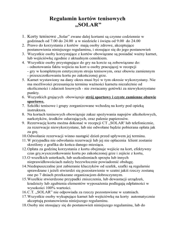 Regulamin kortów tenisowych „SOLAR” 1. Korty tenisowe „Solar” zwane dalej kortami są czynne codziennie w godzinach od 7.00 do 24.00 a w niedziele i święta od 9.00 do 24.00 2. Prawo do korzystania z kortów mają osoby zdrowe, akceptujące postanowienia niniejszego regulaminu, i stosujące się do jego postanowień 3. Wszystkie osoby korzystające z kortów obowiązane są posiadać waŜny karnet, lub wejściówkę zgodnie z aktualnym cennikiem. 4. Wszystkie osoby przystępujące do gry na korcie są zobowiązane do: - odnotowania faktu wejścia na kort u osoby pracującej w recepcji - gry w kompletnym estetycznym stroju tenisowym, oraz obuwiu zamiennym - przeszczotkowaniu kortu po zakończonej grze. 5. Karnet wystawiony na dany okres musi być w tym okresie wykorzystany. Nie ma moŜliwości przesunięcia terminu waŜności karnetu niezaleŜnie od okoliczności i zdarzeń losowych - nie zwracamy gotówki za niewykorzystane punkty. 6. Wszystkich grających obowiązuje strój sportowy i czyste zamienne obuwie sportowe. 7. Szkółki tenisowe i grupy zorganizowane wchodzą na korty pod opieką instruktora. 8. Na kortach tenisowych obowiązuje zakaz spoŜywania napojów alkoholowych, narkotyków, środków odurzających, oraz palenie papierosów. 9. Rezerwację kortu moŜna dokonać w recepcji CT „SOLAR' lub telefonicznie, za rezerwacje niewykorzystane, lub nie odwołane będzie pobierana opłata jak za grę. 10.Odwołanie rezerwacji winno nastąpić dzień przed upływem jej terminu. 11.W przypadku nie odwołania rezerwacji lub jej nie opłacenia klient zostanie skreślony z grafika do końca danego miesiąca. 12.Opłata za godzinę korzystania z kortu obejmuje wejście na kort, efektywny czas gry,wyszczotkowanie kortu po zakończonej grze i zejście z kortu, 13.O wszelkich usterkach, lub uszkodzeniach sprzętu lub innych nieprawidłowościach naleŜy bezzwłocznie powiadomić obsługę. 14.Niedopuszczalne jest zabieranie kluczyków od szafek, szafki są regularnie sprawdzane i jeŜeli stwierdzi się pozostawienie w szatni jakiś rzeczy zostaną one po 7 dniach przekazane organizacjom dobroczynnym. 15.Wszelkie stwierdzone przypadki zniszczenia, lub dewastacji urządzeń, kradzieŜy lub zgubienia elementów wyposaŜenia podlegają odpłatności w wysokości 100% wartości. 16.C.T. „SOLAR” nie odpowiada za rzeczy pozostawione w szatniach. 17.Wszystkie osoby wykupujące karnet lub wejściówkę na korty automatycznie akceptują postanowienia niniejszego regulaminu. 18.Osoby nie stosujący się do postanowień niniejszego regulaminu, lub do zaleceń obsługi , zachowujące się agresywnie lub wulgarnie mogą zostać z obiektu wyproszeni, a karnet zostanie anulowany. 19.Teren obiektu jest monitorowany w sposób ciągły, a nagrania z kamer mogą być podstawą do pociągnięcia do odpowiedzialności osób nie stosujących się do zasad niniejszego regulaminu. Monitoring prowadzony jest w sposób nie naruszający dóbr osobistych oraz godności uŜytkowników.
