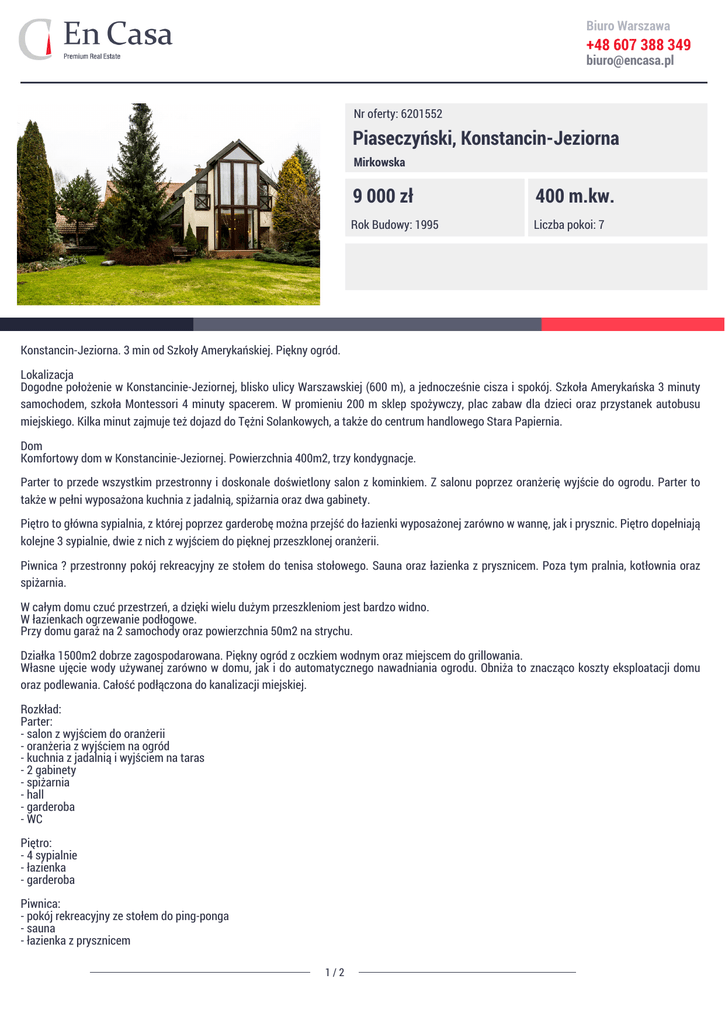 Biuro Warszawa +48 607 388 349 [email protected] Nr oferty: 6201552 Piaseczyński, Konstancin-Jeziorna Mirkowska 9 000 zł 400 m.kw. Rok Budowy: 1995 Liczba pokoi: 7 Konstancin-Jeziorna. 3 min od Szkoły Amerykańskiej. Piękny ogród. Lokalizacja Dogodne położenie w Konstancinie-Jeziornej, blisko ulicy Warszawskiej (600 m), a jednocześnie cisza i spokój. Szkoła Amerykańska 3 minuty samochodem, szkoła Montessori 4 minuty spacerem. W promieniu 200 m sklep spożywczy, plac zabaw dla dzieci oraz przystanek autobusu miejskiego. Kilka minut zajmuje też dojazd do Tężni Solankowych, a także do centrum handlowego Stara Papiernia. Dom Komfortowy dom w Konstancinie-Jeziornej. Powierzchnia 400m2, trzy kondygnacje. Parter to przede wszystkim przestronny i doskonale doświetlony salon z kominkiem. Z salonu poprzez oranżerię wyjście do ogrodu. Parter to także w pełni wyposażona kuchnia z jadalnią, spiżarnia oraz dwa gabinety. Piętro to główna sypialnia, z której poprzez garderobę można przejść do łazienki wyposażonej zarówno w wannę, jak i prysznic. Piętro dopełniają kolejne 3 sypialnie, dwie z nich z wyjściem do pięknej przeszklonej oranżerii. Piwnica ? przestronny pokój rekreacyjny ze stołem do tenisa stołowego. Sauna oraz łazienka z prysznicem. Poza tym pralnia, kotłownia oraz spiżarnia. W całym domu czuć przestrzeń, a dzięki wielu dużym przeszkleniom jest bardzo widno. W łazienkach ogrzewanie podłogowe. Przy domu garaż na 2 samochody oraz powierzchnia 50m2 na strychu. Działka 1500m2 dobrze zagospodarowana. Piękny ogród z oczkiem wodnym oraz miejscem do grillowania. Własne ujęcie wody używanej zarówno w domu, jak i do automatycznego nawadniania ogrodu. Obniża to znacząco koszty eksploatacji domu oraz podlewania. Całość podłączona do kanalizacji miejskiej. Rozkład: Parter: - salon z wyjściem do oranżerii - oranżeria z wyjściem na ogród - kuchnia z jadalnią i wyjściem na taras - 2 gabinety - spiżarnia - hall - garderoba - WC Piętro: - 4 sypialnie - łazienka - garderoba Piwnica: - pokój rekreacyjny ze stołem do ping-ponga - sauna - łazienka z prysznicem 1/2 Biuro Warszawa +48 607 388 349 [email protected] - pralnia - kotłownia - spiżarnia For more details, please call: Marcin Huflejt: +48 698 902 048 Piotr Wilczyński: +48 604 914 100 **********ENG********** Detached house in Konstancin, near the American School. Konstancin-Jeziorna. 3 minutes from the American School. Beautiful garden. Location Convenient location in Konstancin-Jeziorna, near Warszawska Street (600m), but at the same time in a quiet and peaceful area. American School 3 minutes by car, Montessori School 4-minute walk. Within 200m grocery store, playground for children and a city bus stop. A few minutes away is also health resort, and mall ?Stara Papiernia?. House Comfortable house in Konstancin-Jeziorna. Area of 400sqm, three storeys. On the ground floor first of all we have spacious and well-lit living room with fireplace. From the living room through an orangery entrance to the garden. On the ground floor is also a fully equipped kitchen with dining area, pantry and two offices. On the first floor we have the master bedroom, from where you can go, through wardrobe, to the bathroom equipped with both a bath and shower. First floor is completed by a further 3 bedrooms, two of them with access to the beautiful orangery. Basement - a spacious recreation room with table tennis. Sauna and a bathroom with a shower. Moreover we have laundry, boiler room and a storage room. The whole house very spacious, bright and sunny. The bathrooms have underfloor heating. Next to the house there is garage for 2 cars and the surface of 50sqm in the attic. For more details, please call: Marcin Huflejt: +48 698 902 048 Piotr Wilczyński: +48 604 914 100 Kontakt z agentem Marcin Huflejt Powyższa oferta nie stanowi oferty handlowej w rozumieniu art. 66 § 1 kodeksu cywilnego oraz innych właściwych przepisów prawnych. En Casa jest wyłącznym właścicielem zamieszczonych zdjęć i opisów. Kopiowanie ich w całości lub fragmentach jest zabronione zgodnie z ustawą z dnia 4 lutego 1994 r. o prawie autorskim i prawach pokrewnych. +48 698 902 048 [email protected] 2/2 Powered by TCPDF (www.tcpdf.org)