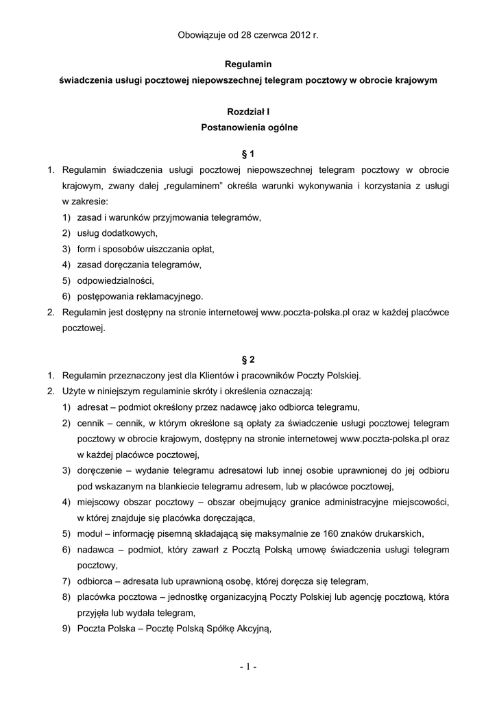 Obowiązuje od 28 czerwca 2012 r. Regulamin świadczenia usługi pocztowej niepowszechnej telegram pocztowy w obrocie krajowym Rozdział I Postanowienia ogólne §1 1. Regulamin świadczenia usługi pocztowej niepowszechnej telegram pocztowy w obrocie krajowym, zwany dalej „regulaminem” określa warunki wykonywania i korzystania z usługi w zakresie: 1) zasad i warunków przyjmowania telegramów, 2) usług dodatkowych, 3) form i sposobów uiszczania opłat, 4) zasad doręczania telegramów, 5) odpowiedzialności, 6) postępowania reklamacyjnego. 2. Regulamin jest dostępny na stronie internetowej www.poczta-polska.pl oraz w każdej placówce pocztowej. §2 1. Regulamin przeznaczony jest dla Klientów i pracowników Poczty Polskiej. 2. Użyte w niniejszym regulaminie skróty i określenia oznaczają: 1) adresat – podmiot określony przez nadawcę jako odbiorca telegramu, 2) cennik – cennik, w którym określone są opłaty za świadczenie usługi pocztowej telegram pocztowy w obrocie krajowym, dostępny na stronie internetowej www.poczta-polska.pl oraz w każdej placówce pocztowej, 3) doręczenie – wydanie telegramu adresatowi lub innej osobie uprawnionej do jej odbioru pod wskazanym na blankiecie telegramu adresem, lub w placówce pocztowej, 4) miejscowy obszar pocztowy – obszar obejmujący granice administracyjne miejscowości, w której znajduje się placówka doręczająca, 5) moduł – informację pisemną składającą się maksymalnie ze 160 znaków drukarskich, 6) nadawca – podmiot, który zawarł z Pocztą Polską umowę świadczenia usługi telegram pocztowy, 7) odbiorca – adresata lub uprawnioną osobę, której doręcza się telegram, 8) placówka pocztowa – jednostkę organizacyjną Poczty Polskiej lub agencję pocztową, która przyjęła lub wydała telegram, 9) Poczta Polska – Pocztę Polską Spółkę Akcyjną, -1- 10) pozamiejscowy obszar pocztowy – teren obsługiwany przez określoną pocztową placówkę doręczającą, z którego wyłączony jest miejscowy obszar pocztowy, 11) telegram pocztowy – zwany dalej telegramem, usługę polegającą na przyjęciu informacji pisemnej albo elektronicznej przekazanej za pośrednictwem strony www.poczta-polska.pl składającej się z jednego lub wielu modułów, a następnie przekazywaną przy wykorzystaniu sieci teleinformatycznych i doręczaną drogą pocztową. §3 1. Telegram można nadać od poniedziałku do piątku w każdej placówce pocztowej. 2. Telegram doręcza się od poniedziałku do piątku w godzinach pracy placówek pocztowych doręczających telegramy. 3. Wykaz druków, formularzy, blankietów i nalepek, o których mowa w niniejszym regulaminie, których wzory są dostępne na stronie internetowej www.poczta-polska.pl oraz w placówkach pocztowych, stanowi załącznik nr 1 A §4 Umowę o świadczenie usługi uważa się za zawartą z chwilą przyjęcia telegramu przez placówkę pocztową oraz wydania nadawcy dowodu nadania, z zastrzeżeniem § 5 ust. 2. Rozdział II Zasady i warunki przyjmowania telegramów pocztowych §5 1. Tekst nadawanego telegramu może być naniesiony: 1) na druku pocztowym (PP S.A. nr 74), 2) na druku własnego nakładu, pod warunkiem zgodności układu i zawartości merytorycznej z drukiem nakładu pocztowego, 3) za pośrednictwem strony www.poczta-polska.pl 2. Nadawanie telegramu w sposób określony w ust. 1 pkt 2 i 3 wymaga zawarcia pisemnej umowy z Pocztą Polską. 3. Nadawca może zlecić doręczenie telegramu na blankiecie ozdobnym (bn35, bn36, bn37, bn38, bn39). 4. Treść telegramu powinna być napisana czytelnie w języku polskim, w sposób zapewniający trwałość zapisanego tekstu z zachowaniem odstępów pomiędzy wyrazami. 5. W telegramie nie mogą być użyte treści naruszające prawo. 6. Wypełniony blankiet nadawczy musi zawierać dane adresowe adresata i nadawcy. W przypadku telegramu nadanego na poste restante, adres powinien zawierać, poza danymi -2- identyfikującymi adresata, kod pocztowy i numer placówki pocztowej, w której telegram ma być wydany. Dane adresowe nie mogą zamiast nazwiska adresata zawierać pseudonimu lub innych umówionych znaków. 7. W przypadku niespełnienia warunków określonych w ust. 4 – 6, placówka nadawcza odmawia przyjęcia zlecenia. §6 1. Nadawca telegramu może żądać jego wycofania lub dokonania zmiany w adresie. Żądanie wycofania nadanego telegramu składa się na piśmie w placówce pocztowej nadawczej. Żądający powinien dołączyć dowód nadania telegramu. Żądanie będzie spełnione, o ile ze względów technicznych będzie możliwość wycofania telegramu. 2. Żądanie zmiany w adresie telegramu może być zgłoszone przez nadawcę tylko przed jego wysłaniem z placówki pocztowej nadawczej. 3. Żądane zmiany w adresie telegramu powinny być potwierdzone na blankiecie nadawczym podpisem nadawcy. 4. Blankiet nadawczy wycofanego telegramu pozostaje w aktach placówki pocztowej nadawczej. 5. Nadawca telegramu może żądać wydania mu potrzebnej ilości odpisów dowodów nadania telegramu na podstawie przedstawionego oryginału dowodu nadania telegramu. Wydanie odpisu dowodu nadania telegramu może nastąpić nie później niż w okresie 12 miesięcy licząc od dnia jego nadania. 6. Pracownicy placówek pocztowych udzielają nadawcom i adresatom telegramów informacji, wynikających z prowadzonej dokumentacji pocztowej. Udzielenie osobom trzecim informacji, dotyczących telegramów jest dozwolone wyłącznie w przypadkach określonych przez odrębne przepisy. Rozdział III Usługi dodatkowe §7 W ramach usługi mogą być realizowane następujące usługi dodatkowe: 1) potwierdzenie doręczenia telegramu (PD) - usługa polegająca na poinformowaniu nadawcy telefonicznie, faksem lub pocztą elektroniczną o dacie i godzinie doręczenia telegramu; jeśli telegram został doręczony osobie uprawnionej, nie będącej adresatem, wówczas nadawcę powiadamia się także o imieniu i nazwisku odbio