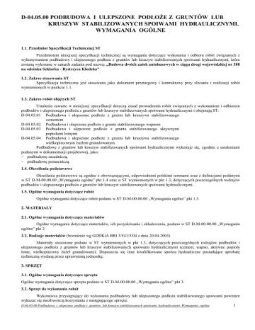 D-04.05.00 PODBUDOWA I ULEPSZONE PODŁOŻE Z GRUNTÓW LUB KRUSZYW STABILIZOWANYCH SPOIWAMI HYDRAULICZNYMI. WYMAGANIA OGÓLNE 1.1. Przedmiot Specyfikacji Technicznej ST Przedmiotem niniejszej specyfikacji technicznej są wymagania dotyczące wykonania i odbioru robót związanych z wykonywaniem podbudowy i ulepszonego podłoża z gruntów lub kruszyw stabilizowanych spoiwami hydraulicznymi, które zostaną wykonane w ramach zadania pod nazwą: „Budowa dwóch zatok autobusowych w ciągu drogi wojewódzkiej nr 388 na odcinku Szklarka - Bystrzyca Kłodzka". 1.2. Zakres stosowania ST Specyfikacja techniczna jest stosowana jako dokument przetargowy i kontraktowy przy zlecaniu i realizacji robót wymienionych w punkcie 1.1. 1.3. Zakres robót objętych ST Ustalenia zawarte w niniejszej specyfikacji dotyczą zasad prowadzenia robót związanych z wykonaniem i odbiorem podbudów i ulepszonego podłoża z gruntów lub kruszyw stabilizowanych spoiwami hydraulicznymi i obejmują ST: D-04.05.01 Podbudowa i ulepszone podłoże z gruntu lub kruszywa stabilizowanego cementem D-04.05.02 Podbudowa i ulepszone podłoże z gruntu stabilizowanego wapnem D-04.05.03 Podbudowa i ulepszone podłoże z gruntu stabilizowanego aktywnymi popiołami lotnymi D-04.05.04 Podbudowa i ulepszone podłoże z gruntu lub kruszywa stabilizowanego wielkopiecowym żużlem granulowanym. Podbudowę z gruntów lub kruszyw stabilizowanych spoiwami hydraulicznymi wykonuje się, zgodnie z ustaleniami podanymi w dokumentacji projektowej, jako: − podbudowę zasadniczą, − podbudowę pomocniczą. 1.4. Określenia podstawowe Określenia podstawowe są zgodne z obowiązującymi, odpowiednimi polskimi normami oraz z definicjami podanymi w ST D-M-00.00.00 „Wymagania ogólne” pkt 1.4 oraz w ST wymienionych w pkt 1.3, dotyczących poszczególnych rodzajów podbudów i ulepszonego podłoża z gruntów lub kruszyw stabilizowanych spoiwami hydraulicznymi. 1.5. Ogólne wymagania dotyczące robót Ogólne wymagania dotyczące robót podano w ST D-M-00.00.00 „Wymagania ogólne” pkt 1.5. 2. MATERIAŁY 2.1. Ogólne wymagania dotyczące materiałów Ogólne wymagania dotyczące materiałów, ich pozyskiwania i składowania, podano w ST D-M-00.00.00 „Wymagania ogólne” pkt 2. 2.2. Rodzaje materiałów (brzmienie wg GDDKiA BRI 3/541/5/04 z dnia 20.04.2003) Materiały stosowane podano w ST wymienionych w pkt 1.3, dotyczących poszczególnych rodzajów podbudów i ulepszonego podłoża z gruntów lub kruszyw stabilizowanych spoiwami hydraulicznymi (cement, wapno, aktywne popioły lotne, wielkopiecowy żużel granulowany). Dopuszcza się inne kwalifikowane spoiwa hydrauliczne posiadające aprobatę techniczną wydaną przez uprawnioną jednostkę. 3. SPRZĘT 3.1. Ogólne wymagania dotyczące sprzętu Ogólne wymagania dotyczące sprzętu podano w ST D-M-00.00.00 „Wymagania ogólne” pkt 3. 3.2. Sprzęt do wykonania robót Wykonawca przystępujący do wykonania podbudowy lub ulepszonego podłoża stabilizowanego spoiwami powinien wykazać się możliwością korzystania z następującego sprzętu: D-04.05.00 Podbudowa i ulepszone podłoże z gruntów lub kruszyw stabilizowanych spoiwami hydraulicznymi. Wymagania ogólne 1 a) w przypadku wytwarzania mieszanek kruszywowo-spoiwowych w mieszarkach: − mieszarek stacjonarnych, − układarek lub równiarek do rozkładania mieszanki, − walców ogumionych i stalowych wibracyjnych lub statycznych do zagęszczania, − zagęszczarek płytowych, ubijaków mechanicznych lub małych walców wibracyjnych do zagęszczania w miejscach trudnodostępnych, b) w przypadku wytwarzania mieszanek gruntowo-spoiwowych na miejscu: − mieszarek jedno lub wielowirnikowych do wymieszania gruntu ze spoiwami, − spycharek, równiarek lub sprzętu rolniczego (pługi, brony, kultywatory) do spulchniania gruntu, − ciężkich szablonów do wyprofilowania warstwy, − rozsypywarek wyposażonych w osłony przeciwpylne i szczeliny o regulowanej szerokości do rozsypywania spoiw, − przewoźnych zbiorników na wodę, wyposażonych w urządzenia do równomiernego i kontrolowanego dozowania wody, − walców ogumionych i stalowych wibracyjnych lub statycznych do zagęszczania, − zagęszczarek płytowych, ubijaków mechanicznych lub małych walców wibracyjnych do zagęszczania w miejscach trudnodostępnych. 4. TRANSPORT 4.1. Ogólne wymagania dotyczące transportu Ogólne wymagania dotyczące transportu podano w ST D-M-00.00.00 „Wymagania ogólne” pkt 4. 4.2. Transport materiałów Transport cementu powinien odbywać się zgodnie z BN-88/6731-08 [19]. Transport wapna powinien odbywać się zgodnie z PN-B-30020 [12]. Transport popiołów lotnych powinien odbywać się zgodnie z PN-S-96035 [18]. Żużel wielkopiecowy granulowany można przewozić dowolnymi środkami transportu w sposób zabezpieczony przed zanieczyszczeniem i zawilgoceniem. Mieszankę kruszywowo-spoiwową można przewozić dowolnymi środkami transportu, w sposób zabezpieczony przed zanieczyszczeniem, rozsegregowaniem i wysuszeniem lub nadmiernym zawilgoceniem. 5. WYKONANIE ROBÓT 5.1. Ogólne zasady wykonania robót Ogólne zasady wykonania robót podano w ST D-M-00.00.00 „Wymagania ogólne” pkt 5. 5.2. Przygotowanie podłoża Podłoże gruntowe powinno być przygotowane zgodnie z wymaganiami określonymi w ST D-04.01.01 „Koryto wraz z profilowaniem i zagęszczeniem podłoża” i ST D-02.00.00 „Roboty ziemne”. Paliki lub szpilki do prawidłowego ukształtowania podbudowy i ulepszonego podłoża powinny być wcześniej przygotowane. Paliki lub szpilki powinny być ustawione w osi drogi i w rzędach równoległych do osi drogi, lub w inny sposób zaakceptowany przez Inżyniera. Rozmieszczenie palików lub szpilek powinno umożliwiać naciągnięcie sznurków lub linek do wytyczenia robót w odstępach nie większych niż co 10 m. Jeżeli warstwa mieszanki gruntu lub kruszywa ze spoiwami hydraulicznymi ma być układana w prowadnicach, to