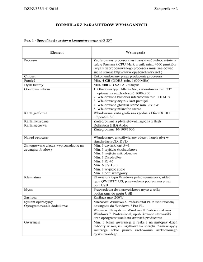 Załącznik nr 3 DZPZ/333/141/2015 FORMULARZ PARAMETRÓW WYMAGANYCH Poz. 1 - Specyfikacja zestawu komputerowego AiO 23” Element Procesor Chipset Pamięć Dysk twardy Obudowa i ekran Karta graficzna Karta muzyczna Karta sieciowa Napęd optyczny Zintegrowane złącza wyprowadzone na zewnątrz obudowy Klawiatura Mysz Zasilacz System operacyjny Oprogramowanie dodatkowe Gwarancja Wymagania Zaoferowany procesor musi uzyskiwać jednocześnie w teście Passmark CPU Mark wynik min.: 4600 punktów (wynik zaproponowanego procesora musi znajdować się na stronie http://www.cpubenchmark.net ) Rekomendowany przez producenta procesora Min. 4 GB (DDR3 min. 1600 MHz) Min. 500 GB SATA 7200rpm 1. Obudowa typu All-in-One, z monitorem min. 23” optymalna rozdzielczość 1600x900 2. Wbudowana kamerka internetowa min. 2.0 MPx. 3. Wbudowany czytnik kart pamięci 4. Wbudowane głośniki stereo min. 2 x 2W 5. Wbudowany mikrofon stereo Wbudowana karta graficzna zgodna z DirectX 10.1 i OpenGL 3.0 Zintegrowana z płytą główną, zgodna z High Definition (HD) Audio Zintegrowana 10/100/1000. Wbudowany, umożliwiający odczyt i zapis płyt w standardach CD, DVD Min. 1 czytnik kart 5w1 Min. 1 wyjście słuchawkowe Min. 1 wejście mikrofonowe Min. 1 DisplayPort Min. 1 RJ-45 Min. 6 USB 3.0 Min. 1 wyjście audio Min. 1 port szeregowy Klawiatura typu Windows pełnowymiarowa, układ typu QWERTY US, przewodowa podłączana przez port USB Przewodowa dwu przyciskowa mysz z rolką podłączana do portu USB Zasilacz max.200W Microsoft Windows 8 Professional PL z możliwością downgadu do Windows 7 Pro PL Wsparcie dla systemu Windows 8 Professional oraz Windows 7 Professional, opublikowane sterowniki oraz oprogramowanie na stronach producenta. Min. 3 letnia gwarancja z reakcją na następny dzień roboczy w miejscu użytkowania sprzętu. Zamawiający zastrzega sobie prawo zachowania uszkodzonego dysku twardego. Poz. 2 - Specyfikacja zestawu komputerowego min. 19,5” Element Procesor Chipset Pamięć Dysk twardy Obudowa i ekran Karta graficzna Karta muzyczna Karta sieciowa Napęd optyczny Zintegrowane złącza wyprowadzone na zewnątrz obudowy Klawiatura Mysz Zasilacz System operacyjny Oprogramowanie dodatkowe Gwarancja Wymagania Zaoferowany procesor musi uzyskiwać jednocześnie w teście Passmark CPU Mark wynik min.: 4200 punktów (wynik zaproponowanego procesora musi znajdować się na stronie http://www.cpubenchmark.net ) Rekomendowany przez producenta procesora Min. 4 GB (DDR3 min. 1600 MHz) Min. 500 GB SATA 7200rpm 1. Obudowa typu All-in-One, z monitorem min. 19,5” optymalna rozdzielczość 1600x900 2. Wbudowana kamerka internetowa min. 1.0 MPx. 3. Wbudowany czytnik kart pamięci 4. Wbudowane głośniki stereo min. 2 x 2W 5. Wbudowany mikrofon stereo Wbudowana karta graficzna zgodna z DirectX 10.1 i OpenGL 3.0 Zintegrowana z płytą główną, zgodna z High Definition (HD) Audio Zintegrowana 10/100/1000. Wbudowany, umożliwiający odczyt i zapis płyt w standardach CD, DVD Min. 1 czytnik kart 5w1 Min. 1 wyjście słuchawkowe Min. 1 wejście mikrofonowe Min. 1 DisplayPort Min. 1 RJ-45 Min. 2 USB 3.0 Min. 4 USB 2.0 Min. 1 wyjście audio Min. 1 port szeregowy Klawiatura typu Windows pełnowymiarowa, układ typu QWERTY US, przewodowa podłączana przez port USB Przewodowa dwu przyciskowa mysz z rolką podłączana do portu USB Zasilacz max.120W Microsoft Windows 8 Professional PL z możliwością downgadu do Windows 7 Pro PL Wsparcie dla systemu Windows 8 Professional oraz Windows 7 Professional, opublikowane sterowniki oraz oprogramowanie na stronach producenta. Min. 3 letnia gwarancja z reakcją na następny dzień roboczy w miejscu użytkowania sprzętu. Zamawiający zastrzega sobie prawo zachowania uszkodzonego dysku twardego. Poz. 3 - Specyfikacja drukarki laserowej wielofunkcyjnej – modyfikacja z dn. 25.09.2015 r. Główne cechy Drukuje, skanuje, kopiuje i faksuje Drukarka Szybkość drukowania A4: do 33 str./min Czas pierwszego wydruku poniżej 5 sekund Czas rozgrzewania do 60 sekund od włączenia zasilania, do 25 sekund z trybu oszczędzania energii Szybkość procesora min. 330MHz Skanowanie Rozdzielczość skanowania 600dpi Szybkość skanowania Do 37,5 str./min w czerni; do 10 str./min w kolorze Podawanie dokumentów 50-arkuszowy automatyczny podajnik (RADF), skaner płaski Format M-TIFF, JPEG, XPS, PDF, Secure PDF + (BMP, PCX, GIF, TGA, PNG, WMF, EMF from Actkey Utility) Książka adresowa LDAP, 100 adresów email, 20 grup adresów Skanowanie do FTP, HTTP, USB, E-mail, TWAIN, CIFS Kopiowanie Czas wykonania pierwszej kopii poniżej 11 sekund Szybkość kopiowania do 33 kopii/min Rozdzielczość kopiowania 600 x 600dpi Zmniejszanie/powiększanie 25-400% Maksymalna liczba kopii 99 Fax Złącza RJ11 x 2 (Line/Tel), PSTN, PBX Line Fax speed do 33.6kbps, do 2 sekund/str. Szybkie wybieranie 16 przycisków szybkiego wybierania 100 numerów Lista rozgłaszania Maksimum 100 Panel operacyjny Panel LCD Klawiatura 12 klawiszy alfanumerycznych, 4 główne przyciski funkcyjne (kopiowanie, skanowanie, drukowanie, faksowanie), klawisze uruchom kolor i mono, status, konfiguracja, pomoc, szybkie uruchamianie i zmiana rejestru, anulowanie, zatrzymywanie, tryb oszczędności energii, resetowanie /wylogowanie Interfejs i oprogramowanie Interfejs 10/100 TX Ethernet, USB 2.0 Device IF, USB 2.0 Host IF Języki druku PCL6 (XL3.0), PCL5e, PostScript 3 (emulation) Sieć i protokoły: Wszystkie główne protokoły sieciowe obsługiwane przez kartę Ethernet z wewnętrznym serwerem internetowym dla drukarki oraz konfiguracją i zarządzaniem sieciowym. TCP/IPv4&v6, SMTP, POP3, HTTP, SNMPv1&v3, DHCP, DNS, LPR, Port9100, BOOTP, ARP, FTP, CIFS, LDAP, SLP, Bonjour, NetWare, EtherTalk, NetBEUI, LLTD, Web Services on Devices; MB471w: Wireless LAN Protocol (IEEE802.11b, IEEE802.11g, IEEE802.11n, Infrastructure Mode, WEP, WPA(TKIP), WPA2(AES) Kompatybilność z systemami operacyjnymi Windows XP (32-bit & 64-bit) / Server 2003 (32-bit & 64-bit
