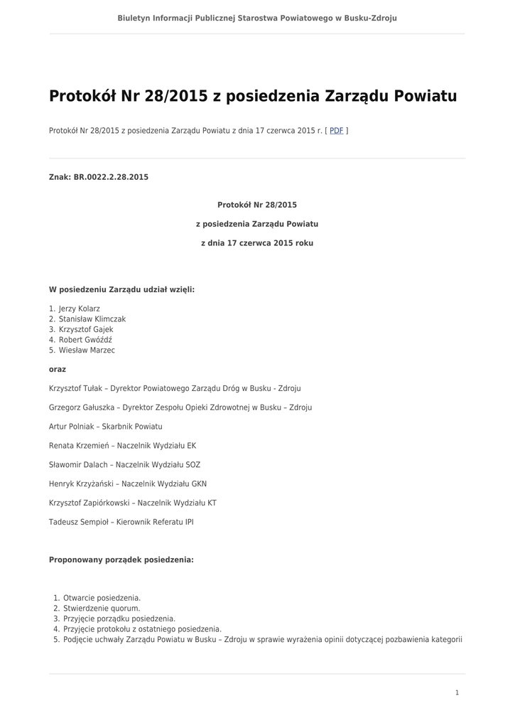 Protokół Nr 28/2015 z posiedzenia Zarządu Powiatu