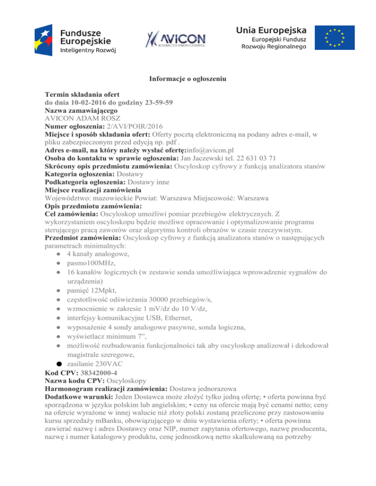Informacje o ogłoszeniu Termin składania ofert do dnia 10-02-2016 do godziny 23-59-59 Nazwa zamawiającego AVICON ADAM ROSZ Numer ogłoszenia: 2/AVI/POIR/2016 Miejsce i sposób składania ofert: Oferty pocztą elektroniczną na podany adres e-mail, w pliku zabezpieczonym przed edycją np. pdf . Adres e-mail, na który należy wysłać ofertę:[email protected] Osoba do kontaktu w sprawie ogłoszenia: Jan Jaczewski tel. 22 631 03 71 Skrócony opis przedmiotu zamówienia: Oscyloskop cyfrowy z funkcją analizatora stanów Kategoria ogłoszenia: Dostawy Podkategoria ogłoszenia: Dostawy inne Miejsce realizacji zamówienia Województwo: mazowieckie Powiat: Warszawa Miejscowość: Warszawa Opis przedmiotu zamówienia: Cel zamówienia: Oscyloskop umożliwi pomiar przebiegów elektrycznych. Z wykorzystaniem oscyloskopu będzie możliwe opracowanie i optymalizowanie programu sterującego pracą zaworów oraz algorytmu kontroli obrazów w czasie rzeczywistym. Przedmiot zamówienia: Oscyloskop cyfrowy z funkcją analizatora stanów o następujących parametrach minimalnych: ● 4 kanały analogowe, ● pasmo100MHz, ● 16 kanałów logicznych (w zestawie sonda umożliwiająca wprowadzenie sygnałów do urządzenia) ● pamięć 12Mpkt, ● częstotliwość odświeżania 30000 przebiegów/s, ● wzmocnienie w zakresie 1 mV/dz do 10 V/dz, ● interfejsy komunikacyjne USB, Ethernet, ● wyposażenie 4 sondy analogowe pasywne, sonda logiczna, ● wyświetlacz minimum 7”, ● możliwość rozbudowania funkcjonalności tak aby oscyloskop analizował i dekodował magistrale szeregowe, ● zasilanie 230VAC Kod CPV: 38342000-4 Nazwa kodu CPV: Oscyloskopy Harmonogram realizacji zamówienia: Dostawa jednorazowa Dodatkowe warunki: Jeden Dostawca może złożyć tylko jedną ofertę; • oferta powinna być sporządzona w języku polskim lub angielskim; • ceny na ofercie mają być cenami netto; ceny na ofercie wyrażone w innej walucie niż złoty polski zostaną przeliczone przy zastosowaniu kursu sprzedaży mBanku, obowiązującego w dniu wystawienia oferty; • oferta powinna zawierać nazwę i adres Dostawcy oraz NIP, numer zapytania ofertowego, nazwę producenta, nazwę i numer katalogowy produktu, cenę jednostkową netto skalkulowaną na potrzeby zapytania ofertowego, termin dostawy, termin płatności. • Kupujący nie dopuszcza składania ofert częściowych. Termin związania z ofertą wynosi nie mniej niż 30 dni. Bieg terminu rozpoczyna się wraz z upływem terminu składania ofert. Oferta pozostanie niezmieniona przez cały okres realizacji zamówienia. Dostawca ponosi wszystkie koszty związane z przygotowaniem i złożeniem oferty. Kupujący nie przewiduje zwrotu kosztów udziału w postępowaniu. Dostawca zapłaci Zamawiającemu kary umowne: • za opóźnienie w terminie dostawy przedmiotu zamówienia, za każdy rozpoczęty dzień opóźnienia, o ile opóźnienie nie wynika z winy Kupującego, • Dostawca wyraża zgodę na potrącenie kwoty kar umownych bezpośrednio przy zapłacie faktury VAT dotyczącej realizacji dostawy. Oferty złożone po terminie nie będą brane pod uwagę. Lista dokumentów/oświadczeń wymaganych od Wykonawcy Podmioty działające przez reprezentantów nieujawnionych w KRS lub CEiDG zobowiązane są również załączyć do oferty dokumenty wskazujące na umocowanie osób podpisanych pod treścią oferty. 2. Oświadczenie o braku powiązań osobowych i kapitałowych – według wzoru stanowiącego załącznik do niniejszego ogłoszenia (załącznik – Oświadczenie) Kryteria oceny i opis sposobu przyznawania punktacji: Kryteria oceny ofert: cena – 90% , czas dostawy – 10%. Do porównania ofert będzie brana cena netto. Za najkorzystniejszą zostanie uznana oferta, która uzyska najwyższą liczbą punktów, obliczoną według poniższego wzoru: C = Cena najtańszej oferty/Oferowana cena x 90pkt. D = Najkrótszy oferowany termin dostawy/Oferowany czas dostawy x 10pkt. Całkowita liczba punktów, jaką otrzyma dana oferta, zostanie obliczona wg poniższego wzoru: L = C + D gdzie: L – całkowita liczba punktów, C – punkty uzyskane w kryterium „Cena”, D – punkty uzyskane w kryterium „Czas dostawy”, Wykluczenia Z udziału w postępowaniu wykluczone są podmioty powiązane osobowo i kapitałowo z Zamawiającym. Przez powiązania kapitałowe lub osobowe rozumie się wzajemne powiązania między Zamawiającym lub osobami upoważnionymi do zaciągania zobowiązań w imieniu zamawiającego lub osobami wykonującymi w imieniu zamawiającego czynności związane z przygotowaniem i przeprowadzaniem procedury wyboru wykonawcy, a Wykonawcą, polegające w szczególności na: 1) uczestniczeniu w spółce, jako wspólnik spółki cywilnej lub spółki osobowej, 2) posiadaniu co najmniej 10 % udziałów lub akcji, 3) pełnieniu funkcji członka organu nadzorczego lub zarządzającego, prokurenta, pełnomocnika, 4) pozostawaniu w związku małżeńskim, w stosunku pokrewieństwa lub powinowactwa w linii prostej, pokrewieństwa drugiego stopnia lub powinowactwa drugiego stopnia w linii bocznej lub w stosunku przysposobienia, opieki lub kurateli. Każdy z oferentów, odpowiadając na zapytanie ofertowe, powinien złożyć Oświadczenie o braku powiązań osobowych i kapitałowych – według wzoru stanowiącego załącznik nr 1 do niniejszego ogłoszenia. Zamawiający (beneficjent) Nazwa: AVICON ADAM ROSZ NIP: 1130187575 Tytuł projektu Maszyna do sortowania z wykorzystaniem techniki wizji maszynowej 2D/3D Numer projektu: POIR.01.01.01-00-0392/15-00