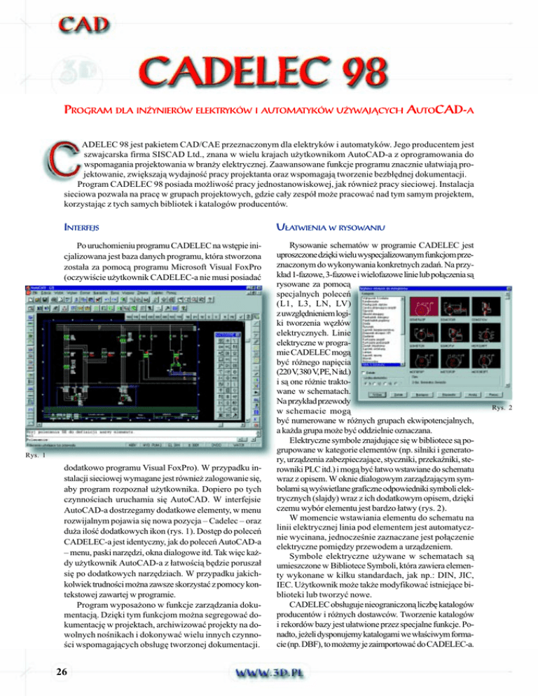 PROGRAM DLA IN¯YNIERÓW ELEKTRYKÓW I AUTOMATYKÓW U¯YWAJ¥CYCH AUTOCAD-A ADELEC 98 jest pakietem CAD/CAE przeznaczonym dla elektryków i automatyków. Jego producentem jest szwajcarska firma SISCAD Ltd., znana w wielu krajach u¿ytkownikom AutoCAD-a z oprogramowania do wspomagania projektowania w bran¿y elektrycznej. Zaawansowane funkcje programu znacznie u³atwiaj¹ projektowanie, zwiêkszaj¹ wydajnoæ pracy projektanta oraz wspomagaj¹ tworzenie bezb³êdnej dokumentacji. Program CADELEC 98 posiada mo¿liwoæ pracy jednostanowiskowej, jak równie¿ pracy sieciowej. Instalacja sieciowa pozwala na pracê w grupach projektowych, gdzie ca³y zespó³ mo¿e pracowaæ nad tym samym projektem, korzystaj¹c z tych samych bibliotek i katalogów producentów. INTERFEJS U£ATWIENIA W RYSOWANIU Po uruchomieniu programu CADELEC na wstêpie inicjalizowana jest baza danych programu, która stworzona zosta³a za pomoc¹ programu Microsoft Visual FoxPro (oczywicie u¿ytkownik CADELEC-a nie musi posiadaæ Rysowanie schematów w programie CADELEC jest uproszczone dziêki wielu wyspecjalizowanym funkcjom przeznaczonym do wykonywania konkretnych zadañ. Na przyk³ad 1-fazowe, 3-fazowe i wielofazowe linie lub po³¹czenia s¹ rysowane za pomoc¹ specjalnych poleceñ (L1, L3, LN, LV) z uwzglêdnieniem logiki tworzenia wêz³ów elektrycznych. Linie elektryczne w programie CADELEC mog¹ byæ ró¿nego napiêcia (220V, 380V, PE, N itd.) i s¹ one ró¿nie traktowane w schematach. Na przyk³ad przewody w schemacie mog¹ byæ numerowane w ró¿nych grupach ekwipotencjalnych, a ka¿da grupa mo¿e byæ oddzielnie oznaczana. Elektryczne symbole znajduj¹ce siê w bibliotece s¹ pogrupowane w kategorie elementów (np. silniki i generatory, urz¹dzenia zabezpieczaj¹ce, styczniki, przekaniki, sterowniki PLC itd.) i mog¹ byæ ³atwo wstawiane do schematu wraz z opisem. W oknie dialogowym zarz¹dzaj¹cym symbolami s¹ wywietlane graficzne odpowiedniki symboli elektrycznych (slajdy) wraz z ich dodatkowym opisem, dziêki czemu wybór elementu jest bardzo ³atwy (rys. 2). W momencie wstawiania elementu do schematu na linii elektrycznej linia pod elementem jest automatycznie wycinana, jednoczenie zaznaczane jest po³¹czenie elektryczne pomiêdzy przewodem a urz¹dzeniem. Symbole elektryczne u¿ywane w schematach s¹ umieszczone w Bibliotece Symboli, która zawiera elementy wykonane w kilku standardach, jak np.: DIN, JIC, IEC. U¿ytkownik mo¿e tak¿e modyfikowaæ istniej¹ce biblioteki lub tworzyæ nowe. CADELEC obs³uguje nieograniczon¹ liczbê katalogów producentów i ró¿nych dostawców. Tworzenie katalogów i rekordów bazy jest u³atwione przez specjalne funkcje. Ponadto, je¿eli dysponujemy katalogami we w³aciwym formacie (np. DBF), to mo¿emy je zaimportowaæ do CADELEC-a. Rys. 1 dodatkowo programu Visual FoxPro). W przypadku instalacji sieciowej wymagane jest równie¿ zalogowanie siê, aby program rozpozna³ u¿ytkownika. Dopiero po tych czynnociach uruchamia siê AutoCAD. W interfejsie AutoCAD-a dostrzegamy dodatkowe elementy, w menu rozwijalnym pojawia siê nowa pozycja Cadelec oraz du¿a iloæ dodatkowych ikon (rys. 1). Dostêp do poleceñ CADELEC-a jest identyczny, jak do poleceñ AutoCAD-a menu, paski narzêdzi, okna dialogowe itd. Tak wiêc ka¿dy u¿ytkownik AutoCAD-a z ³atwoci¹ bêdzie porusza³ siê po dodatkowych narzêdziach. W przypadku jakichkolwiek trudnoci mo¿na zawsze skorzystaæ z pomocy kontekstowej zawartej w programie. Program wyposa¿ono w funkcje zarz¹dzania dokumentacj¹. Dziêki tym funkcjom mo¿na segregowaæ dokumentacjê w projektach, archiwizowaæ projekty na dowolnych nonikach i dokonywaæ wielu innych czynnoci wspomagaj¹cych obs³ugê tworzonej dokumentacji. 26 Rys. 2 ANALIZA Rys. 3 Analiza czêci wchodz¹cych w sk³ad schematu polega na numerowaniu elementów w schemacie, numerowaniu przewodów, definiowaniu kabli i adresów krosowych elementów nale¿¹cych do pewnej grupy (np. przekanik i jego styki sterownicze), definiowaniu adresów krosowych linii, które s¹ kontynuowane na innych stronach, itd. Numerowanie elementów oraz przewodów w projekcie mo¿e byæ wykonywane z wykorzystaniem ró¿nych zdefiniowanych w programie wzorów lub na podstawie definicji sporz¹dzonej przez u¿ytkownika. Elementy s¹ grupowane wed³ug rodzaju elementu (urz¹dzenia zabezpieczaj¹ce, przekaniki, silniki i generatory itd.), wszystkie grupy s¹ definiowane mnemoniczne (np. F dla urz¹dzeñ zabezpieczaj¹cych) i mog¹ byæ u¿ywane we wzorze numerowania razem z innymi oznaczeniami, takimi jak numer strony, kolumna itp. B³êdy adresów krosowych s¹ zg³aszane automatycznie w schemacie poprzez podwietlenie elementu na czerwono. Generowany jest równie¿ plik zawieraj¹cy, miêdzy innymi, wykaz b³êdów adresów krosowych. Do definiowania kabli w projekcie wykorzystuje siê bazê danych kabli, umieszczon¹ standardowo w programie, z której to u¿ytkownik mo¿e wybraæ potrzebny mu kabel, okrelaj¹c jego d³ugoæ i przewody. Zarz¹dzanie kablami i zaciskami odbywa siê automatycznie w ca³ym projekcie. Generowany jest równie¿ schemat wyjæ zacisków dla ka¿dej listwy zaciskowej. STEROWANIE ROZMIESZCZENIEM APARATÓW W SZAFIE Zdefiniowane komponenty w katalogu zawieraj¹ standardowo równie¿ informacje o rozmiarach aparatów lub pliki DWG z ich graficznym odpowiednikiem. Te informacje s¹ u¿ywane przy rozmieszczaniu aparatów w szafie. Program zawiera równie¿ Biblioteki Szaf, a jeli w bibliotece nie ma odpowiedniej szafy, to u¿ytkownik mo¿e samemu zdefiniowaæ szafê o dowolnych wymiarach. CADELEC automatycznie oblicza potrzebn¹ powierzchniê konieczn¹ do umieszczenia aparatów w szafie, robi¹c przy okazji selekcjê. Aparaty mog¹ byæ wstawiane do szafy poprzez wybieranie z listy. Wstawiaj¹c aparaty, trzeba zadeklarowaæ ich po³o¿enie we wnêtrzu obudowy lub na drzwiach szafy. Jeli dla komponentu zdefiniowano reprezentacjê w postaci rysunku DWG, CADELEC wstawi ten rysu