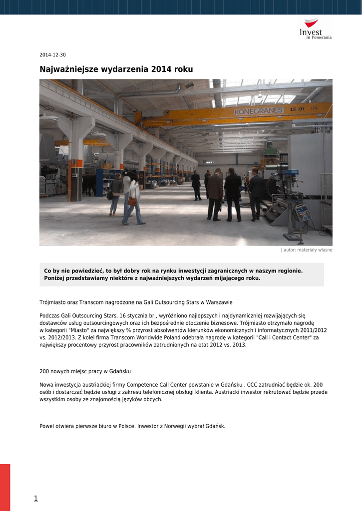 2014-12-30 Najważniejsze wydarzenia 2014 roku | autor: materiały własne Co by nie powiedzieć, to był dobry rok na rynku inwestycji zagranicznych w naszym regionie. Poniżej przedstawiamy niektóre z najważniejszych wydarzeń mijającego roku. Trójmiasto oraz Transcom nagrodzone na Gali Outsourcing Stars w Warszawie Podczas Gali Outsourcing Stars, 16 stycznia br., wyróżniono najlepszych i najdynamiczniej rozwijających się dostawców usług outsourcingowych oraz ich bezpośrednie otoczenie biznesowe. Trójmiasto otrzymało nagrodę w kategorii "Miasto" za największy % przyrost absolwentów kierunków ekonomicznych i informatycznych 2011/2012 vs. 2012/2013. Z kolei firma Transcom Worldwide Poland odebrała nagrodę w kategorii "Call i Contact Center" za największy procentowy przyrost pracowników zatrudnionych na etat 2012 vs. 2013. 200 nowych miejsc pracy w Gdańsku Nowa inwestycja austriackiej firmy Competence Call Center powstanie w Gdańsku . CCC zatrudniać będzie ok. 200 osób i dostarczać będzie usługi z zakresu telefonicznej obsługi klienta. Austriacki inwestor rekrutować będzie przede wszystkim osoby ze znajomością języków obcych. Powel otwiera pierwsze biuro w Polsce. Inwestor z Norwegii wybrał Gdańsk. 1 Powel AS, lider w tworzeniu kluczowego oprogramowania biznesowego i dostarczaniu usług z nim związanych dla przedsiębiorstw energetycznych, samorządów terytorialnych oraz wykonawców robót inżynieryjno-budowlanych ogłosił w dniu dzisiejszym otwarcie nowego biura w Gdańsku. Oficjalne otwarcie biura fińskiej Kemiry 4 marca 2014, firma Kemira, oficjalnie otworzyła w Gdańsku biuro swojego nowego centrum usług biznesowych. Inwestor na siedzibę wybrał biurowiec Alchemia, w którym wynajął 2,6 tys. m kw. powierzchni, zajmując 2 piętra jednej z dwóch wież kompleksu. Boeing daje zielone światło! Jeppesen Poland z siedzibą w Gdańsku rozpoczyna nowy projekt Dzięki wsparciu Boeinga, Jeppesen Poland, globalna firma informatyczna, której siedziba mieści się w Gdańsku planuje podwoić liczbę strategicznych działów do 2015 roku. Na atrakcyjną pracę mogą liczyć specjaliści między innymi z dziedzin: IT (w zakresie aplikacji mobilnych), nawigacji, geodezji i kartografii, geoinformacji, lotnictwa i inżynierii materiałowej. W związku z nowym projektem firma zwiększy zatrudnienie z 210 obecnie pracujących do ponad 300 osób. Największa norweska grupa mediowa rozpocznie swoją działalność w Trójmieście Schibsted Tech Polska będzie w Gdańsku pracować nad mediami przyszłości. Schibsted Media Group jest jedną z największych firm medialnych w Europie, zatrudniających 7000 pracowników w 29 krajach. Obecnie to właśnie Gdańsk przykuł uwagę norweskiej firmy, jako idealne miejsce dla nowej inwestycji. EPAM w Trójmieście: 500 nowych miejsc pracy EPAM, światowy potentat w branży informatycznej i największy w środkowo-wschodniej Europie dostawca usług z dziedziny tworzenia nowoczesnego oprogramowania, uruchomi kolejny oddział w Polsce. Nowe biuro powstanie w Gdańsku. Uroczyste otwarcie Alteams Poland Alteams Poland uroczyście inauguruje działalność swojego nowego zakładu produkcyjnego w Lęborku. Lębork i Pomorze zostały wybrane ze względu na dogodną lokalizację, umożliwiającą efektywną obsługę kluczowych klientów w czasie 48 godzin. Zawsze warto porozmawiać – o nowym oddziale Call Center Inter Galactica w Gdańsku Ponad 200 nowych miejsc współpracy - Call Center Inter Galactica, jedno z największych contact center w Polsce, otworzyło kolejny oddział firmy. MOL otwiera centrum Gdańsku 2 Japoński armator kontenerowy, MOL Europe (część Mitsui O.S.K Lines), otwiera w Gdańsku nowe centrum operacyjne. Pracę znajdzie 60 osób, głównie specjalistów w zakresie logistyki. MOL podpisał także porozumienie o współpracy z Akademią Morską. Co wspólnego mają narty i Wielki Zderzacz Hadronów? Francuski inwestor otwiera swój odział w Gdańsku Intitek Polska jest firmą inżynieryjną specjalizującą się w konsultingu, wsparciu technicznym, team leasingu oraz R&D. W biurze w Gdańsku zatrudnienie znajdzie w najbliższym roku około 60 osób, a w dalszej perspektywie nawet 100 pracowników. Nowe centrum IT w Trójmieście SMT Software otwiera nowy odział w Trójmieście. Prace znajdzie 100 programistów. SMT jest firmą pochodzącą z Wrocławia, posiada już 8 oddziałów w Polsce oraz dodatkowo w Welkiej Brytanii, Niemczech i Holandii. 100 miejsc pracy w Gdańsku Polska firma PGS Software rozpoczęła rekrutację do swojego oddziału w Gdańsku - w najbliższym czasie zamierza zatrudnić ok. 100 programistów oraz specjalistów IT. PGS Software zajmuje się tworzeniem nowoczesnych aplikacji wykorzystywanych w różnych branżach m.in. finansowej, e-commerce czy social media. Zatrudnia ponad 300 specjalistów w kilku miastach i posiada oficjalne przedstawicielstwo w Londynie. Nowa fabryka Tritec Norweska firma Tritec oficjalnie zainaugurowala działalność swojej nowej fabryki w Podstrefie Redzikowo Słupskiej Specjalnej Strefy Ekonomicznej. Tritec produkuje komponenty metalowe wykorzystywane w urządzeniach dźwigowych. Główni klienci Tritec działają w branży morskiej. ThyssenKrupp inwestuje w Gdańsku W największym w Trójmieście globalnym SSC znajdzie pracę nawet 700 osób. W centrum planowana jest obsługa korporacyjnych procesów biznesowych obejmujących finanse i rachunkowość, administrację procesów HR, naliczanie wynagrodzeń, a także niespotykane na rynku trójmiejskim zarządzanie nieruchomościami. Nowa inwestycja firmy doradczej PwC w Polsce Firma doradcza PwC zwiększa swoje zaangażowanie w Polsce, otwierając Centrum Kompetencyjne (Center of Excellence) w Gdańsku. Centrum będzie świadczyć usługi doradcze głównie dla klientów z sektora finansowego krajów Europy Zachodniej i Stanów Zjednoczonych. Będzie to kolejna inwestycja PwC w Polsce - w 2009 r.