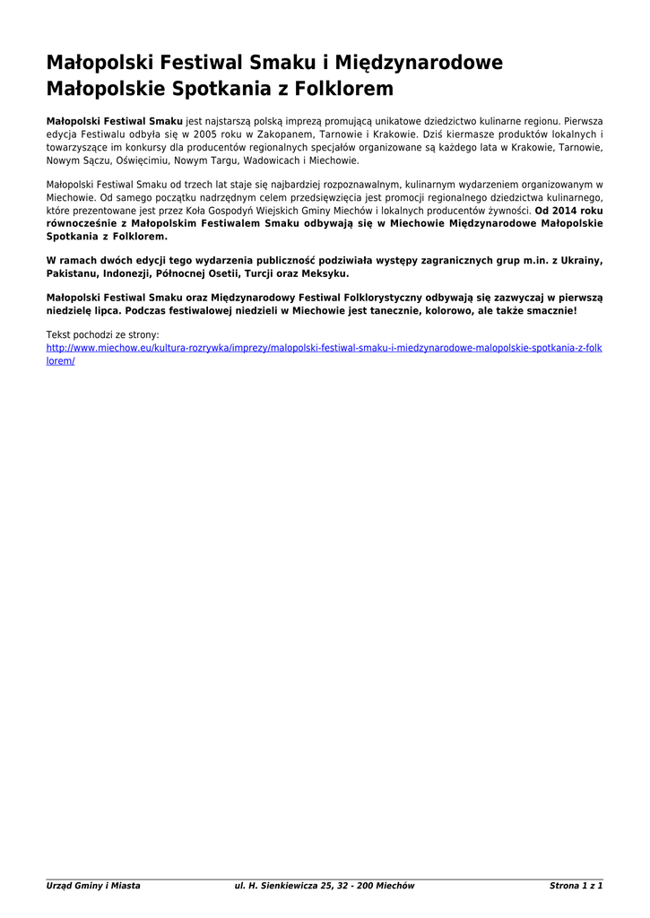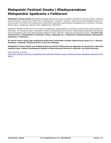 Małopolski Festiwal Smaku i Międzynarodowe Małopolskie Spotkania z Folklorem Małopolski Festiwal Smaku jest najstarszą polską imprezą promującą unikatowe dziedzictwo kulinarne regionu. Pierwsza edycja Festiwalu odbyła się w 2005 roku w Zakopanem, Tarnowie i Krakowie. Dziś kiermasze produktów lokalnych i towarzyszące im konkursy dla producentów regionalnych specjałów organizowane są każdego lata w Krakowie, Tarnowie, Nowym Sączu, Oświęcimiu, Nowym Targu, Wadowicach i Miechowie. Małopolski Festiwal Smaku od trzech lat staje się najbardziej rozpoznawalnym, kulinarnym wydarzeniem organizowanym w Miechowie. Od samego początku nadrzędnym celem przedsięwzięcia jest promocji regionalnego dziedzictwa kulinarnego, które prezentowane jest przez Koła Gospodyń Wiejskich Gminy Miechów i lokalnych producentów żywności. Od 2014 roku równocześnie z Małopolskim Festiwalem Smaku odbywają się w Miechowie Międzynarodowe Małopolskie Spotkania z Folklorem. W ramach dwóch edycji tego wydarzenia publiczność podziwiała występy zagranicznych grup m.in. z Ukrainy, Pakistanu, Indonezji, Północnej Osetii, Turcji oraz Meksyku. Małopolski Festiwal Smaku oraz Międzynarodowy Festiwal Folklorystyczny odbywają się zazwyczaj w pierwszą niedzielę lipca. Podczas festiwalowej niedzieli w Miechowie jest tanecznie, kolorowo, ale także smacznie! Tekst pochodzi ze strony: http://www.miechow.eu/kultura-rozrywka/imprezy/malopolski-festiwal-smaku-i-miedzynarodowe-malopolskie-spotkania-z-folk lorem/ Urząd Gminy i Miasta ul. H. Sienkiewicza 25, 32 - 200 Miechów Strona 1 z 1