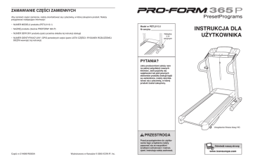 ZAMAWIANIE CZĘŚCI ZAMIENNYCH Aby zamówić części zamienne, należy skontaktować się z placówką, w której zakupiono produkt. Należy przygotować następujące informacje: • NUMER MODELU produktu (PETL3113.1) • NAZWĘ produktu (bieżnia PROFORM® 365 P) • NUMER SERYJNY produktu (patrz przednia okładka tej instrukcji obsługi) Model nr PETL3113.1 Nr seryjny • NUMER IDENTYFIKACYJNY i OPIS potrzebnych części (patrz LISTA CZĘŚCI i RYSUNEK ROZŁOŻONEJ BIEŻNI wewnątrz tej instrukcji) Nalepka z nr seryjnym INSTRUKCJA DLA UŻYTKOWNIKA PYTANIA? Jako producentowi zależy nam na pełnej satysfakcji naszych klientów. Jeśli pojawiły się wątpliwości lub jeśli pewnych elementów produktu brakuje bądź są uszkodzone, należy skontaktować się z placówką, w której produkt został zakupiony. PRZESTROGA Część nr 214698 R0505A Wydrukowano w Kanadzie © 2005 ICON IP, Inc. Przed przystąpieniem do użytkowania tego urządzenia należy zapoznać się ze wszystkimi środkami ostrożności i instrukcjami. Instrukcję należy zachować. Urządzenie fitness klasy HC Odwiedź naszą stronę www.iconeurope.com ZALECANE ĆWICZENIA ROZCIĄGAJĄCE Po prawej stronie przedstawiono prawidłowy sposób wykonywania kilku prostych ćwiczeń rozciągających. Podczas rozciągania poruszaj się powoli—nigdy nie podskakuj. 1. Rozciąganie poprzez dotykanie palców stóp SPIS TREŚCI WAŻNE ŚRODKI OSTROŻNOŚCI . . . . . . . . . . . . . . . . . . . . . . . . . . . . . . . . . . . . . . . . . . . . . . . . . . . . . . . . . . . .3 PRZED UŻYCIEM . . . . . . . . . . . . . . . . . . . . . . . . . . . . . . . . . . . . . . . . . . . . . . . . . . . . . . . . . . . . . . . . . . . . . . . . . .5 MONTAŻ . . . . . . . . . . . . . . . . . . . . . . . . . . . . . . . . . . . . . . . . . . . . . . . . . . . . . . . . . . . . . . . . . . . . . . . . . . . . . . . . .6 OBSŁUGA I REGULACJA . . . . . . . . . . . . . . . . . . . . . . . . . . . . . . . . . . . . . . . . . . . . . . . . . . . . . . . . . . . . . . . . . .9 JAK SKŁADAĆ I PRZEMIESZCZAĆ BIEŻNIĘ . . . . . . . . . . . . . . . . . . . . . . . . . . . . . . . . . . . . . . . . . . . . . . . . . .14 ROZWIĄZYWANIE PROBLEMÓW . . . . . . . . . . . . . . . . . . . . . . . . . . . . . . . . . . . . . . . . . . . . . . . . . . . . . . . . . . .16 WSKAZÓWKI DOTYCZĄCE POPRAWY KONDYCJI . . . . . . . . . . . . . . . . . . . . . . . . . . . . . . . . . . . . . . . . . . . . .18 ZAMAWIANIE CZĘŚCI ZAMIENNYCH . . . . . . . . . . . . . . . . . . . . . . . . . . . . . . . . . . . . . . . . . . . . . . .Tylna okładka Uwaga: RYSUNEK ROZŁOŻONEJ BIEŻNI i LISTA CZĘŚCI znajdują się wewnątrz tej instrukcji obsługi. 1 Stań uginając lekko nogi w kolanach i powoli pochylaj się do przodu, zginając ciało w pasie. Sięgnij jak najbliżej palców u stóp, po czym rozluźnij plecy i barki. Wykonaj to ćwiczenie 15 razy, a następnie rozluźnij się. Powtórz cykl 3 razy. Rozciągane: ścięgna podkolanowe, mięśnie ud i plecy. 2. Rozciąganie ścięgien podkolanowych 2 Usiądź z jedną nogą wyprostowaną. Stopę drugiej nogi oprzyj o wewnętrzną część uda wyprostowanej nogi. Próbuj dosięgnąć do palców wyprostowanej nogi. Wykonaj ćwiczenie 15 razy, a następnie rozluźnij się. Powtórz cykl 3 razy dla każdej nogi. Rozciągane: ścięgna podkolanowe, dolne partie pleców i pachwina. 3. Rozciąganie łydki/ścięgna Achillesa Jedną nogę wysuń do przodu, pochyl się i oprzyj się rękami o ścianę. Wyprostuj nogę pozostawioną w tyle i postaw płasko stopę tej nogi na podłodze. Zegnij nogę wysuniętą do przodu, pochyl się do przodu i poruszaj biodrami w kierunku ściany. Wykonaj ćwiczenie 15 razy, a następnie rozluźnij się. Powtórz cykl 3 razy dla każdej nogi. Aby dalej naciągać ścięgna Achillesa, zegnij również nogę wysuniętą do tyłu. Rozciągane: łydki, ścięgna Achillesa i kostki. 3 4 4. Rozciąganie mięśnia czterogłowego Jedną ręką oprzyj się o ścianę, by utrzymać równowagę, odchyl się i drugą ręką chwyć jedną stopę. Spróbuj przyciągnąć stopę jak najbliżej pośladków. Wykonaj ćwiczenie 15 razy, a następnie rozluźnij się. Powtórz cykl 3 razy dla każdej nogi. Rozciągane: mięśnie czterogłowe i mięśnie bioder. 5. Rozciąganie wewnętrznych części ud Usiądź, łącząc stopy przy zgiętych kolanach skierowanych na zewnątrz. Przyciągnij stopy jak najbliżej krocza. Wykonaj ćwiczenie 15 razy, a następnie rozluźnij się. Powtórz cykl 3 razy. Rozciągane: mięśnie czterogłowe i mięśnie bioder. PROFORM jest zarejestrowanym znakiem towarowym firmy ICON IP, Inc. 2 19 5 WSKAZÓWKI DOTYCZĄCE POPRAWY KONDYCJI OSTRZEŻENIE: Przed rozpoczęciem tego lub jakichkolwiek innych ćwiczeń skonsultuj się z lekarzem. Jest to szczególnie ważne u osób powyżej 35 roku życia oraz o osób, u których występują już problemy zdrowotne. Czujnik tętna nie jest urządzeniem medycznym. Różne czynniki, w tym ruch użytkownika bieżni, mogą wpłynąć na wskazania tętna. Czujnik ma jedynie pomagać w określaniu ogólnych trendów zmian tętna. Poniższe wskazówki będą pomocne w ułożeniu programu ćwiczeń. W celu uzyskania bardziej szczegółowych informacji na temat ćwiczeń należy zaopatrzyć się w stosowną literaturę lub skonsultować się z lekarzem. INTENSYWNOŚĆ ĆWICZEŃ Niezależnie od tego, czy Twoim celem jest spalenie tłuszczu, czy też wzmocnienie układu sercowonaczyniowego, kluczem do osiągnięcia pożądanych wyników jest ćwiczenie z odpowiednią intensywnością. Wskaźnikiem pozwalającym na dobranie właściwego poziomu intensywności jest tętno. W poniższej tabeli przedstawiono zalecane poziomy tętna przy spalaniu tłuszczu i ćwiczeniach aerobowych. Aby odnaleźć odpowiedni dla siebie poziom tętna, odszukaj swój wiek u dołu tabeli (wiek zaokrąglony jest do pełnych dziesiątek lat). Następnie odszukaj trzy liczby powyżej swojego 