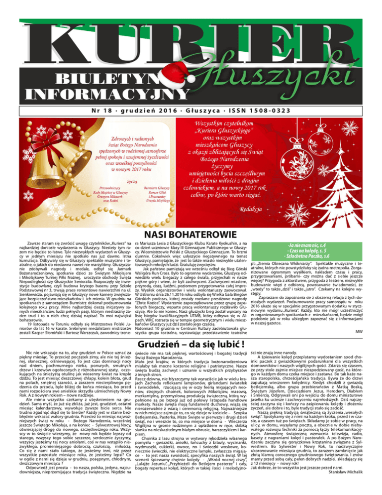 N r 1 8 · g ru d zi eń 2 01 6 · G łu szyca · I SSN 1 5 08-03 2 3 NASI BOHATEROWIE Zawsze staram się zwrócić uwagę czytelników „Kuriera” na najbardziej doniosłe wydarzenia w Głuszycy. Niestety tym ra zem nie będzie to łatwe. Tyle niezwykłych wydarzeń w Głuszycy w jednym miesiącu nie spotkało nas już dawno. Istna kumulacja. Odbywały się w Głuszycy spektakle muzyczne i teatralne, o jakich do niedawna nawet nie marzyliśmy. Głuszycza nie zdobywali nagrody i medale, odbył się Jarmark Bożonarodzeniowy, spotkanie dzieci ze Świętym Mikołajem i Mikołajkowy Turniej Piłki Nożnej, uroczyste obchody Święta Niepodległości czy Głuszyckie Senioralia. Rozpoczęły się inwestycje budowlane, czyli budowa krytego basenu przy Szkole Podstawowej nr 3, trwają prace remontowe nawierzchni na ul. Sienkiewicza, pojawiają się w Głuszycy nowe kamery zwiększa jące bezpieczeństwo mieszkańców i ich mienia. W grudniu na spotkaniach z samorządem Burmistrz dokonał podsumowania kolejnego roku pracy. Mnie najbardziej cieszą inicjatywy sa mych mieszkańców, ludzi pełnych pasji, którym niestraszny ża den trud i to o nich chcę dzisiaj napisać. To moi najwięksi bohaterowie. 1 9 listopada w Toruniu odbyły się Mistrzostwa Polski Ju niorów do lat 1 6 w karate. Srebrnymi medalistami mistrzostw zostali Kacper Słomiński i Bartosz Warszczuk, zawodnicy trene- ra Mariusza Lesia z Głuszyckiego Klubu Karate Kyokushin, a na co dzień uczniowie klasy III Gimnazjum Publicznego w Głuszycy. Wicemistrzowie Polski z Głuszyckiego Gimnazjum. To brzmi dumnie. Cokolwiek więc usłyszycie negatywnego na temat Głuszycy, pamiętajcie, że jest to także miasto niezwykle utalen towanych młodych ludzi. Gratuluję zwycięstw. Jak państwo pamiętają we wrześniu odbył się Bieg Górski Waligóra Run Cross. Było to ogromne wydarzenie, Głuszycę od wiedziło wielu biegaczy z całego świata, przyjechali w nasze piękne góry i wiem, że byli zachwyceni. Zachwyceni miastem, przyrodą, ciszą, ludźmi, poziomem przygotowania całej imprezy. Wysiłek organizatorów i wielu wolontariuszy zaowocował. W Ustroniu dnia 26.1 1 .201 6 roku odbyła się Wielka Gala Biegów Górskich podczas, której zostały rozdane prestiżowe nagrody "Złote Kozice". Wydarzenie zapoczątkowane przez grupę zapa lonych biegaczy, wsparte pracą wolontariuszy rozsławiło Głu szycę. Ale to nie koniec. Nasz głuszycki bieg został wpisany na listę biegów kwalifikacyjnych UTMB, który odbywa się w Al pach. WRC rozrasta się w tempie geometrycznym i wielu mieszkańców Głuszycy już dziś zostało jego częścią. Natomiast 1 0 grudnia w Centrum Kultury zadebiutowała głu szycka grupa teatralna, wystawiając przedstawienie teatralne -Ja nie mam nic, s.4 - Czas na kolędę, s. 5 - Szlachetna Paczka, s.6 pt: „Ziemia Obiecana Włókniarzy”. Spektakle muzyczne i teatralne, których nie powstydziłaby się żadna metropolia. Zorga nizowane ogromnym wysiłkiem, nakładem czasu i pracy, przygotowaniami, próbami- czy można dać z siebie jeszcze więcej? Przygoda z aktorstwem, przygoda z teatrem, niezwykłe budowanie więzi z odbiorcą, powstawanie świadomości, że „wtedy” to także „dziś” i także „jutro”. Czekamy na kolejne występy. Zapraszam do zapoznania sie z obszerną relacja z tych do niosłych wydarzeń. Podsumowanie pracy samorządu w roku 201 6 ukaże się w specjalnie przygotowanym dodatku w styczniowym wydaniu „Kuriera”. Każdy, kto nie mógł uczestniczyć w organizowanych spotkaniach z mieszkańcami, będzie mógł podobnie jak w roku ubiegłym zapoznać się z informacjami w naszej gazetce. Nic nie wskazuje na to, aby grudzień w Polsce uznać za piękny miesiąc. To przecież początek zimy, ale nie tej śnieżnej, słonecznej, olśniewającej. To jest czas dominacji nocy nad dniem, pochmurnego nieba, ponurych, smutnych drzew i krzewów ogołoconych z różnobarwnej szaty, oczekujących na śnieżystą otulinę jak wiosenny kwiat na krople dżdżu. To jest miesiąc deszczowej chlapy, kolein błota, grud na polach, smętnej szarości, a zarazem niecierpliwego pędzenia do przodu, byle bliżej do końca miesiąca, bo przed nami rozpościera swe anielskie skrzydła uśmiechnięty Nowy Rok. A z nowym rokiem – nowe nadzieje. Ale mimo wszystko czekamy z utęsknieniem na grudzień. Sama myśl, że już się zbliża, już jest, grudzień, ostatni miesiąc kalendarzowy, wywołuje żywsze bicie serca. Nie trudno zgadnąć skąd się to bierze? Każdy jest w stanie bezbłędnie wskazać walory grudnia. Przecież to miesiąc najważniejszych świąt w roku - Bożego Narodzenia, wcześniej jeszcze Świętego Mikołaja, a na koniec - Sylwestrowej Nocy, otwierającej drogę do nowego, szczęśliwszego roku. Wszyscy w to święcie wierzymy, że nowy rok będzie lepszy od starego, wszyscy tego sobie szczerze, serdecznie życzymy, wszyscy jesteśmy tej nocy aniołami, coś w nas wstąpiło niezwykłego, promieniejącego dobrocią, czułością, miłością. Co się z nami stało takiego, że jesteśmy inni, niż przez wszystkie pozostałe miesiące roku, że jesteśmy lepsi? Co w ogóle z nami się dzieje w grudniu, posępnym, chłodnym, deszczowym miesiącu ? Odpowiedź jest prosta - to nasza, polska, jedyna, najcudowniejsza, nieprzemijająca tradycja świąteczna. Nigdzie na świecie nie ma tak pięknej, wartościowej i bogatej tradycji Świąt Bożego Narodzenia. Mało jest krajów, w których tradycja bożonarodzeniowa miałaby tak mocne korzenie religijne i patriotyczne. Nasze święta budzą zachwyt i uznanie u wszystkich przybyszów z innych stron. Rzecz dziwna, nie błyszczymy tak wyraziście jak w wielu krajach Zachodu refleksami lampionów, girlandami światełek i świecidełek, rzucającą się w oczy feerią migających neonów, strojnych choinek, kolorowych Mikołajów, masową, merkantylną, przemysłową produkcją świąteczną, którą wypełnione są po brzegi już od po