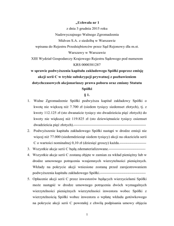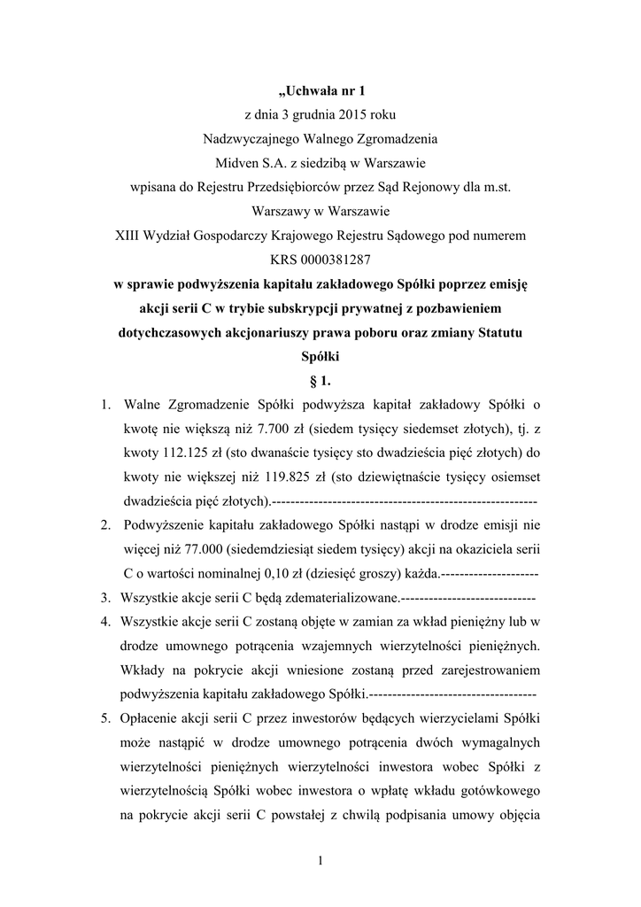 „Uchwała nr 1 z dnia 3 grudnia 2015 roku Nadzwyczajnego Walnego Zgromadzenia Midven S.A. z siedzibą w Warszawie wpisana do Rejestru Przedsiębiorców przez Sąd Rejonowy dla m.st. Warszawy w Warszawie XIII Wydział Gospodarczy Krajowego Rejestru Sądowego pod numerem KRS 0000381287 w sprawie podwyższenia kapitału zakładowego Spółki poprzez emisję akcji serii C w trybie subskrypcji prywatnej z pozbawieniem dotychczasowych akcjonariuszy prawa poboru oraz zmiany Statutu Spółki § 1. 1. Walne Zgromadzenie Spółki podwyższa kapitał zakładowy Spółki o kwotę nie większą niż 7.700 zł (siedem tysięcy siedemset złotych), tj. z kwoty 112.125 zł (sto dwanaście tysięcy sto dwadzieścia pięć złotych) do kwoty nie większej niż 119.825 zł (sto dziewiętnaście tysięcy osiemset dwadzieścia pięć złotych).--------------------------------------------------------2. Podwyższenie kapitału zakładowego Spółki nastąpi w drodze emisji nie więcej niż 77.000 (siedemdziesiąt siedem tysięcy) akcji na okaziciela serii C o wartości nominalnej 0,10 zł (dziesięć groszy) każda.--------------------3. Wszystkie akcje serii C będą zdematerializowane.----------------------------4. Wszystkie akcje serii C zostaną objęte w zamian za wkład pieniężny lub w drodze umownego potrącenia wzajemnych wierzytelności pieniężnych. Wkłady na pokrycie akcji wniesione zostaną przed zarejestrowaniem podwyższenia kapitału zakładowego Spółki.-----------------------------------5. Opłacenie akcji serii C przez inwestorów będących wierzycielami Spółki może nastąpić w drodze umownego potrącenia dwóch wymagalnych wierzytelności pieniężnych wierzytelności inwestora wobec Spółki z wierzytelnością Spółki wobec inwestora o wpłatę wkładu gotówkowego na pokrycie akcji serii C powstałej z chwilą podpisania umowy objęcia 1 akcji serii C. Umowne potrącenie wierzytelności, zgodnie z którym dojdzie do wzajemnego umorzenia wierzytelności do wysokości równej opłacie za akcje serii C oznacza dokonanie wpłaty na akcje serii C. Umowne potrącenie wierzytelności następuje zgodnie z art. 14 §4 k.s.h. Potwierdzeniem dokonania wpłaty na akcje będzie oświadczenie inwestora o wyrażeniu zgody na umowne potrącenie wzajemnych wierzytelności pieniężnych. ------------------------------------------------------6. Akcje Serii C będą uczestniczyć w dywidendzie na następujących warunkach:--------------------------------------------------------------------------a. Akcje Serii C wydane lub zapisane po raz pierwszy na rachunku papierów wartościowych najpóźniej w dniu dywidendy ustalonym w uchwale Walnego Zgromadzenia w sprawie podziału zysku, uczestniczą w dywidendzie począwszy od zysku za poprzedni rok obrotowy, tzn. od dnia 1 stycznia roku obrotowego poprzedzającego bezpośrednio rok, w którym akcje te zostały wydane lub zapisane po raz pierwszy na rachunku papierów wartościowych,----------------------b. Akcje Serii C wydane lub zapisane po raz pierwszy na rachunku papierów wartościowych w dniu przypadającym po dniu dywidendy ustalonym w uchwale Walnego Zgromadzenia w sprawie podziału zysku, uczestniczą w dywidendzie począwszy od zysku za rok obrotowy, w którym akcje te zostały wydane lub zapisane po raz pierwszy na rachunku papierów wartościowych, tzn. od dnia 1 stycznia tego roku obrotowego.---------------------------------------------------------7. Objęcie wszystkich akcji serii C nastąpi w drodze złożenia oferty (subskrypcja prywatna), przy czym oferta zostanie złożona nie więcej niż 149 (stu czterdziestu dziewięciu) adresatom.-----------------------------------8. Zawarcie przez Spółkę umów o objęciu akcji serii C w trybie art. 431 §2 pkt. 1 k.s.h. w ramach subskrypcji prywatnej nastąpi w terminie do dnia 6 maja 2016 roku.---------------------------------------------------------------------§ 2. 2 1. Po zapoznaniu się z pisemną opinią Zarządu Spółki uzasadniającą przyczyny pozbawienia dotychczasowych akcjonariuszy Spółki prawa poboru akcji serii C, działając w interesie Spółki Walne Zgromadzenie Spółki pozbawia dotychczasowych akcjonariuszy Spółki prawa poboru akcji serii C w całości.-------------------------------------------------------------2. Opinia Zarządu Spółki, o której mowa w ust. 1, brzmi jak następuje: „Pozbawienie prawa poboru dotychczasowych akcjonariuszy Spółki związane jest z realizacją celów emisji akcji serii C, polegających głównie na zaoferowaniu objęcia akcji inwestorom zewnętrznym w ramach subskrypcji prywatnej, co gwarantuje szybszy i korzystniejszy sposób pozyskania środków finansowych na podwyższenie kapitału zakładowego Spółki. Wybór trybu subskrypcji prywatnej uzasadniony jest również dążeniem do ograniczenia kosztów emisji akcji serii C oraz koniecznością zamknięcia emisji w możliwie najkrótszym terminie. W obecnej sytuacji, podwyższenie kapitału zakładowego Spółki bez wyłączenia prawa poboru dla dotychczasowych akcjonariuszy, wiąże się z bardziej skomplikowaną procedurą prawną, jak również ze znacznymi kosztami tegoż procesu. W związku z powyższym Zarząd Spółki opiniuje pozytywnie projekt uchwały w sprawie emisji akcji serii C z wyłączeniem prawa poboru dotychczasowych akcjonariuszy oraz zmiany Statutu Spółki i rekomenduje akcjonariuszom przyjęcie uchwały.”---------------------------------------------§ 3. Walne Zgromadzenie ustala cenę emisyjną akcji serii C w wysokości 100 zł (sto złotych) za akcję.------------------------------------------------------------------§ 4. W związku z podwyższeniem kapitału zakładowego Spółki zmienia się dotychczasową treść §6 ust. 1 Statutu Spółki i nadaje się następujące brzmienie:--------------------------------------------------------------------------------„§6 Kapitał zakładowy wynosi nie więcej niż 119.825 zł (sto dziewiętnaście tysięcy os