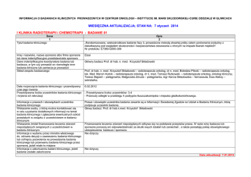 INFORMACJA O BADANIACH KLINICZNYCH PROWADZONYCH W CENTRUM ONKOLOGII – INSTYTUCIE IM. MARII SKŁODOWSKIEJ-CURIE ODDZIALE W GLIWICACH MIESIĘCZNA AKTUALIZACJA; STAN NA: 7 styczeń 2014 I KLINIKA RADIOTERAPII i CHEMIOTRAPII - BADANIE 01 Dane 1 Tytuł badania klinicznego Opis 2 „Randomizowane, wieloośrodkowe badanie fazy 3, prowadzone metodą otwartej próby celem porównania erybuliny z dakarbazyną pod względem skuteczności i bezpieczeństwa stosowania u chorych na mięsaki tkanek miękkich” Nr protokołu: E7389-G000-309 Imię i nazwisko, nazwa sponsora albo firma sponsora lub dane indentyfikacyjne przedstawiciela sponsora Dane indentyfikacyjne koordynatora badania lub badacza, w tym czy prowadzi on równolegle inne badania kliniczne lub zamierza je prowadzić Skład zespołu badawczego Eisai Data rozpoczęcia badania klinicznego i przewidywany czas jego trwania Przewidywana liczba uczestników badania klinicznego i kryteria ich rekrutacji 6.02.2012 Informacja o prawach i obowiązkach uczestnika badania klinicznego Wskazanie osoby, z którą można kontaktować się w celu uzyskania dodatkowych informacji na temat badania klinicznego i zgłaszania ewentualnych szkód powstałych w związku z uczestnictwem w badaniu klinicznym Wskazanie źródeł finansowania leczenia zdarzeń niepożądanych związanych z uczestnictwem w badaniu klinicznym Informacja o wydaniu przez ministra właściwego ds. zdrowia decyzji o zawieszeniu badania klinicznego lub cofnięciu pozwolenia na prowadzenie badania klinicznego lub przerwaniu badania klinicznego przez sponsora, jeżeli miało to miejsce Informacja o zakończeniu badani klinicznego, jeżeli badanie zostało zakończone Prawa i obowiązki uczestnika badania zawarte są w Informacji i Świadomej Zgodzie na Udział w Badaniu Klinicznym, którą podpisuje uczestnik badania. Głowy badacz: Prof. dr hab.n.med. Krzysztof Składowski Główny badacz Prof. dr hab. n. med. Krzysztof Składowski Prof. dr hab. n. med. Krzysztof Składowski – radioterapeuta onkolog, dr n. med. Bolesław Pilecki – radioterapeuta onkolog, lek. Med. Marcin Hutnik – radioterapeuta onkolog, dr n. med. Tomasz Rutkowski – radioterapeuta onkolog, onkolog kliniczny, Teresa Stępień – pielęgniarka, Małgorzata Zmuda – pielęgniarka, mgr Hanna Składowska – farmaceuta, Ewa Aleksy – sekretarka. - Przewidywana liczba uczestników: 3-4 - Przerzuty odległe w przebiegu 4 podtypów tłuszczakomięska i mięsaka gładkokomórkowego. Finansowanie leczenia zdarzeń niepożądanych odbywa się na podstawie przepisów prawa. W razie winy badacza lub sponsora ponoszą oni odpowiedzialność za skutki swych działań lub zaniechań , a także posiadają polisę obowiązkowego ubezpieczenia badacza i sponsora. Nie dotyczy Nie dotyczy Data aktualizacji: 7.01.2014 I KLINIKA RADIOTERAPII i CHEMIOTERAPII - BADANIE 02 Dane 1 Tytuł badania klinicznego Opis 2 Wieloośrodkowe, międzynarodowe badanie fazy III z randomizacją, prowadzone metodą podwójnie ślepej próby, z grupą kontrolną otrzymującą placebo dotyczące doksorubicyny plus palifosfamid-tris porównaniu z doksorubicyną plus placebo jako leczenie pierwszego rzutu pacjentów z przerzutowym mięsakiem tkanek miękkich. Nr protokołu: IPM 3001 Imię i nazwisko, nazwa sponsora albo firma Ziopharm sponsora lub dane indentyfikacyjne przedstawiciela sponsora Dane indentyfikacyjne koordynatora badania lub Główny badacz Prof. dr hab. n. med. Krzysztof Składowski badacza, w tym czy prowadzi on równolegle inne badania kliniczne lub zamierza je prowadzić Skład zespołu badawczego Prof. dr hab. n. med. Krzysztof Składowski – radioterapeuta onkolog, dr n. med. Bolesław Pilecki – radioterapeuta onkolog, lek. Med. Marcin Hutnik – radioterapeuta onkolog, dr n. med. Tomasz Rutkowski – radioterapeuta onkolog, onkolog kliniczny, lek. med. Beata Hejduk starszy asystent, specjalizacja w radiologii, Teresa Stępień – pielęgniarka, Małgorzata Zmuda – pielęgniarska, mgr Hanna Składowska – farmaceuta, Ewa Aleksy – sekretarka. Data rozpoczęcia badania klinicznego i 29.02.2012 przewidywany czas jego trwania Przewidywana liczba uczestników badania Przewidywana liczba uczestników: 1-2. klinicznego Chorzy z przerzutami odległymi w przebiegu mięsaków tkanek miękkich typu: mięsak gładkomórkowy, maziówczak i i kryteria ich rekrutacji inne z wyłączeniem mięsaków kości włókniakomięsaka skóry, GIST, Kaposi sarkoma, mięsaki wyindukowane i dobrze zróżnicowany tłuszczako-mięsak. Informację o prawach i obowiązkach uczestnika badania klinicznego Wskazanie osoby, z którą można kontaktować się w celu uzyskania dodatkowych informacji na temat badania klinicznego i zgłaszania ewentualnych szkód powstałych w związku z uczestnictwem w badaniu klinicznym Wskazanie źródeł finansowania leczenia zdarzeń niepożądanych związanych z uczestnictwem w badaniu klinicznym Informacja o wydaniu przez ministra właściwego ds. zdrowia decyzji o zawieszeniu badania klinicznego lub cofnięciu pozwolenia na prowadzenie badania klinicznego lub przerwaniu badania klinicznego przez sponsora, jeżeli miało to miejsce Informacja o zakończeniu badani klinicznego, jeżeli badanie zostało zakończone Prawa i obowiązki uczestnika badania zawarte są w Informacji i Świadomej Zgodzie na Udział w Badaniu Klinicznym, którą podpisuje uczestnik badania. Głowy badacz: Prof. dr hab.n.med. Krzysztof Składowski Finansowanie leczenia zdarzeń niepożądanych odbywa się na podstawie przepisów prawa. W razie winy badacza lub sponsora ponoszą oni odpowiedzialność za skutki swych działań lub zaniechań , a także posiadają polisę obowiązkowego ubezpieczenia badacza i sponsora. Nie dotyczy Nie dotyczy Data aktualizacji: 7.01.2014