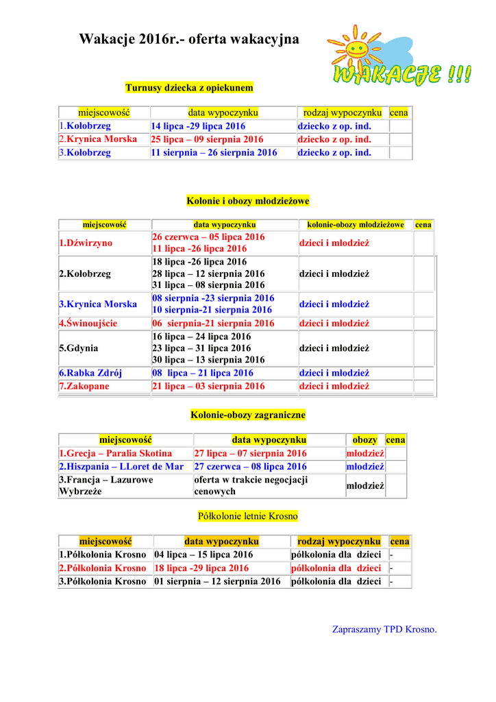 Wakacje 2016r.- oferta wakacyjna Turnusy dziecka z opiekunem miejscowość 1.Kołobrzeg 2.Krynica Morska 3.Kołobrzeg data wypoczynku 14 lipca -29 lipca 2016 25 lipca – 09 sierpnia 2016 11 sierpnia – 26 sierpnia 2016 rodzaj wypoczynku cena dziecko z op. ind. dziecko z op. ind. dziecko z op. ind. Kolonie i obozy młodzieżowe miejscowość 1.Dźwirzyno 2.Kołobrzeg 3.Krynica Morska 4.Świnoujście 5.Gdynia 6.Rabka Zdrój 7.Zakopane data wypoczynku kolonie-obozy młodzieżowe 26 czerwca – 05 lipca 2016 11 lipca -26 lipca 2016 18 lipca -26 lipca 2016 28 lipca – 12 sierpnia 2016 31 lipca – 08 sierpnia 2016 08 sierpnia -23 sierpnia 2016 10 sierpnia-21 sierpnia 2016 06 sierpnia-21 sierpnia 2016 16 lipca – 24 lipca 2016 23 lipca – 31 lipca 2016 30 lipca – 13 sierpnia 2016 08 lipca – 21 lipca 2016 21 lipca – 03 sierpnia 2016 cena dzieci i młodzież dzieci i młodzież dzieci i młodzież dzieci i młodzież dzieci i młodzież dzieci i młodzież dzieci i młodzież Kolonie-obozy zagraniczne miejscowość 1.Grecja – Paralia Skotina 2.Hiszpania – LLoret de Mar 3.Francja – Lazurowe Wybrzeże data wypoczynku 27 lipca – 07 sierpnia 2016 27 czerwca – 08 lipca 2016 oferta w trakcie negocjacji cenowych obozy cena młodzież młodzież młodzież Półkolonie letnie Krosno miejscowość data wypoczynku 1.Półkolonia Krosno 04 lipca – 15 lipca 2016 2.Półkolonia Krosno 18 lipca -29 lipca 2016 3.Półkolonia Krosno 01 sierpnia – 12 sierpnia 2016 rodzaj wypoczynku półkolonia dla dzieci półkolonia dla dzieci półkolonia dla dzieci cena - Zapraszamy TPD Krosno.