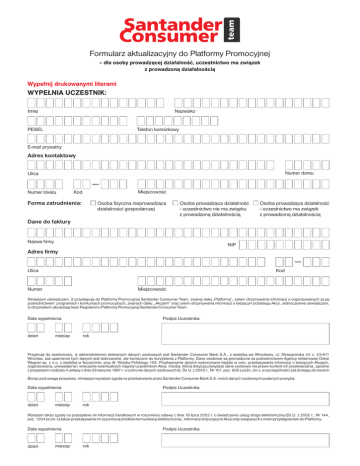 Formularz aktualizacyjny do Platformy Promocyjnej – dla osoby prowadzącej działalność, uczestnictwo ma związek z prowadzoną działalnością Wypełnij drukowanymi literami WYPEŁNIA UCZESTNIK: Imię Nazwisko Telefon komórkowy PESEL E-mail prywatny Adres kontaktowy Numer domu Ulica Kod Miejscowość Forma zatrudnienia: Osoba fizyczna nieprowadząca działalności gospodarczej Numer lokalu Osoba prowadząca działalność - uczestnictwo nie ma związku z prowadzoną działalnością Osoba prowadząca działalność - uczestnictwo ma związek z prowadzoną działalnością Dane do faktury Nazwa firmy NIP Adres firmy Ulica Kod Numer Miejscowość Niniejszym oświadczam, iż przystępuję do Platformy Promocyjnej Santander Consumer Team, zwanej dalej „Platformą”, celem otrzymywania informacji o organizowanych za jej pośrednictwem: programach i konkursach promocyjnych, zwanych dalej: „Akcjami” oraz celem otrzymywania informacji o bieżącym przebiegu Akcji. Jednocześnie oświadczam, iż otrzymałem i akceptuję treść Regulaminu Platformy Promocyjnej Santander Consumer Team. Data wypełnienia dzień miesiąc Podpis Uczestnika rok Przyjmuję do wiadomości, iż administratorem zbieranych danych osobowych jest Santander Consumer Bank S.A., z siedzibą we Wrocławiu, ul. Strzegomska 42 c, 53-611 Wrocław, zaś ujawnienie tych danych jest dobrowolne, ale konieczne do korzystania z Platformy. Dane osobowe są gromadzone za pośrednictwem Agencji reklamowej Oskar Wegner sp. z o.o. z siedzibą w Szczecinie, przy Al. Wojska Polskiego 156. Przetwarzanie danych wykonywane będzie w celu: przekazywania informacji o bieżących Akcjach, organizowania, prowadzenia i wręczania ewentualnych nagród uczestnikom Akcji. Osoba, której dotyczą powyższe dane osobowe ma prawo kontroli ich przetwarzania, zgodnie z przepisami rozdziału 4 ustawy z dnia 29 sierpnia 1997 r. o ochronie danych osobowych (tj. Dz.U. z 2002 r., Nr 101, poz. 926 z późn. zm.), w szczególności zaś dostępu do swoich Biorąc pod uwagę powyższe, niniejszym wyrażam zgodę na przetwarzanie przez Santander Consumer Bank S.A. moich danych osobowych podanych powyżej. Data wypełnienia dzień miesiąc Podpis Uczestnika rok Wyrażam także zgodę na przesyłanie mi informacji handlowych w rozumieniu ustawy z dnia 18 lipca 2002 r. o świadczeniu usług droga elektroniczną (Dz.U. z 2002 r., Nr 144, poz. 1204 ze zm.) a także przekazywanie mi za pomocą środków komunikacji elektronicznej , informacji dotyczących Akcji oraz związanych z moim przystąpieniem do Platformy. Data wypełnienia dzień miesiąc Podpis Uczestnika rok Formularz aktualizacyjny do Platformy Promocyjnej – dla osoby fizycznej nieprowadzącej działalności gospodarczej/osoby prowadzącej działalność, uczestnictwo nie ma związku z prowadzoną działalnością Wypełnij drukowanymi literami WYPEŁNIA UCZESTNIK: Imię Nazwisko Telefon komórkowy PESEL E-mail prywatny Adres kontaktowy Numer domu Ulica Numer lokalu Miejscowość Kod Forma współpracy Osoba fizyczna nieprowadząca działalności gospodarczej Dane podatkowe Adres zamieszkania Osoba prowadząca działalność - uczestnictwo nie ma związku z prowadzoną działalnością Ulica Osoba prowadząca działalność - uczestnictwo ma związek z prowadzoną działalnością Kod Numer domu Numer lokalu Miejscowość Powiat Gmina NIP Województwo Dane Urzędu Skarbowego Nazwa Urzędu Skarbowego Ulica Kod Miejscowość Niniejszym oświadczam, iż przystępuję do Platformy Promocyjnej Santander Consumer Team, zwanej dalej „Platformą”, celem otrzymywania informacji o organizowanych za jej pośrednictwem: programach i konkursach promocyjnych, zwanych dalej: „Akcjami” oraz celem otrzymywania informacji o bieżącym przebiegu Akcji. Jednocześnie oświadczam, iż otrzymałem i akceptuję treść Regulaminu Platformy Promocyjnej Santander Consumer Team. Data wypełnienia dzień miesiąc Podpis Uczestnika rok Przyjmuję do wiadomości, iż administratorem zbieranych danych osobowych jest Santander Consumer Bank S.A., z siedzibą we Wrocławiu, ul. Strzegomska 42 c, 53-611 Wrocław, zaś ujawnienie tych danych jest dobrowolne, ale konieczne do korzystania z Platformy. Dane osobowe są gromadzone za pośrednictwem Agencji reklamowej Oskar Wegner sp. z o.o. z siedzibą w Szczecinie, przy Al. Wojska Polskiego 156.Przetwarzanie danych wykonywane będzie w celu: przekazywania informacji o bieżących Akcjach, organizowania, prowadzenia i wręczania ewentualnych nagród uczestnikom Akcji. Osoba, której dotyczą powyższe dane osobowe ma prawo kontroli ich przetwarzania, zgodnie z przepisami rozdziału 4 ustawy z dnia 29 sierpnia 1997 r. o ochronie danych osobowych (tj. Dz.U. z 2002 r., Nr 101, poz. 926 z późn. zm.), w szczególności zaś dostępu do swoich danych oraz ich zmiany. Biorąc pod uwagę powyższe, niniejszym wyrażam zgodę na przetwarzanie przez Santander Consumer Bank S.A. moich danych osobowych podanych powyżej. Data wypełnienia dzień miesiąc Podpis Uczestnika rok Wyrażam także zgodę na przesyłanie mi informacji handlowych w rozumieniu ustawy z dnia 18 lipca 2002 r. o świadczeniu usług droga elektroniczną (Dz.U. z 2002 r., Nr 144, poz. 1204 ze zm.) a także przekazywanie mi za pomocą środków komunikacji elektronicznej , informacji dotyczących Akcji oraz związanych z moim przystąpieniem do Platformy. Data wypełnienia dzień miesiąc Podpis Uczestnika rok