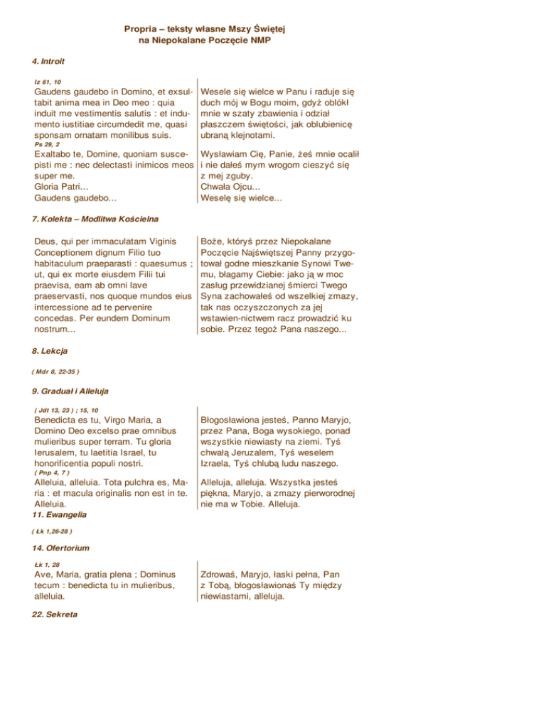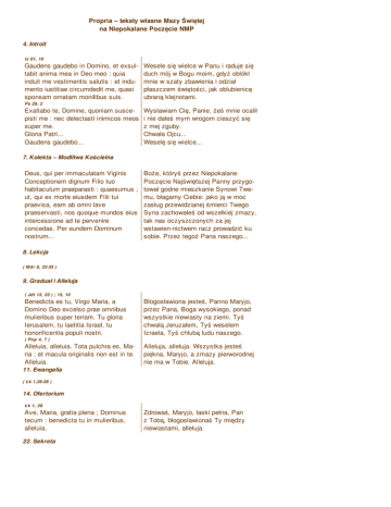 Propria – teksty własne Mszy Świętej na Niepokalane Poczęcie NMP 4. Introit Iz 61, 10 Gaudens gaudebo in Domino, et exsultabit anima mea in Deo meo : quia induit me vestimentis salutis : et indumento iustitiae circumdedit me, quasi sponsam ornatam monilibus suis. Wesele się wielce w Panu i raduje się duch mój w Bogu moim, gdyż oblókł mnie w szaty zbawienia i odział płaszczem świętości, jak oblubienicę ubraną klejnotami. Ps 29, 2 Exaltabo te, Domine, quoniam suscepisti me : nec delectasti inimicos meos super me. Gloria Patri... Gaudens gaudebo... Wysławiam Cię, Panie, żeś mnie ocalił i nie dałeś mym wrogom cieszyć się z mej zguby. Chwała Ojcu... Weselę się wielce... 7. Kolekta – Modlitwa Kościelna Deus, qui per immaculatam Viginis Conceptionem dignum Filio tuo habitaculum praeparasti : quaesumus ; ut, qui ex morte eiusdem Filii tui praevisa, eam ab omni lave praeservasti, nos quoque mundos eius intercessione ad te pervenire concedas. Per eundem Dominum nostrum... Boże, któryś przez Niepokalane Poczęcie Najświętszej Panny przygotował godne mieszkanie Synowi Twemu, błagamy Ciebie: jako ją w moc zasług przewidzianej śmierci Twego Syna zachowałeś od wszelkiej zmazy, tak nas oczyszczonych za jej wstawien-nictwem racz prowadzić ku sobie. Przez tegoż Pana naszego... 8. Lekcja ( Mdr 8, 22-35 ) 9. Graduał i Alleluja ( Jdt 13, 23 ) ; 15, 10 Benedicta es tu, Virgo Maria, a Domino Deo excelso prae omnibus mulieribus super terram. Tu gloria Ierusalem, tu laetitia Israel, tu honorificentia populi nostri. Błogosławiona jesteś, Panno Maryjo, przez Pana, Boga wysokiego, ponad wszystkie niewiasty na ziemi. Tyś chwałą Jeruzalem, Tyś weselem Izraela, Tyś chlubą ludu naszego. ( Pnp 4, 7 ) Alleluia, alleluia. Tota pulchra es, Maria : et macula originalis non est in te. Alleluia. Alleluja, alleluja. Wszystka jesteś piękna, Maryjo, a zmazy pierworodnej nie ma w Tobie. Alleluja. 11. Ewangelia ( Łk 1,26-28 ) 14. Ofertorium Łk 1, 28 Ave, Maria, gratia plena ; Dominus tecum : benedicta tu in mulieribus, alleluia. 22. Sekreta Zdrowaś, Maryjo, łaski pełna, Pan z Tobą, błogosławionaś Ty między niewiastami, alleluja. Salutarem hostiam, quam in solemnitate immaculatae Conceptionis beatae Virgi-nis Mariae tibi, Domine, offerimus, suscipe et praesta : ut, sicut illam tua gratia praeveniente ab omni labe immunem profitemur ; ita eius intercesione a culpis omnibus liberemur. Per Dominum nostrum... Przyjmij, Panie, ofiarę zbawienia, którą Tobie składamy w uroczystość Niepoka-lanego Poczęcia Najświętszej Maryi Panny. Jak my wyznajemy, że ona dzięki uprzedniej łasce Twojej jest wolna od wszelkiej zmazy, tak dla jej wstawiennictwa od wszelkich przewinień racz nas, Panie, wyzwolić. Przez Pana naszego... 23. Prefacja ( O NMP ) Vere dignum et iustum est, aequum et salutare, nos tibi semper et ubique gratias agere : Domine sancte, Pater omnipotens, aeterne Deus : et te in Conceptione Immaculata Beatae Mariae semper Virginis collaudare, benedicere et praedicare. Quae et unigenitum tuum Sancti Spiritus obumbratione concepit : et virginitatis gloria permanente, lumen aeternum mundo effudit, Iesum Christum, Dominum nostrum. Per quem maiestatem tuam laudant Angeli, adorant Dominationes, tremunt Potestates. Caeli caelorumque Virtutes ac beata Seraphim socia exsultatione concelebrant. Cum quibus et nostras voces et admitti iubeas, deprecamur, supplici confessione dicentes: Prawdziwie godnie jest to i sprawiedliwie, słusznie i zbawiennie, byśmy zawsze i wszędzie dzięki tobie czynili, Panie święty, Ojcze wszechmogący, wiekuisty Boże a czcząc Niepokalane Poczęcie błogosławionej Maryi zawsze Panny, Ciebie chwalili, błogosławili i uwielbiali. Ona to poczęła Jednorodzonego Syna Twego, za sprawą Ducha Świętego, i zachowując chwałę dziewictwa wydała światu światłość przedwieczną, Jezusa Chrystusa, Pana naszego. Przez niego majestat Twój wychwalają Aniołowie, wielbią Panowania, z drżeniem czczą Mocarstwa. A wspólnie z nimi w radosnym uniesieniu sławią Niebiosa, moce niebieskie i błogosławione serafiny. Dozwól, błagamy, aby i nasze głosy przyłączyły się do nich i ze czcią uniżoną wymawiały: 39. Komunia Gloriosa dicta sunt de te, Maria : quia fecit tibi magna qui potens est. Chwalebne rzeczy przepowiedziano o tobie Maryjo, albowiem wielkich rzeczy dokonał dla ciebie wszechmocny. 40. Pokomunia Sactamenta quae sumpsimus, Domine, Deus noster : illius in nobis culpae vulnera reparent : a qua immaculatam beatae Mariae Conceptionem singula-riter praeservasti. Per Dominum nos-trum... Panie, Boże nasz, niech Sakrament, który spożyliśmy, wyleczy nas z ran Tego grzechu, od którego szczególnym przywilejem ustrzegłeś Niepokalanie Poczętą Najświętszą Maryję. Przez Pana naszego...