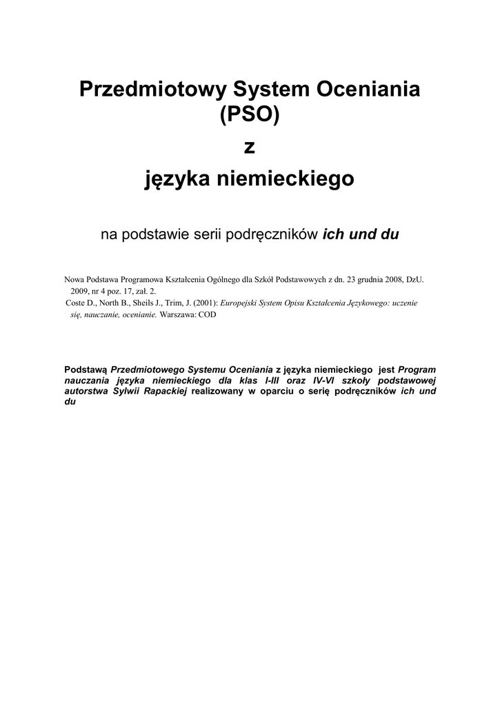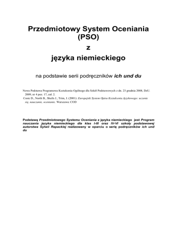 Przedmiotowy System Oceniania (PSO) z języka niemieckiego na podstawie serii podręczników ich und du Nowa Podstawa Programowa Kształcenia Ogólnego dla Szkół Podstawowych z dn. 23 grudnia 2008, DzU. 2009, nr 4 poz. 17, zał. 2. Coste D., North B., Sheils J., Trim, J. (2001): Europejski System Opisu Kształcenia Językowego: uczenie się, nauczanie, ocenianie. Warszawa: COD Podstawą Przedmiotowego Systemu Oceniania z języka niemieckiego jest Program nauczania języka niemieckiego dla klas I-III oraz IV-VI szkoły podstawowej autorstwa Sylwii Rapackiej realizowany w oparciu o serię podręczników ich und du Ogólne zasady oceniania Zgodnie z programem nauczania oraz w oparciu o Wewnątrzszkolny System Oceniania nauczyciel, dokonujący oceny wiedzy i umiejętności ucznia na lekcji języka niemieckiego uwzględnia następujące wskazówki: • Wiedza i umiejętności uczniów są sprawdzane możliwie jak najczęściej, np. po każdej przeprowadzonej lekcji, po szeregu lekcji na dany temat lub po zakończeniu kolejnego rozdziału w podręczniku. • Kontrola wiedzy i umiejętności uczniów przyjmuje dwie formy: pisemną i ustną, dzięki czemu uczeń ma możliwość otrzymania pełnej i systematycznej informacji na temat przebiegu swojego procesu uczenia się. • Ocenianie opanowanego materiału przez ucznia umożliwia włączenie ucznia w proces oceniania wyników własnej nauki, poprzez wprowadzenie takich form pracy i autoewaluacji, jak: portfolio językowe, różnorodne projekty, regularne wypełnianie testów przeznaczonych do samooceny. • W ocenie różnorodnej pracy projektowej, jak: projekty językowe i realioznawcze, klasowe i międzyklasowe konkursy recytatorskie i piosenki, sztuki teatralne, projekty internetowe i in. pod uwagę bierze się w znacznym stopniu zaangażowanie uczniów w wykonywane zadanie. • Ocenie podlega również umiejętność dokonywania autokontroli i oceny własnego uczenia się poprzez rozwiązywanie testów samooceny i tworzenie portfolio językowego. Ocena tych umiejętności uzupełnia ocenę kompetencji językowej ucznia. • Praca w grupie, w której uczeń realizuje projekty, rozwiązuje zadania, prowadzi dialogi, uczestniczy w grach i zabawach językowych, umożliwia dokonanie oceny, zarówno przez nauczyciela, jak również przez uczniów wzajemnie, a jednocześnie jako umiejętność, wchodząca w skład kompetencji kluczowych, podlega ocenie. Kształtuje ona bowiem w uczniu różnorodne kompetencje społeczne. • Podczas lekcji języka niemieckiego oceniana jest również aktywność uczniów. Nauczyciel odnotowuje ją w dzienniku, o czym powiadamia ucznia. Za różne formy aktywności ucznia, jak: dobrowolne zgłaszanie się do odpowiedzi, samodzielne wykonywanie dodatkowych zadań, pomoc innym uczniom w rozwiązywaniu zadań, rozumieniu zagadnień i ćwiczeniu sprawności językowej, pomoc w organizowaniu projektów językowych, gier i zabaw itp., mogą być przyznawane plusy (3 plusy – ocena bardzo dobra). • Udział w konkursach przedmiotowych, w zależności od uzyskanych wyników, wpływa na podwyższenie oceny końcowej. • Ocena końcowa jest wystawiana na podstawie ocen cząstkowych za każdą sprawność językową: rozumienie ze słuchu, mówienie, czytanie ze zrozumieniem i pisanie. Mogą być one sprawdzane za pomocą następujących form: • odpowiedź ustna • aktywność na lekcji • zadania domowe • kartkówka z aktualnego materiału • praca klasowa z poszczególnych rozdziałów tematycznych • Pisemne formy testów i sprawdzianów są oceniane zgodnie z wymaganą ilością punktów na daną ocenę według następującej skali: 100% – 90% – ocena bardzo dobra 89% – 75% – ocena dobra 74% – 51% – ocena dostateczna 50% – 31 % – ocena dopuszczająca 30% – 0% – ocena niedostateczna. >Uczeń może uzyskać ocenę celującą ze sprawdzianu, jeśli poprawnie wykona wszystkie zadania, zawarte w teście oraz dodatkowe nieobowiązkowe zadania półotwarte lub otwarte, punktowane dodatkowo. > Zapowiedziane pisemne kartkówki są oceniane według kryteriów ustalonych wcześniej z uczniami. >Niezapowiedziane krótkie formy sprawdzania wiedzy ustala nauczyciel z uczniami po ich odbyciu. >Słownictwo (kartkówki leksyczne) jest sprawdzane według następującej skali: 100 - 90% - ocena bardzo dobra 89 - 79 % - ocena dobra 78 - 65 % - ocena dostateczna 64 - 51 % - ocena dopuszczająca 50 - 0% - ocena niedostateczna > W przypadku ocen końcowych uczeń otrzymuje ocenę z plusem, jeśli spełnia wszystkie wymagania niezbędne do uzyskania oceny niższej oraz niektóre wymagania niezbędne do uzyskania oceny wyższej. > Uczeń może uzyskać ocenę celującą ze sprawdzianu, jeśli poprawnie wykona wszystkie zadania, zawarte w teście oraz dodatkowe nieobowiązkowe zadania półotwarte lub otwarte, punktowane dodatkowo. • W przypadku ocen końcowych uczeń otrzymuje ocenę z plusem, jeśli spełnia wszystkie wymagania niezbędne do uzyskania oceny niższej oraz niektóre wymagania niezbędne do uzyskania oceny wyższej. • W przypadku otrzymania oceny niedostatecznej uczeń ma możliwość jej poprawy. • Uczeń może być dwukrotnie w ciągu semestru nieprzygotowany do zajęć lekcyjnych. W takim przypadku nauczyciel zobowiązany jest odnotować tę informację w dzienniku lekcji. • Nieprzygotowanie do pracy klasowej jest przyjmowane jedynie w przypadku dłuższej choroby lub wydarzeń losowych potwierdzonych przez rodziców (prawnych opiekunów) lub wychowawcę. W przypadku nieobecności ucznia na pracy klasowej, uczeń ma obowiązek napisać ją w wyznaczonym przez nauczyciela terminie, zgodnie z przyjętym przez szkołę Wewnątrzszkolnym Systemem Oceniania. • Poprawianie przez ucznia oceny semestralnej lub końcowej przed końcem semestru lub roku nie jest możliwe. • Brak zdolności artystycznych ucznia, np. w zakresie rysowania, śpiewania, nie ma wpływu na ocenę wykonanego zadania, 