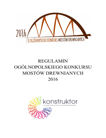 REGULAMIN OGÓLNOPOLSKIEGO KONKURSU MOSTÓW DREWNIANYCH 2016 Regulamin Ogólnopolskiego Konkursu nkursu Mostów Drewnianych 2016 ROZDZIAŁ I – Postanowienia ogólne Organizator §1 Organizatorem II Ogólnopolskiego Konkursu Mostów Drewnianych, zwanego dalej Konkursem, jest Studenckie Koło Naukowe Konstruktor działające przy Wydziale Budownictwa i Inżynierii Środowiska Politechniki Białostockiej, Białostockiej zwane dalej Organizatorem. Regulamin §2 1. Zasady Konkursu określa niniejszy Regulamin Konkursu. 2. Regulamin Konkursu opublikowany jest na stronie tronie internetowej http://konstruktor.wb.pb.edu.pl/ 3. Nie zastosowanie się do któregokolwiek z punktów regulaminu może przyczynić się do dyskwalifikacji drużyny. Czas i miejsce §3 Konkurs odbędzie się w dniach 16-18.11.2016r. roku na terenie kampusu Politechniki Białostockiej. Uczestnicy §4 1. Uczestnikami Konkursu są wszyscy członkowie, zgłoszonych Drużyn Drużyn. 2. W Konkursie mogą uczestniczyć wyłącznie osoby pełnoletnie będące studentami szkół wyższych studiów pierwszego i drugiego stopnia. 1. 2. 3. 4. 5. Drużyna §5 W skład Drużyny wchodzi maksymalnie pięciu Uczestników. Uczestnik może być członkiem tylko jednej Drużyny. Drużyna może posiadać Opiekuna, który jest pracownikiem nikiem naukowym lub doktorantem uczelni, na której studiuje większość członków Drużyny. Drużyna musi wybrać Kapitana. Dopuszcza się aby w jednej Drużynie byli studenci z różnych uczelni. -2- Regulamin Ogólnopolskiego Konkursu nkursu Mostów Drewnianych 2016 ROZDZIAŁ II – Etapy Ogólnopolskiego Konkursu Mostów Drewnianych Informacje ogólne §6 1. Konkurs podzielony jest na etapy odbywające się w następującej kolejności - Etap Eliminacyjny,, a następnie Etap Konkursowy. 2. Etap Eliminacyjny polega na wyłonieniu spośród wszystkich zgłoszonych drużyn, tych zakwalifikowanych do Etapu Konkursowego. 3. Etap Konkursowy składa się z trzech podetapów – Etapu Wykonania Konstrukcji Konstrukcji, Etapu Montażowego i Etapu Etap Obciążeniowego. 1. 2. 3. 4. 5. 6. 7. 8. 1 Etap Eliminacyjny §7 Każda z Drużyn ma obowiązek obowiązek do dnia 09.10.2016r. włącznie wypełnić i wysłać na adres [email protected] [email protected] z tytułem 'II OKMD - rejestracjja' skan Formularza Zgłoszeniowego (Zał. 7), 7 lub oryginał wysłać pocztą1 na adres: Dr inż. Barbara Sadowska-Buraczewska Sadowska ul. Wiejska 45E 15-351 Białystok W Etapie Eliminacyjnym biorą udział wszystkie drużyny, które wypełniły Formularz Zgłoszeniowy oraz przesłały gotowe projekty wykonawcze mostów do dnia 23.10.2016r.. włącznie. włącznie Przebieg: a. Kontrola projektów pod względem zgodności z Regulamin Regulaminu Konkursu, dokonywana przez Komisję Sędziowską (patrz patrz Rozdział III Regulaminu Konkursu), b. Wyłonienie Drużyn, D które wezmą udział w Etapie Konkursowym Konkursowym. (W przypadku dużej ilości poprawnych zgłoszeń, zg pierwszeństwo mają te z wcześniejszą datą złożenia). złożenia) Do Etapu Konkursowego zostanie zakwalifikowanych maksymalnie 12 Drużyn. Drużyny zakwalifikowane zakwalifikowan do Etapu Konkursowego zostaną ogłoszone do dnia 30.10.2016r. .2016r. włącznie. Zakwalifikowane Drużyny są zobligowane do uiszczenia szczenia opłaty wpisowego w wysokości 1000 zł na konto podane przez Organizatora w terminie 5 dni roboczych od daty ogłoszenia Drużyn rużyn zakwalifikowanych do Etapu Konkursowego Konkursowego. Wycofanie się z Konkursu po wpłaceniu wpisowego skutkuje utratą pieniędzy. Konkurs nie odbędzie się, jeżeli zgłosi się mniej niż 5 drużyn. W przypadku rozwiązania konkursu kwota wpisowego jest zwracana. Formularz zgłoszeniowy może zostać nadany pocztą najpóźniej 10.10.2016r. (wg daty sstempla) -3- Regulamin Ogólnopolskiego Konkursu nkursu Mostów Drewnianych 2016 1. 2. 3. 4. 5. 1. 2. 3. 4. Etap Wykonania Konstrukcji §8 Biorą w nim udział Drużyny, które przeszły Etap Eliminacyjny. Przebieg: wykonanie konstrukcji w zakładzie prefabrykacji zgodnie z nadesłanymi projektami wykonawczymi. Prefabrykację mostów zapewnia Organizator. Konstrukcje zostaną wykonane w firmie Podlaskie Centrum Budownictwa Pasywnego sp. z o.o. Organizator nie ponossi odpowiedzialności za błędy wykonawcze ellementów. Etap Montażowy §9 Biorą w nim udział Drużyny, które przeszły Etap Eliminacyjny. Drużyny zobowiązane są do przestrzegania zasad zasad BHP oraz używania odzieży ochronnej dostarczonej przez Organizatora (rękawice oraz okulary ochronne). Etap Montażowy przeprowadzany jest przez Komisję Sędziowską. Przebieg: a. Montaż konstrukcji w ściśle ustalonym czasie i miejscu, b. Sprawdzenie zgodności skrajni z Załącznikiem nr 1, Etap Obciążeniowy § 10 1. Biorą w nim udział Drużyny, które przeszły Etap Montażowy. 2. Przebieg: obciążanie Mostu zgodnie z Załącznikiem 1 oraz 2. 3. Drużyna otrzymuje punkty zgodnie z §21. ROZDZIAŁ III – Komisja Sędziowska Skład § 11 1. Komisję Sędziowską tworzą: tworzą a. przedstawicielee Katedry Konstrukcji Budowlanych Wydziału Budownictwa i Inżynierii Środowiska Politechniki Białostockiej, w tym jeden pełniący funkcję Przewodniczącego Komisji, b. jeden z członków Organizatora pełniący funkcje Sekretarza Komisji Sędziowskiej, c. inni członkowie Organizatora, Organizatora d. inni pracownicy/pracownicy racownicy/pracownicy naukowi Politechniki Białostockiej, e. przedstawiciele sponsorów. 2. W składzie Komisji Sędziowskiej Sędziowsk musi znaleźć się co najmniej 5 osób. 3. Skład Komisji Sędziowskiej Sędziowsk zostanie ogłoszony najpóźniej tydzień przed Konkursem. -4- Regulamin Ogólnopolskiego Konkursu nkursu Mostów Drewnianych 2016 Kompetencje § 12 1. Do kompetencji Komisji Komisj Sędziowskiej należy: a. Obiektywna ocena nadesłanych projektów pod kątem zgodności z Regulaminem Konkursu, b. Wyłonienie drużyn, które przechodzą do da