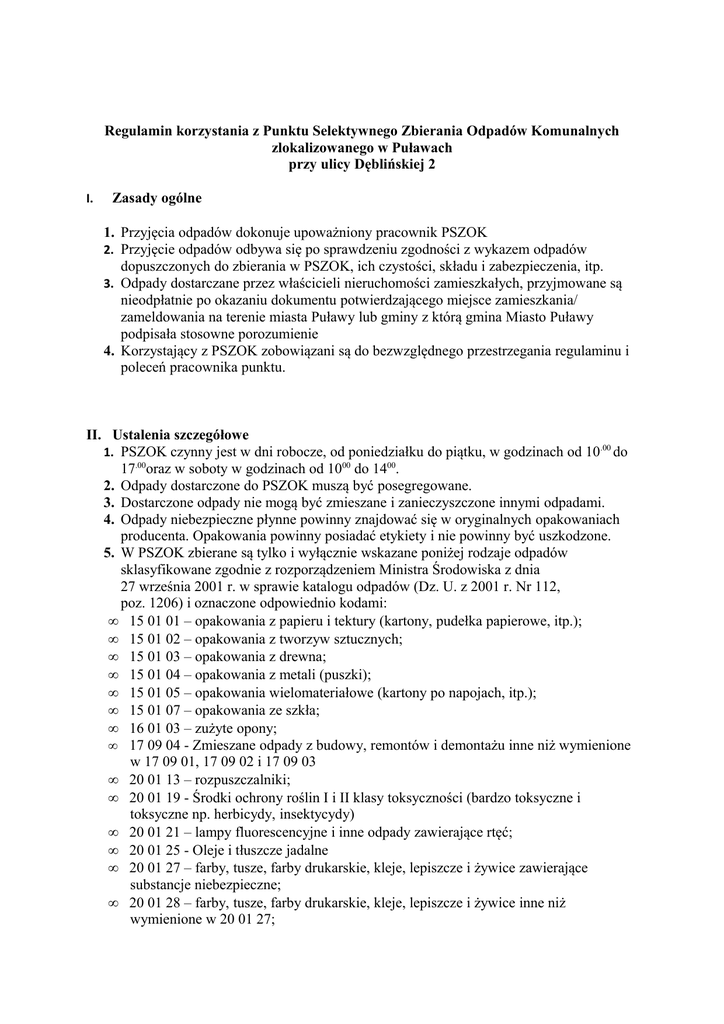 Regulamin korzystania z Punktu Selektywnego Zbierania Odpadów Komunalnych zlokalizowanego w Puławach przy ulicy Dęblińskiej 2 I. Zasady ogólne 1. Przyjęcia odpadów dokonuje upoważniony pracownik PSZOK 2. Przyjęcie odpadów odbywa się po sprawdzeniu zgodności z wykazem odpadów dopuszczonych do zbierania w PSZOK, ich czystości, składu i zabezpieczenia, itp. 3. Odpady dostarczane przez właścicieli nieruchomości zamieszkałych, przyjmowane są nieodpłatnie po okazaniu dokumentu potwierdzającego miejsce zamieszkania/ zameldowania na terenie miasta Puławy lub gminy z którą gmina Miasto Puławy podpisała stosowne porozumienie 4. Korzystający z PSZOK zobowiązani są do bezwzględnego przestrzegania regulaminu i poleceń pracownika punktu. II. Ustalenia szczegółowe 1. PSZOK czynny jest w dni robocze, od poniedziałku do piątku, w godzinach od 10.00 do 17.00oraz w soboty w godzinach od 1000 do 1400. 2. Odpady dostarczone do PSZOK muszą być posegregowane. 3. Dostarczone odpady nie mogą być zmieszane i zanieczyszczone innymi odpadami. 4. Odpady niebezpieczne płynne powinny znajdować się w oryginalnych opakowaniach producenta. Opakowania powinny posiadać etykiety i nie powinny być uszkodzone. 5. W PSZOK zbierane są tylko i wyłącznie wskazane poniżej rodzaje odpadów sklasyfikowane zgodnie z rozporządzeniem Ministra Środowiska z dnia 27 września 2001 r. w sprawie katalogu odpadów (Dz. U. z 2001 r. Nr 112, poz. 1206) i oznaczone odpowiednio kodami: • 15 01 01 – opakowania z papieru i tektury (kartony, pudełka papierowe, itp.); • 15 01 02 – opakowania z tworzyw sztucznych; • 15 01 03 – opakowania z drewna; • 15 01 04 – opakowania z metali (puszki); • 15 01 05 – opakowania wielomateriałowe (kartony po napojach, itp.); • 15 01 07 – opakowania ze szkła; • 16 01 03 – zużyte opony; • 17 09 04 - Zmieszane odpady z budowy, remontów i demontażu inne niż wymienione w 17 09 01, 17 09 02 i 17 09 03 • 20 01 13 – rozpuszczalniki; • 20 01 19 - Środki ochrony roślin I i II klasy toksyczności (bardzo toksyczne i toksyczne np. herbicydy, insektycydy) • 20 01 21 – lampy fluorescencyjne i inne odpady zawierające rtęć; • 20 01 25 - Oleje i tłuszcze jadalne • 20 01 27 – farby, tusze, farby drukarskie, kleje, lepiszcze i żywice zawierające substancje niebezpieczne; • 20 01 28 – farby, tusze, farby drukarskie, kleje, lepiszcze i żywice inne niż wymienione w 20 01 27; • • • • • • • • • • • • 6. 7. 8. 20 01 29 - Detergenty zawierające substancje niebezpieczne 20 01 30 - Detergenty inne niż wymienione w 20 01 29 20 01 31 – leki cytotoksyczne i cytostatyczne; 20 01 32 – leki inne niż wymienione w 20 01 31; 20 01 33 – Baterie i akumulatory łącznie z bateriami i akumulatorami wymienionymi w 16 06 01, 16 06 02 lub 16 06 03 oraz nie sortowane baterie i akumulatory zawierające te baterie; 20 01 34 – baterie i akumulatory inne niż wymienione w 20 01 33; 20 01 35 – zużyte urządzenia elektryczne i elektroniczne inne niż wymienione 20 01 36 – zużyte urządzenia elektryczne i elektroniczne inne niż wymienione w 20 01 21, 20 01 23 i 20 01 35; 20 01 80 – środki ochrony roślin inne niż wymienione w 20 01 19; 20 02 01 – odpady ulegające biodegradacji (gałęzie, liście, skoszona trawa). 20 03 07 - Odpady wielkogabarytowe 20 03 99 Odpady komunalne niewymienione w innych podgrupach (popiół) Dostarczający odpady zobowiązany jest do natychmiastowego zabrania odpadów w przypadku: stwierdzenia przez pracownika PSZOK-u, iż odpady dostarczone nie znajdują się na wykazie odpadów aktualnie przyjmowanych, stwierdzenia zanieczyszczeń i zabrudzeń w dostarczonych odpadach, stwierdzenia braku możliwości identyfikacji odpadów niebezpiecznych. Do PSZOK nie są przyjmowane następujące rodzaje odpadów: • odpady zawierające azbest • zmieszane odpady komunalne • części samochodowe Każdorazowe przyjęcie odpadów do PSZOK potwierdzane jest na formularzu przyjęcia odpadów. III. Postanowienia końcowe 1. Wszelkich informacji o pracy Punktu udziela pracownik PSZOK-u na miejscu lub pod numerem telefonu 81886 20 18 wew. 105 lub 106. 2. Regulamin korzystania z Punktu Selektywnego Zbierania Odpadów Komunalnych jest dostępny na stronie internetowej ZUK www.zuk.pulawy.pl i Urzędu Miasta Puławy www.um.pulawy.pl 3. Osoby przebywające na terenie PSZOK obowiązane są do: • przestrzegania zaleceń obsługi PSZOK, w szczególności w zakresie miejsca złożenia odpadów oraz sposobu poruszania się po PSZOK; • zachowania wymogów bezpieczeństwa, w szczególności nieużywania źródeł otwartego ognia; • zachowania kierunku przemieszczania się wynikającego z oznaczeń; • stosowania się do ogólnych zasad ruchu drogowego.