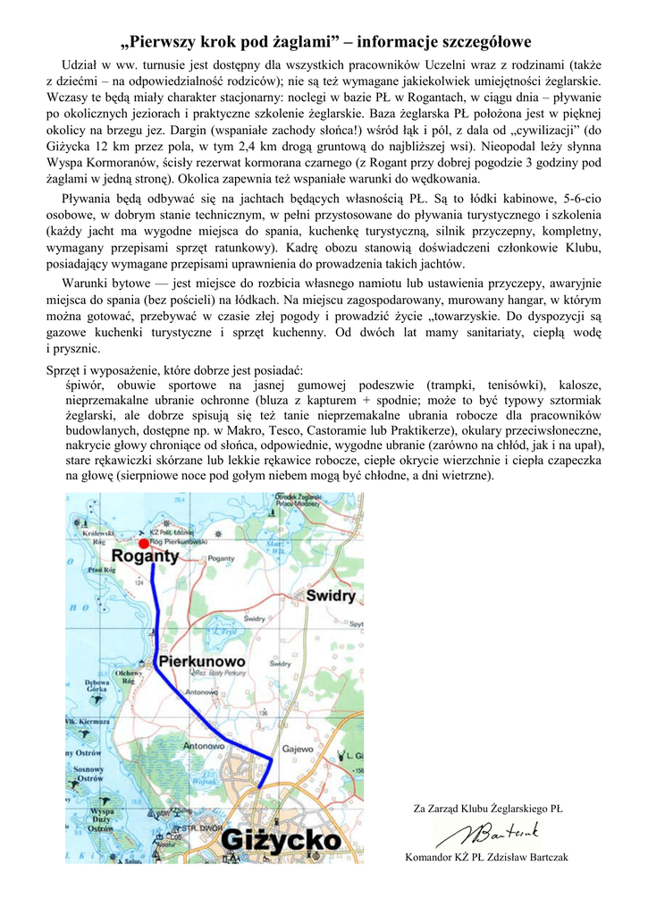 „Pierwszy krok pod Ŝaglami” – informacje szczegółowe Udział w ww. turnusie jest dostępny dla wszystkich pracowników Uczelni wraz z rodzinami (takŜe z dziećmi – na odpowiedzialność rodziców); nie są teŜ wymagane jakiekolwiek umiejętności Ŝeglarskie. Wczasy te będą miały charakter stacjonarny: noclegi w bazie PŁ w Rogantach, w ciągu dnia – pływanie po okolicznych jeziorach i praktyczne szkolenie Ŝeglarskie. Baza Ŝeglarska PŁ połoŜona jest w pięknej okolicy na brzegu jez. Dargin (wspaniałe zachody słońca!) wśród łąk i pól, z dala od „cywilizacji” (do GiŜycka 12 km przez pola, w tym 2,4 km drogą gruntową do najbliŜszej wsi). Nieopodal leŜy słynna Wyspa Kormoranów, ścisły rezerwat kormorana czarnego (z Rogant przy dobrej pogodzie 3 godziny pod Ŝaglami w jedną stronę). Okolica zapewnia teŜ wspaniałe warunki do wędkowania. Pływania będą odbywać się na jachtach będących własnością PŁ. Są to łódki kabinowe, 5-6-cio osobowe, w dobrym stanie technicznym, w pełni przystosowane do pływania turystycznego i szkolenia (kaŜdy jacht ma wygodne miejsca do spania, kuchenkę turystyczną, silnik przyczepny, kompletny, wymagany przepisami sprzęt ratunkowy). Kadrę obozu stanowią doświadczeni członkowie Klubu, posiadający wymagane przepisami uprawnienia do prowadzenia takich jachtów. Warunki bytowe — jest miejsce do rozbicia własnego namiotu lub ustawienia przyczepy, awaryjnie miejsca do spania (bez pościeli) na łódkach. Na miejscu zagospodarowany, murowany hangar, w którym moŜna gotować, przebywać w czasie złej pogody i prowadzić Ŝycie „towarzyskie. Do dyspozycji są gazowe kuchenki turystyczne i sprzęt kuchenny. Od dwóch lat mamy sanitariaty, ciepłą wodę i prysznic. Sprzęt i wyposaŜenie, które dobrze jest posiadać: śpiwór, obuwie sportowe na jasnej gumowej podeszwie (trampki, tenisówki), kalosze, nieprzemakalne ubranie ochronne (bluza z kapturem + spodnie; moŜe to być typowy sztormiak Ŝeglarski, ale dobrze spisują się teŜ tanie nieprzemakalne ubrania robocze dla pracowników budowlanych, dostępne np. w Makro, Tesco, Castoramie lub Praktikerze), okulary przeciwsłoneczne, nakrycie głowy chroniące od słońca, odpowiednie, wygodne ubranie (zarówno na chłód, jak i na upał), stare rękawiczki skórzane lub lekkie rękawice robocze, ciepłe okrycie wierzchnie i ciepła czapeczka na głowę (sierpniowe noce pod gołym niebem mogą być chłodne, a dni wietrzne). Za Zarząd Klubu śeglarskiego PŁ Komandor Kś PŁ Zdzisław Bartczak