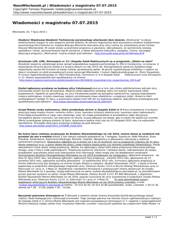 NaszWłocławek.pl | Wiadomości z magistratu 07.07.2015 Copyright Tomasz Popowski [email protected] http://www.naszwloclawek.pl/wiadomosci-z-magistratu-07-07-2015 Wiadomości z magistratu 07.07.2015 Włocławek, dn. 7 lipca 2015 r. - Studenci Wojskowej Akademii Technicznej wyremontują włocławski dom dziecka „Workcamp” to obozy wolontariackie mające na celu wsparcie domów dziecka. W ramach tegorocznej akcji warszawscy studenci budownictwa wyremontują Dom Dziecka im. księdza Biskupa Wojciecha Owczarka przy ulicy Leśnej 2a, prowadzony przez Caritas Diecezji Włocławskiej. W czasie wizyty uczestników programu w placówce, zdecydowano, że wymienione zostaną wykładziny i drzwi, wyremontowane kąciki sanitarne, a także odnowione kaloryfery, parapety i ściany. Szczegóły dotyczące programu „Workcamp” można znaleźć pod adresem: http://mk-pzitb.waw.pl/?p=674#more-674 - Uczniowie LZK, LMK, Gimnazjum nr 12 i Zespołu Szkół Elektrycznych są w programie „Zdolni na start” Wysokość wsparcia udzielanego przez zarząd województwa kujawsko-pomorskiego to 350 zł miesięcznie, co oznacza, iż stypendysta otrzyma łącznie kwotę 4,2 tysiąca złotych za cały 2015 rok. Wynagrodzenie opiekuna dydaktycznego stypendysty wynosi 80 zł brutto za każdy miesiąc sprawowanej opieki. W gronie najzdolniejszej młodzieży z regionu są obecni uczniowie ze szkół prowadzonych przez samorząd Włocławka: I Liceum Ogólnokształcącego im. Ziemi Kujawskiej, III Liceum Ogólnokształcącego im. Marii Konopnickiej, Technikum nr 4 w Zespole Szkół Elektrycznych oraz Gimnazjum nr 12. Wykaz stypendystów jest opublikowany na stronie: http://www.kujawsko-pomorskie.pl/pliki/wiadomosci/20150618_stypendia/Lista_stypendystow_2015.pdf - Został ogłoszony przetarg na budowę ulicy Celulozowej Jeszcze w tym roku blisko półkilometrowy odcinek ulicy Celulozowej zmieni się nie do poznania. Właśnie został ogłoszony przetarg, który ma wyłonić wykonawcę robót budowlanych. Zgodnie ze specyfikacją, na ulicy Celulozowej pojawi się porządna nawierzchnia, zostaną wybudowane miejsca parkingowe, ścieżka rowerowa, będzie zainstalowane nowe oświetlenie i urządzone zieleń. Otwarcie ofert przetargowych nastąpi 21 lipca, a wykonawca będzie miał 105 dni na realizację zadania. Specyfikacja przetargowa jest opublikowana pod adresem: http://www.wloclawek.pl/zamowienia/16_509.html - Urząd Miasta szuka wykonawcy, który przebuduje atrium w Zespole Szkół nr 4 Prace prowadzone w budynku dotyczyły będą między innymi: remontu sufitu i ścian, wymiany instalacji elektrycznej i wymiany okien balkonowych. Prace będą prowadzone w ciągu roku szkolnego, więc nie mogą przeszkadzać w prowadzeniu zajęć lekcyjnych. Szczególnie głośne czynności, jak wiercenie czy kłucie, muszą odbywać się wtedy, gdy w szkole nie będzie już uczniów. Oferty przetargowe zostaną otwarte 16 lipca, wykonawca będzie miał czas do 31 listopada 2015 roku na wykonanie zamówienia. Szczegóły dotyczące przetargu znajdują się pod adresem: http://www.wloclawek.pl/g2/2015_07/9098_fileot.html - Do końca lipca czekamy propozycje do Budżetu Obywatelskiego na rok 2016, można złożyć je osobiście lub przesłać do nas e-mailem Kwota 3 mln złotych zostanie podzielona na 7 okręgów: Zazamcze, Małe Południe, Duże Południe, Śródmieście, Kazimierza Wielkiego, Michelin, Zawiśle. Mieszkańcy w głosowaniu zdecydują o wyborze konkretnych propozycji. Głosowanie odbędzie się w dniach od 1 do 15 września, zaś na propozycje czekamy do 31 lipca. Warto zawalczyć m.in. o place zabaw dla dzieci, nowe miejsca wypoczynku czy remonty osiedlowej infrastruktury. Każdy włocławianin może złożyć swoją propozycję. Ważne, by zgłaszający złożył tylko jedną propozycję dotyczącej jednego okręgu, wraz z listą 5 osób popierających. Propozycję wystarczy starannie i ciekawie opisać, zaproponować jej nazwę, przedstawić szacunkowy koszt oraz ewentualnie inne informacje, które mogą stać się dodatkowym atrybutem. Harmonogram Budżetu Obywatelskiego Włocławka na rok 2016 przedstawia się następująco: zgłaszanie propozycji – do dnia 31 lipca 2015 roku, weryfikacja zgłoszeń i ogłoszenie listy propozycji - sierpień 2015 roku, głosowanie do 15 września 2015 roku, ogłoszenie wyników głosowania - 15 października 2015 roku. Formularz zgłaszania propozycji w formie elektronicznej jest dostępny na stronie Urzędu Miasta w zakładce „Budżet Obywatelski 2016”, a także w formie papierowej w budynkach włocławskiego magistratu przy: Zielonym Rynku 11/13 w Biurze Obsługi Mieszkańców, przy ul. Kościuszki 12 i przy ul. 3 Maja 22. Wypełnione i kompletne formularze z propozycjami można dostarczać do Urzędu Miasta Włocławek na 3 sposoby: drogą elektroniczną na adres: [email protected], za pośrednictwem poczty poprzez wysłanie na adres: Urząd Miasta Włocławek, Zielony Rynek 11/13, 87-800 Włocławek, z dopiskiem: Budżet Obywatelski Miasta Włocławek na rok 2016, poprzez wrzucenie do urny wystawionej w budynkach Urzędu Miasta Włocławek przy: Zielonym Rynku 11/13, ul. Kościuszki 12 i przy ul. 3 Maja 22. W razie jakichkolwiek pytań i wątpliwości dotyczących Budżetu Obywatelskiego Miasta Włocławek na rok 2016 prosimy o kontakt: e-mail: [email protected], telefon : 54 414 40 45, 54 414 43 89 (poniedziałek, środa, czwartek: 7.30-15.30, wtorek od 7.30 – 17.00, piątek 7.30 – 14.00). - Baczyński patronem Gimnazjum nr 7 Wniosek o nadanie szkole imienia Krzysztofa Kamila Baczyńskiego złożyli rodzice, Rada Pedagogiczna i Samorząd Uczniowski. Tego samego patrona ma również liceum ogólnokształcące należące do Zespołu Szkół nr 4. Gmina Miasto Włocławek jest organem prowadzącym Gimnazjum nr 7 i zgodnie z rozporządzeniem Ministra Edukacji nadaje szkole imię. Inicjatywa rodziców, uczniów i nauczycieli spotkała się z poparciem Rady Miasta i w p