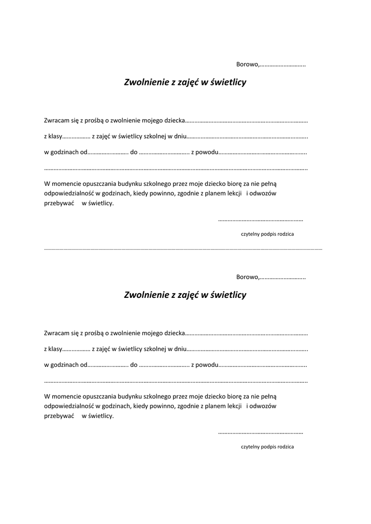 Borowo,……………………….. Zwolnienie z zajęć w świetlicy Zwracam się z prośbą o zwolnienie mojego dziecka…………………………………………………………………… z klasy……………… z zajęć w świetlicy szkolnej w dniu………………………………………………………………….. w godzinach od…………………….. do ………………………….. z powodu……………………………………………….. ………………………………………………………………………………………………………………………………………………….. W momencie opuszczania budynku szkolnego przez moje dziecko biorę za nie pełną odpowiedzialność w godzinach, kiedy powinno, zgodnie z planem lekcji i odwozów przebywać w świetlicy. ……………………………………………… czytelny podpis rodzica ……………………………………………………………………………………………………………………………………………………………………………………………… Borowo,……………………….. Zwolnienie z zajęć w świetlicy Zwracam się z prośbą o zwolnienie mojego dziecka…………………………………………………………………… z klasy……………… z zajęć w świetlicy szkolnej w dniu………………………………………………………………….. w godzinach od…………………….. do ………………………….. z powodu……………………………………………….. ………………………………………………………………………………………………………………………………………………….. W momencie opuszczania budynku szkolnego przez moje dziecko biorę za nie pełną odpowiedzialność w godzinach, kiedy powinno, zgodnie z planem lekcji i odwozów przebywać w świetlicy. ……………………………………………… czytelny podpis rodzica