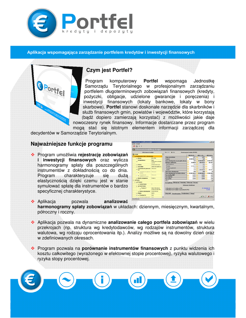 Czym jest Portfel? Program komputerowy Portfel wspomaga Jednostk Samorz du Terytorialnego w profesjonalnym zarz dzaniu portfelem długoterminowych zobowi za finansowych (kredyty, po yczki, obligacje, udzielone gwarancje i por czenia) i inwestycji finansowych (lokaty bankowe, lokaty w bony skarbowe). Portfel stanowi doskonałe narz dzie dla skarbników i słu b finansowych gmin, powiatów i województw, które korzystaj (b d dopiero zamierzaj korzysta ) z mo liwo ci jakie daje nowoczesny rynek finansowy. Informacje dostarczane przez program mog sta si istotnym elementem informacji zarz dczej dla decydentów w Samorz dzie Terytorialnym. Najwa niejsze funkcje programu Program umo liwia rejestracj zobowi za i inwestycji finansowych oraz wylicza harmonogramy spłaty dla poszczególnych instrumentów z dokładno ci co do dnia. Program charakteryzuje si du elastyczno ci dzi ki czemu jest w stanie symulowa spłat dla instrumentów o bardzo specyficznej charakterystyce. Aplikacja pozwala analizowa harmonogramy spłaty zobowi za w układach: dziennym, miesi cznym, kwartalnym, półroczny i roczny. Aplikacja pozwala na dynamiczne analizowanie całego portfela zobowi za w wielu przekrojach (np. struktura wg kredytodawców, wg rodzajów instrumentów, struktura walutowa, wg rodzaju oprocentowania itp.). Analizy mo liwe s na dowolny dzie oraz w zdefiniowanych okresach. Program pozwala na porównanie instrumentów finansowych z punktu widzenia ich kosztu całkowitego (wyra onego w efektownej stopie procentowej), ryzyka walutowego i ryzyka stopy procentowej. Program prezentuje u ytkownikowi charakterystyk całego portfela zobowi za m.in. wska nik ryzyka stopy procentowej, ryzyka refinansowania, ryzyka walutowego, redniego kosztu kapitału w portfelu. Program prognozuje przepływy finansowe zawi zane z zarz dzaniem zadłu eniem i umo liwia dzi ki temu łatwiejsze zarz dzanie płynno ci finansow oraz wybór takich terminów spłaty dla nowych instrumentów, które najlepiej wpisuj si harmonogram dotychczasowych płatno ci. Program umo liwia łatwy dost p do umów kredytowych (w formie elektronicznej s one przechowywane w bazie aplikacji) i ewentualnie innych plików zwi zanych z poszczególnymi instrumentami. Portfel zawiera moduł przypominania o płatno ciach niezb dny przy du ej liczbie zobowi za . Dodatkowe zalety Portfel charakteryzuje si łatwo ci obsługi, elastyczno ci oraz przejrzysto ci . Program umo liwia wizualizacj na wykresach wi kszo ci z dost pnych analiz. Dodatkowym ułatwieniem jest mo liwo eksportu danych z programu w formacie MS Excel, HTML b d do plików tekstowych, ewentualna dalsza ich obróbka i wykorzystanie w raportach, prezentacjach b d na stronach internetowych. DS Consulting Sp z o.o. ul. Grunwaldzka 209 80-266 Gda sk tel.: (+4858) 344-44-50 fax: (+4858) 344-44-49 www.dsconsulting.com.pl