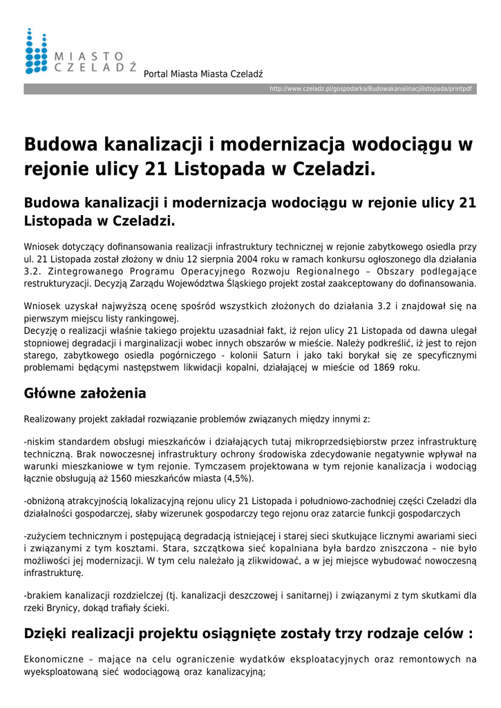 Portal Miasta Miasta Czeladź http://www.czeladz.pl/gospodarka/Budowakanalinacjilistopada/printpdf Budowa kanalizacji i modernizacja wodociągu w rejonie ulicy 21 Listopada w Czeladzi. Budowa kanalizacji i modernizacja wodociągu w rejonie ulicy 21 Listopada w Czeladzi. Wniosek dotyczący dofinansowania realizacji infrastruktury technicznej w rejonie zabytkowego osiedla przy ul. 21 Listopada został złożony w dniu 12 sierpnia 2004 roku w ramach konkursu ogłoszonego dla działania 3.2. Zintegrowanego Programu Operacyjnego Rozwoju Regionalnego – Obszary podlegające restrukturyzacji. Decyzją Zarządu Województwa Śląskiego projekt został zaakceptowany do dofinansowania. Wniosek uzyskał najwyższą ocenę spośród wszystkich złożonych do działania 3.2 i znajdował się na pierwszym miejscu listy rankingowej. Decyzję o realizacji właśnie takiego projektu uzasadniał fakt, iż rejon ulicy 21 Listopada od dawna ulegał stopniowej degradacji i marginalizacji wobec innych obszarów w mieście. Należy podkreślić, iż jest to rejon starego, zabytkowego osiedla pogórniczego - kolonii Saturn i jako taki borykał się ze specyficznymi problemami będącymi następstwem likwidacji kopalni, działającej w mieście od 1869 roku. Główne założenia Realizowany projekt zakładał rozwiązanie problemów związanych między innymi z: -niskim standardem obsługi mieszkańców i działających tutaj mikroprzedsiębiorstw przez infrastrukturę techniczną. Brak nowoczesnej infrastruktury ochrony środowiska zdecydowanie negatywnie wpływał na warunki mieszkaniowe w tym rejonie. Tymczasem projektowana w tym rejonie kanalizacja i wodociąg łącznie obsługują aż 1560 mieszkańców miasta (4,5%). -obniżoną atrakcyjnością lokalizacyjną rejonu ulicy 21 Listopada i południowo-zachodniej części Czeladzi dla działalności gospodarczej, słaby wizerunek gospodarczy tego rejonu oraz zatarcie funkcji gospodarczych -zużyciem technicznym i postępującą degradacją istniejącej i starej sieci skutkujące licznymi awariami sieci i związanymi z tym kosztami. Stara, szczątkowa sieć kopalniana była bardzo zniszczona – nie było możliwości jej modernizacji. W tym celu należało ją zlikwidować, a w jej miejsce wybudować nowoczesną infrastrukturę. -brakiem kanalizacji rozdzielczej (tj. kanalizacji deszczowej i sanitarnej) i związanymi z tym skutkami dla rzeki Brynicy, dokąd trafiały ścieki. Dzięki realizacji projektu osiągnięte zostały trzy rodzaje celów : Ekonomiczne – mające na celu ograniczenie wydatków eksploatacyjnych oraz remontowych na wyeksploatowaną sieć wodociągową oraz kanalizacyjną; Społeczne – ukierunkowane na podwyższenie standardu obsługi mikro- oraz małych i średnich przedsiębiorstw oraz warunków życia mieszkańców w rejonie ulicy 21 Listopada; Ekologiczne – odnoszące się do ochrony środowiska – poprzez stworzenie w rejonie ulicy 21 Listopada systemu kanalizacji zbiorczej, rozdzielczej obejmującej zasięgiem cały rejon, ścieki sanitarne trafiają na oczyszczalnię ścieków, a nie do rzeki Brynicy. Inwestycja rozpoczęła się 15 listopada 2004 roku. Realizował ja na zlecenie gminy Zakład Inżynierii Komunalnej w Czeladzi, będący jednostką budżetową miasta. foto ul. 21 Listopada Odbiór końcowy nastąpił 9 grudnia 2005 roku. W wyniku projektu zrealizowano kanalizację rozdzielczą dla rejonu ulicy 21 Listopada oraz zmodernizowano wodociąg. Wybudowano: 1. 788,5 mb nowej kanalizacji sanitarnej z 29 przyłączami, 2. 1079 mb nowej kanalizacji deszczowej wraz z podczyszczalniami wodociąg o długości 742,5 mb. foto ul. 21 Listopada Częścią projektu było także odtworzenie drogi, chodników i parkingów. Ze względów technicznych wybudowane zostały także nowe przyłącza do budynków mieszkalnych i usługowych. Szczątkowa pokopalniana sieć ogólnospławna uległa likwidacji. Zrealizowane sieci obsługują łącznie teren o powierzchni 19,2 ha i teren ulic 21 Listopada, część ulicy Dehnelów, ul. Powstańców Śląskich oraz Skłodowskiej Curie. Realizacja uzbrojenia w ul. 21 Listopada umożliwia także późniejsze podłączenie terenów i obiektów po dawnej KWK SATURN o łącznej powierzchni 36 ha i dalszą aktywizację gospodarczą Czeladzi. Ogółem zadanie zrealizowano w kwocie 3 577 294,62 zł, z czego: - z Europejskiego Funduszu Rozwoju Regionalnego: 1 804 432,61 zł - z budżetu państwa: 240 591,01 zł Pozostałą część stanowiły środki własne gminy.