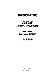 INFORMATOR SZKO£y KURSy i SZKOLENIA Warszawa woj. mazowieckie 2005/2006 ART - PRO marzec 2005 r. 1 w-102 INFORMATOR POWINIEN BYÆ DOSTÊPNY WE WSZYSTKICH SZKO£ACH WARSZAWY I WOJEWÓDZTWA MAZOWIECKIEGO, W KURATORIUM OWIATY, W WYDZIA£ACH EDUKACJI URZÊDÓW. W szko³ach prosimy pytaæ w sekretariatach, u pedagogów szkolnych i w bibliotekach szkolnych. Informacje ogólne o placówkach szkolnych, zaktualizowane zosta³y dziêki pomocy organów administracji terenowej ISBN 83-920756-4-1 Opracowa³ zespó³ redakcyjny Wydawca: ART - PRO Firma Wielobran¿owa 90-002 £ód, ul. Tuwima 28 tel./fax (0-42) 630-23-95, 630-77-56, 639-95-29, 0-605-304-274 e-mail: [email protected] Redakcja nie ponosi odpowiedzialnoci za treæ ofert. Wszelkie prawa zastrze¿one. 2 Nauczycielu! SKONTAKTUJ SIÊ ZE SWOIM PRZEDSTAWICIELEM WSiP S.A. pomo¿e Ci w wyborze podrêcznika w dowolnym czasie odwiedzi Twoj¹ szko³ê zaprezentuje pe³n¹ ofertê WSiP S.A. poinformuje o terminach organizowanych przez nas spotkañ i warsztatów przyjmie zamówienia na podrêczniki dla Twoich uczniów wyrêczy Ciê w formalnociach zwi¹zanych ze z³o¿eniem zamówienia JESTEMY DO TWOJEJ DYSPOZYCJI: PRZEDSTAWICIELE: i-380-2 www.wsip.com.pl Infolinia WSiP: 0 800 220 55 3 SPIS TRECI SPIS TRECI Szko³y Podstawowe Warszawa województwo mazowieckie 5 5 17 Gimnazja Warszawa województwo mazowieckie Gimnazja dla Doros³ych (wybrane) Gimnazja Specjalne (wybrane) 68 68 75 88 88 Szko³y Ponadgimnazjalne Licea Ogólnokszta³c¹ce Warszawa województwo mazowieckie Szko³y Zawodowe Warszawa województwo mazowieckie Szko³y Zawodowe - specjalne (wybrane) 89 89 99 117 117 124 149 Licea Ogólnokszta³c¹ce oraz Szko³y Zawodowe dla Doros³ych Zaoczne i Wieczorowe 149 Szko³y Policealne Warszawa województwo mazowieckie inne województwa 151 151 156 163 Szko³y Wy¿sze magisterskie, in¿ynierskie, licencjackie Warszawa województwo mazowieckie inne województwa studia podyplomowe 164 164 173 177 179 Szkolenia i Kursy -zawodowe -doskonal¹ce -jêzykowe - inne 182 4 SZKO£Y PODSTAWOWE SZKO£Y PODSTAWOWE WARSZAWA Szko³a Podstawowa nr 1 im. Gustawa Morcinka Warszawa, ul. Wilcza 53............tel. 628-86-88 Szko³a Podstawowa nr 22 przy Instytucie Reumatologicznym Warszawa, ul. Spartañska 1,tel. 844-4241 w.306 Szko³a Podstawowa nr 2 Integracyjna im. Jana Paw³a II Warszawa, ul. Or³ów Piastowskich 47 .................................................tel. 667-46-54 Szko³a Podstawowa nr 23 im. E. Szymañskiego Warszawa, ul. Wawelska 48........tel. 825-09-38 Szko³a Podstawowa nr 3 Warszawa, ul. Gociniec 53.......tel. 841-43-26 Szko³a Podstawowa nr 4 im. W. Broniewskiego Warszawa, ul. S³awka 9..............tel. 662-67-80 Szko³a Podstawowa Specjalna Nr 5 Warszawa, ul. Kordeckiego 54 .. tel. 610-34-21 Szko³a Podstawowa nr 25 Warszawa, ul. Grzybowska 35.....tel. 620-39-15 Szko³a Podstawowa nr 26 Warszawa, ul. Miedziana 8..........tel. 620-45-02 Szko³a Podstawowa nr 28 Warszawa, ul. Gocieradowska 18/20 ..................................................tel. 679-65-33 Szko³a Podstawowa Specjalna Nr 6 Warszawa, ul. Tarchomiñska 4 .. tel. 619-05-05 Szko³a Podstawowa nr 29 im. G. Garibaldiego Warszawa, ul. Fabryczna 19........tel. 628-79-92 Szko³a Podstawowa nr 9 im. S. Grota Roweckiego Warszawa, ul. Bia³obrzeska 44...tel. 822-12-61 Szko³a Podstawowa nr 30 Integracyjna Warszawa, ul. Kawêczyñska 2/4..tel. 619-53-82 Szko³a Podstawowa nr 10 im. G. Piramowicza Warszawa, ul. Jasielska 49.........tel. 823-41-97 Szko³a Podstawowa nr 11 im. I Dywizji Kociuszkowskiej Warszawa, ul. Keniga 20............tel. 667-09-27 Szko³a Podstawowa nr 12 im. Powst. l¹skich Warszawa, ul. Górnol¹ska 45.....tel. 628-11-41 Szko³a Podstawowa nr 14 Integracyjna im. Boh. Warszawy Warszawa, ul. Sosnowskiego 10..tel. 662-64-05 Szko³a Podstawowa Specjalna Nr 31 Warszawa, Kobia³ka 49 ............. tel. 733-32-43 Szko³a Podstawowa nr 32 Warszawa, ul. Lewartowskiego 2,tel. 831-08-23 Szko³a Podstawowa nr 33 Warszawa, ul. Cieszyñska 8.........tel. 843-73-46 Szko³a Podstawowa nr 34 im. S. Dubois Warszawa, ul. Kruczkowskiego 12b ..................................................tel. 827-87-25 Szko³a Podstawowa Specjalna Nr 39 Warszawa, Trakt Lubelski 40.....tel. 872-93-67 Szko³a Podstawowa nr 16 Warszawa, ul. Wilczy Dó³ 4 ....... tel. 649-66-02 Szko³a Podstawowa nr 40 Warszawa, ul. Ho¿a 11/15..........tel. 628-50-18 . Szko³a Podstawowa Sportowa nr 21 im. Janusza Kusociñskiego Warszawa, ul. Zuga 16.................tel. 834 21 57 Szko³a Podstawowa nr 41 Integracyjna im. Stanis³awa Staszica Warszawa, ul. Drewniana 8.........tel. 827-87-28 5 SZKO£Y PODSTAWOWE Szko³a Podstawowa nr 42 Warszawa, ul. Balkonowa 2/4.....tel. 811-58-43 Szko³a Podstawowa nr 46 Warszawa, ul. Wa³brzyska 5 .......tel. 843-08-53 Szko³a Podstawowa nr 48 im. A. Próchnika Warszawa, ul. Sempo³owskiej 4..tel. 629-25-15 Szko³a Podstawowa nr 50 Warszawa, ul. Jagielloñska 7.......tel. 619-14-68 Szko³a Podstawowa Specjalna Nr 51 Warszawa, ul. Kominska 7........tel. 621-68-44 Szko³a Podstawowa nr 52 Warszawa, ul. Samarytanka 11/13 .................................................tel. 679-14-45 Szko³a Podstawowa nr 53 im. Mariusza Zaruskiego Warszawa, ul. Rudzka 6....... tel. 833 65 65, fax 833-57-48 e-mail: [email protected] [email protected] http://zaruski.edu.pl wiêcej o naszej szkole w reklamie na stronie kolorowej przed stron¹ tytu³ow¹ Szko³a Podstawowa Sportowa nr 55 Warszawa, ul. Siennicka 40........tel. 810-13-50 Szko³a Podstawowa Specjalna nr 56 Warszawa, ul. Dzia³dowska 1/3...tel. 452-32-94 Szko³a Podstawowa nr 57 im. Czwartaków Armii Ludowej Warszawa, ul. Narbutta 31.........tel. 849-65-48 Szko³a Podstawowa nr 58 Warszawa, ul. Mieszka I 7..........tel. 679-03-43 Szko³a Podstawowa nr 60 Warszawa, ul. Zbaraska 3............tel. 810-28-82 Szko³a Podstawowa nr 61 Integracyjna im. J. Przybosia Warszawa, ul. Bia³obrzeska 27...tel. 822-27-36 TO DOBRY WYBÓR ! 6 w-107 SZKO£Y PODSTAW