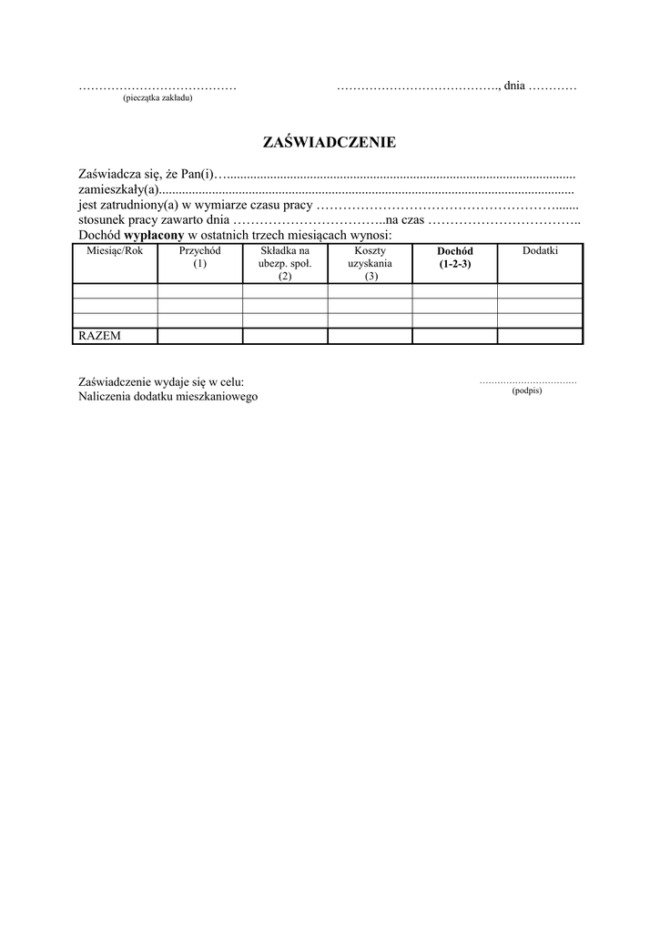 ………………………………… …………………………………., dnia ………… (pieczątka zakładu) ZAŚWIADCZENIE Zaświadcza się, że Pan(i)…......................................................................................................... zamieszkały(a)............................................................................................................................. jest zatrudniony(a) w wymiarze czasu pracy ………………………………………………....... stosunek pracy zawarto dnia ……………………………..na czas …………………………….. Dochód wypłacony w ostatnich trzech miesiącach wynosi: Miesiąc/Rok Przychód (1) Składka na ubezp. społ. (2) Koszty uzyskania (3) Dochód (1-2-3) Dodatki RAZEM Zaświadczenie wydaje się w celu: Naliczenia dodatku mieszkaniowego …………………………… (podpis)