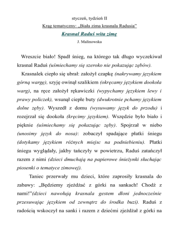 styczeń, tydzień II Krąg tematyczny: „Biała zima krasnala Radusia” Krasnal Raduś wita zimę J. Malinowska Wreszcie biało! Spadł śnieg, na którego tak długo wyczekiwał krasnal Raduś (uśmiechamy się szeroko nie pokazując zębów). Krasnalek ciepło się ubrał: założył czapkę (nakrywamy językiem górną wargę), szyję owinął szalikiem (okręcamy językiem dookoła warg), na ręce założył rękawiczki (wypychamy językiem lewy i prawy policzek), wsunął ciepłe buty (dwukrotnie pchamy językiem dolne zęby). Wyszedł z domu (wysuwamy język do przodu) i rozejrzał się dookoła (kręcimy językiem). Wszędzie było biało i pięknie (uśmiechamy się pokazując zęby). Spojrzał w niebo (unosimy język do nosa): zobaczył spadające płatki śniegu (dotykamy językiem różnych miejsc na podniebieniu). Płatki śniegu wyglądały, jakby tańczyły w powietrzu, Raduś zatańczył razem z nimi (dzieci dmuchają na papierowe śnieżynki słuchając piosenki o tematyce zimowej). Taniec przerwały mu dzieci, które zaprosiły krasnala do zabawy: „Będziemy zjeżdżać z górki na sankach! Chodź z nami!”(dzieci nawołują krasnala gestem dłoni jednocześnie przesuwając językiem od zewnątrz do środka buzi). Raduś z radością wskoczył na sanki i razem z dziećmi zjeżdżał z górki na dół (otwierając szeroko buzię, przesuwamy językiem od górnych zębów po podniebieniu do tyłu; czynność powtarzamy kilkakrotnie). Na koniec wspólnie ulepiono bałwana. Krasnalek z dziećmi utoczyli trzy śnieżne kule: małą, większą i największą (trzykrotnie nadymamy policzki, stopniowo zwiększając ich objętość). Nałożyli kule na siebie (dotykamy najpierw dolnej wargi, potem górnej, następnie sięgamy wysoko do nosa). Dodali bałwankowi węgielkowe oczy (dotykamy językiem górnego lewego i prawego siekacza), marchewkowy nos (wysuwamy wąski język z buzi) oraz kamienne guziczki (dotykamy każdego górnego zęba po kolei). Bałwanek pięknie się uśmiechnął i uśmiecha się tak do dziś (uśmiechamy się jak najpiękniej). To był naprawdę wspaniały dzień, pełen wrażeń.