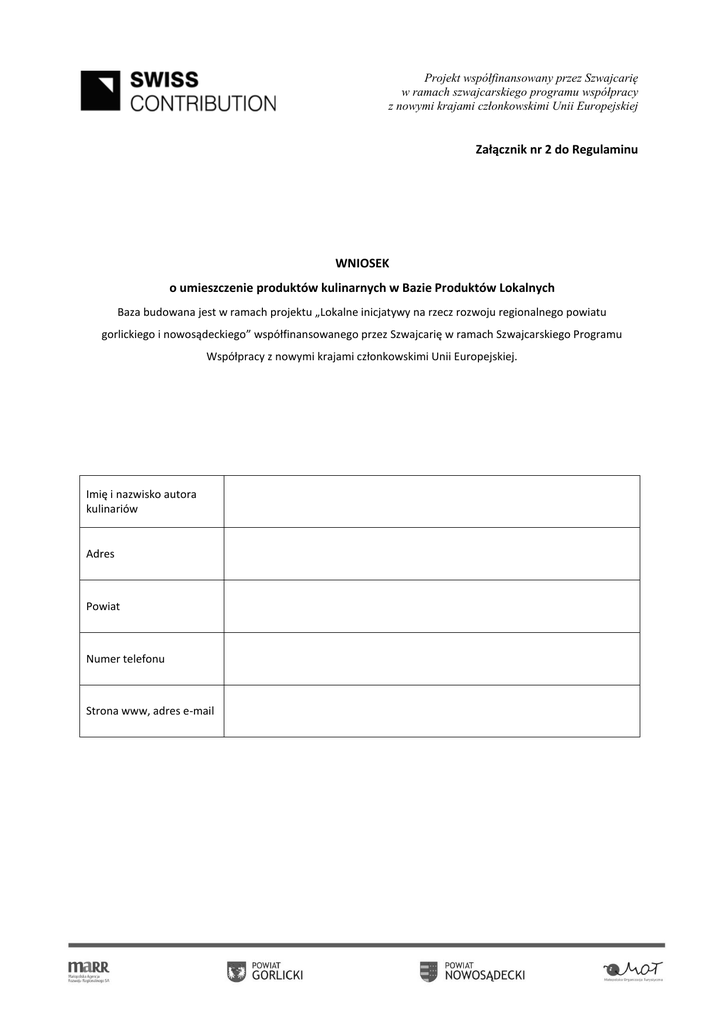 Projekt współfinansowany przez Szwajcarię w ramach szwajcarskiego programu współpracy z nowymi krajami członkowskimi Unii Europejskiej Załącznik nr 2 do Regulaminu WNIOSEK o umieszczenie produktów kulinarnych w Bazie Produktów Lokalnych Baza budowana jest w ramach projektu „Lokalne inicjatywy na rzecz rozwoju regionalnego powiatu gorlickiego i nowosądeckiego” współfinansowanego przez Szwajcarię w ramach Szwajcarskiego Programu Współpracy z nowymi krajami członkowskimi Unii Europejskiej. Imię i nazwisko autora kulinariów Adres Powiat Numer telefonu Strona www, adres e-mail Projekt współfinansowany przez Szwajcarię w ramach szwajcarskiego programu współpracy z nowymi krajami członkowskimi Unii Europejskiej data zgłoszenia…………………………………… ZGŁASZANA POTRAWA/PRODUKT KULINARNY Nazwa potrawy Pochodzenie potrawy Opis potrawy Ścieżka – kategoria do której należy przyporządkować potrawę Zaznaczyć właściwe Dania z fasoli i grochu Wypieki, desery Zupy Dania z ziemniaków Napoje alkoholowe i bezalkoholowe Miody, przetwory, potrawy z miodem Dania z kapustą Kluski, pierogi, placki Grzyby Dania i dodatki mięsne, ryby Owoce, przetwory Wyroby garmażeryjne Nabiał Niniejszym potwierdzam, że wszystkie podane informacje są prawdziwe i gotowe do zamieszczenia na stronie internetowej. Wyrażam zgodę na ich zamieszczenie na stronie internetowej „Wirtualna Mapa Produktów Lokalnych”. ……………………………………………………… Własnoręczny podpis Wyrażam zgodę na przetwarzanie przez Powiat Nowosądecki - Powiatowe Centrum Funduszy Europejskich z siedzibą w Nowym Sączu, 33-330 Nowy Sącz, ul. Barbackiego 89, moich danych osobowych dla potrzeb niezbędnych do realizacji strony internetowej „Wirtualna Mapa Produktów Lokalnych” (zgodnie z Ustawą z dnia 29.08.1997 r. o ochronie danych osobowych, Dz. U. z 2002 r. Nr 101, poz. 926 z późn. zm). Jednocześnie oświadczam, że zostałam/em poinformowana/ny, że Powiat Nowosądecki - Powiatowe Centrum Funduszy Europejskich z siedzibą w Nowym Sączu, 33-330 Nowy Sącz, ul. Barbackiego 89, jest administratorem danych osobowych, że dane te będą przetwarzane w celu realizacji strony internetowej „Wirtualna Mapa Produktów Lokalnych” oraz, że moje dane osobowe będą przekazywane wyłącznie podmiotom uprawnionym na podstawie przepisów prawa, jak również upoważnionym na podstawie zawartych przez Powiat Nowosądecki - Powiatowe Centrum Funduszy Europejskich umów. Nadto oświadczam, że moje dane udostępniam dobrowolnie oraz że zostałam/em pouczona/y o prawie dostępu do treści moich danych osobowych oraz ich poprawiania. ………………………………………… Własnoręczny podpis Projekt współfinansowany przez Szwajcarię w ramach szwajcarskiego programu współpracy z nowymi krajami członkowskimi Unii Europejskiej data zgłoszenia…………………………………… ZGŁASZANA POTRAWA/PRODUKT KULINARNY Nazwa potrawy Pochodzenie potrawy Opis potrawy Ścieżka – kategoria do której należy przyporządkować potrawę Zaznaczyć właściwe Dania z fasoli i grochu Wypieki, desery Zupy Dania z ziemniaków Napoje alkoholowe i bezalkoholowe Miody, przetwory, potrawy z miodem Dania z kapustą Kluski, pierogi, placki Grzyby Dania i dodatki mięsne, ryby Owoce, przetwory Wyroby garmażeryjne Nabiał Niniejszym potwierdzam, że wszystkie podane informacje są prawdziwe i gotowe do zamieszczenia na stronie internetowej. Wyrażam zgodę na ich zamieszczenie na stronie internetowej „Wirtualna Mapa Produktów Lokalnych”. ……………………………………………………… Własnoręczny podpis Wyrażam zgodę na przetwarzanie przez Powiat Nowosądecki - Powiatowe Centrum Funduszy Europejskich z siedzibą w Nowym Sączu, 33-330 Nowy Sącz, ul. Barbackiego 89, moich danych osobowych dla potrzeb niezbędnych do realizacji strony internetowej „Wirtualna Mapa Produktów Lokalnych” (zgodnie z Ustawą z dnia 29.08.1997 r. o ochronie danych osobowych, Dz. U. z 2002 r. Nr 101, poz. 926 z późn. zm). Jednocześnie oświadczam, że zostałam/em poinformowana/ny, że Powiat Nowosądecki - Powiatowe Centrum Funduszy Europejskich z siedzibą w Nowym Sączu, 33-330 Nowy Sącz, ul. Barbackiego 89, jest administratorem danych osobowych, że dane te będą przetwarzane w celu realizacji strony internetowej „Wirtualna Mapa Produktów Lokalnych” oraz, że moje dane osobowe będą przekazywane wyłącznie podmiotom uprawnionym na podstawie przepisów prawa, jak również upoważnionym na podstawie zawartych przez Powiat Nowosądecki - Powiatowe Centrum Funduszy Europejskich umów. Nadto oświadczam, że moje dane udostępniam dobrowolnie oraz że zostałam/em pouczona/y o prawie dostępu do treści moich danych osobowych oraz ich poprawiania. ………………………………………… Własnoręczny podpis
