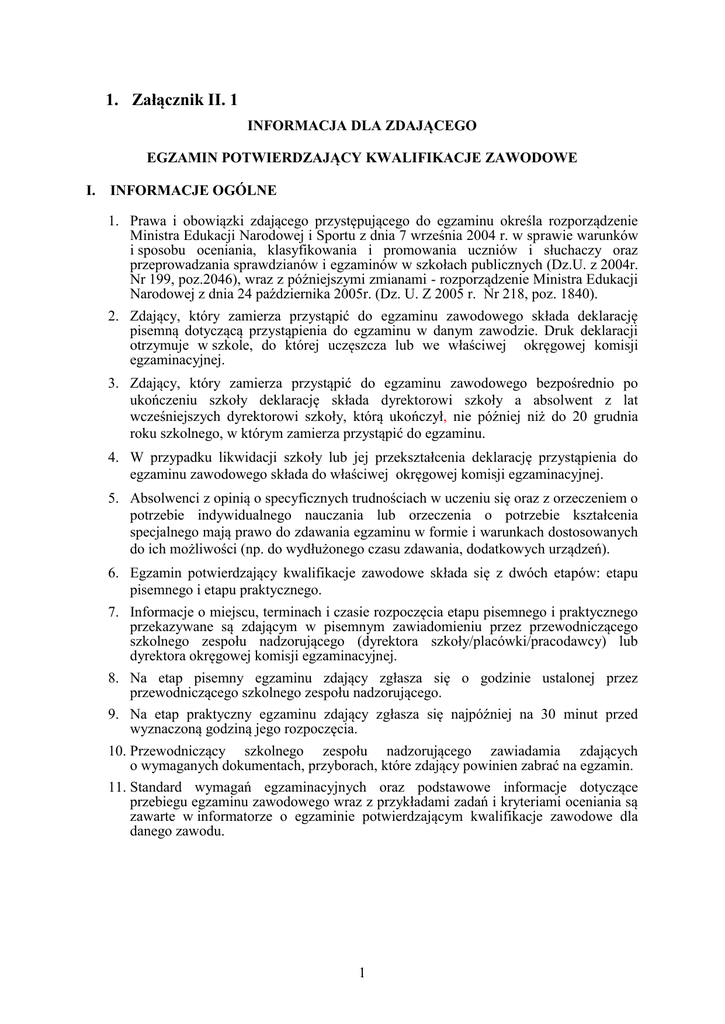1. Załącznik II. 1 INFORMACJA DLA ZDAJĄCEGO EGZAMIN POTWIERDZAJĄCY KWALIFIKACJE ZAWODOWE I. INFORMACJE OGÓLNE 1. Prawa i obowiązki zdającego przystępującego do egzaminu określa rozporządzenie Ministra Edukacji Narodowej i Sportu z dnia 7 września 2004 r. w sprawie warunków i sposobu oceniania, klasyfikowania i promowania uczniów i słuchaczy oraz przeprowadzania sprawdzianów i egzaminów w szkołach publicznych (Dz.U. z 2004r. Nr 199, poz.2046), wraz z późniejszymi zmianami - rozporządzenie Ministra Edukacji Narodowej z dnia 24 października 2005r. (Dz. U. Z 2005 r. Nr 218, poz. 1840). 2. Zdający, który zamierza przystąpić do egzaminu zawodowego składa deklarację pisemną dotyczącą przystąpienia do egzaminu w danym zawodzie. Druk deklaracji otrzymuje w szkole, do której uczęszcza lub we właściwej okręgowej komisji egzaminacyjnej. 3. Zdający, który zamierza przystąpić do egzaminu zawodowego bezpośrednio po ukończeniu szkoły deklarację składa dyrektorowi szkoły a absolwent z lat wcześniejszych dyrektorowi szkoły, którą ukończył, nie później niż do 20 grudnia roku szkolnego, w którym zamierza przystąpić do egzaminu. 4. W przypadku likwidacji szkoły lub jej przekształcenia deklarację przystąpienia do egzaminu zawodowego składa do właściwej okręgowej komisji egzaminacyjnej. 5. Absolwenci z opinią o specyficznych trudnościach w uczeniu się oraz z orzeczeniem o potrzebie indywidualnego nauczania lub orzeczenia o potrzebie kształcenia specjalnego mają prawo do zdawania egzaminu w formie i warunkach dostosowanych do ich możliwości (np. do wydłużonego czasu zdawania, dodatkowych urządzeń). 6. Egzamin potwierdzający kwalifikacje zawodowe składa się z dwóch etapów: etapu pisemnego i etapu praktycznego. 7. Informacje o miejscu, terminach i czasie rozpoczęcia etapu pisemnego i praktycznego przekazywane są zdającym w pisemnym zawiadomieniu przez przewodniczącego szkolnego zespołu nadzorującego (dyrektora szkoły/placówki/pracodawcy) lub dyrektora okręgowej komisji egzaminacyjnej. 8. Na etap pisemny egzaminu zdający zgłasza się o godzinie ustalonej przez przewodniczącego szkolnego zespołu nadzorującego. 9. Na etap praktyczny egzaminu zdający zgłasza się najpóźniej na 30 minut przed wyznaczoną godziną jego rozpoczęcia. 10. Przewodniczący szkolnego zespołu nadzorującego zawiadamia zdających o wymaganych dokumentach, przyborach, które zdający powinien zabrać na egzamin. 11. Standard wymagań egzaminacyjnych oraz podstawowe informacje dotyczące przebiegu egzaminu zawodowego wraz z przykładami zadań i kryteriami oceniania są zawarte w informatorze o egzaminie potwierdzającym kwalifikacje zawodowe dla danego zawodu. 1 II. ETAP PISEMNY 1. O ustalonej godzinie zdający wchodzą do sali pojedynczo, według kolejności na liście i zajmują wyznaczone miejsca. Każdy zdający powinien mieć przy sobie dokument tożsamości z aktualnym zdjęciem i okazać go przed wejściem do sali. Do sali zdający nie wnosi żadnych środków łączności. 2. Na egzamin zdający przynosi ze sobą wyłącznie przybory do pisania - pióro lub długopis z czarnym tuszem/atramentem. 3. Egzamin rozpoczyna się punktualnie o godzinie wyznaczonej przez dyrektora Centralnej Komisji Egzaminacyjnej. Po rozdaniu arkuszy egzaminacyjnych i kart odpowiedzi zdający spóźnieni nie zostają wpuszczeni do sali egzaminacyjnej. 4. Arkusz egzaminacyjny zawiera: – instrukcję dla zdającego zamieszczoną na pierwszej stronie arkusza, – test dwuczęściowy z wyraźnie oddzieloną częścią I i częścią II. W części I znajduje się 50 zadań, w części II – 20 zadań. Wszystkie zadania są zadaniami zamkniętymi z czterema odpowiedziami, z których tylko jedna odpowiedź jest prawidłowa. 5. Przewodniczący szkolnego zespołu nadzorującego sprawdza, czy pakiety z arkuszami egzaminacyjnymi i kartami odpowiedzi są nienaruszone i otwiera je w obecności przewodniczących zespołów nadzorujących i przedstawicieli zdających. 6. Zdający, po otrzymaniu arkusza egzaminacyjnego i karty odpowiedzi, ma obowiązek sprawdzić, czy arkusz egzaminacyjny i karta odpowiedzi są kompletne, tzn. czy arkusz ma wszystkie strony, czy strony arkusza i karty odpowiedzi są wyraźnie wydrukowane. Braki natychmiast zgłasza przewodniczącemu zespołu nadzorującego i otrzymuje kompletny arkusz lub kartę. Wymianę arkusza lub karty zdający potwierdza czytelnym podpisem w protokole przebiegu etapu pisemnego. 7. Zdający ma obowiązek zapoznać się z „Instrukcją dla zdającego” zamieszczoną na pierwszej stronie arkusza egzaminacyjnego. 8. Zdający wpisuje informacje w wyznaczonych miejscach na karcie odpowiedzi: – swój numer ewidencyjny PESEL i koduje go, – datę urodzenia, – symbol cyfrowy zawodu i wersję arkusza. W razie wątpliwości może poprosić o wyjaśnienie członków zespołu nadzorującego. 9. Czas przeznaczony na rozwiązywanie zadań liczony jest od momentu zakończenia czynności organizacyjnych. Przewodniczący zespołu nadzorującego zapisuje na tablicy (planszy), w miejscu widocznym dla każdego zdającego, godzinę rozpoczęcia i godzinę zakończenia rozwiązywania zadań. 10. Zdający rozwiązuje zadania i zaznacza odpowiedzi w wyznaczonych miejscach na karcie odpowiedzi wyłącznie długopisem lub piórem z czarnym tuszem/atramentem. Na rozwiązanie zadań zdający ma 120 minut. Na podstawie opinii/orzeczenia poradni psychologiczno-pedagogicznej czas może być wydłużony o 30 minut, a egzamin dla tych zdających powinien odbywać się w osobnej sali. 11. Zdający może rozwiązywać zadania w dowolnej kolejności. Aby zdać etap pisemny egzaminu zdający musi poprawnie rozwiązać, co najmniej 25 zadań z części I i co najmniej 6 zadań z części II. 12. W czasie trwania egzaminu zdający pracuje samodzielnie i nie zakłóca przebiegu egzaminu, a w szczególności: a) nie opuszcza sali egzaminacyjnej (tylko 