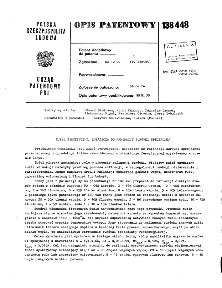 POLSKA ZEGZPOSPOLITA ©FIS PAIERJTOWY 138448 lilOOiy Patent dodatkowy do patentu Zgłoszono: 82 10 oa (P. 23858A) InL Cl4 c21c 1/°° Pierwszeństwo: im. w. c21c 7/oy6 iiezĄo PATEHTOWY PRL Zgłoszenie ogłoszono: 6Zf °/f 24 Opis patentowy opublikowano: 88 01 30 Tv/órcy wynalazku: Uprawniony z patentu: Edward 31edrawa, Karol Chudoba, Zdzisław Czopek, Aleksander Pijał, Kazimierz Głownia, Jerzy Tybulczuk Instytut Odlewnictwa, Kraków (Polska) ŻUŻEL SYNTETYCZNY, ZWŁASZCZA DO RAFINACJI SURÓWKI SPECJALNEJ Przedmiotem wynalazku Jest żużel syntetyczny, zwłaszcza do rafinacji surówki specjalnej przeznaczonej do produkcji żeliwa sferoidalnego o strukturze ferrytycznej uzyskiwanej w sta¬ nie lanym. Żużel odgrywa zasadniczą rolę w procesie rafinacji surówki. Właściwy skład chemiczny żużla warunkuje należyty przebieg procesu rafinacji, w szczególności reakcji odsiarczania i odfosforowania. Znane zasadowe.środki rafinacji zawierają głównie wapno, koncentrat rudy, zgorzelinę walcowniczą i fluoryt lub boksyt. Znany jest z polskiego opisu patentowego nr 102 476 preparat do rafinacji ciekłych sto¬ pów żelaza o składzie wagowym: 30 - 95% karbidu, 2 - 16% fluorku wapnia, 10 - 40% wapniokrzemu, 2-16% aluminium, 8 - 25% tlenku aluminium, 8 - 25% tlenku wapnia, 5 - 20% żelazomanganu* Z polskiego opisu patentowego nr 120 908 znany jest środek do rafinacji metali o składzie wa¬ gowym: 30 - 50% tlenku wapnia, 5-10% fluorku wapnia, 3-8% bezwodnego węglanu sodu, 10 - 15% aluminium, 1-5% azotanu sodu i z 10 - 15% tlenków żelaza. Spośród własności fizycznych żużla najważniejsza jest jego płynność. Płynność żużla zmniejsza się ze wzrostem jego zasadowości, natomiast wzrasta ze wzrostem temperatury, szcze¬ gólnie w zakresie 1550 - 1600°C, Aby uzyskać odpowiednią aktywność znanych żużli zasadowych trzeba stosować wysokie temperatury wytopu. Przy stosowaniu do rafinacji surówki znanych żużli utlenienie fosforu następuje dopiero w trzeciej fazie procesu konwertorowego, czyli po utle¬ nieniu węgla, co uniemożliwia otrzymanie surówki specjalnej wysokowęglowej, Celem wynalazku jest opracowanie takiego składu żużla, który umożliwiłby uzyskanie surów¬ ki specjalnej o zawartości C » 3,5-4,6%, Si « 0,05-2,5%, Mnmax ,v = 0,10%, Pm^ « 0,04%, max Smax * 0,025%. Cel ten osiągnięto stosując do rafinacji wysokowęglowej surówki wielkopiecowej żużel syntetyczny składający się z 40 - 60 części wagowych wapna, 20 - 30 części wagowych kon¬ centratu rudy lub zgorzeliny walcowniczej, 5-15 części wagowych fluorytu lub boksytu, 5-10 części wagowych azotanu potasu. 2 f 138 448 Zamienne stosowanie koncentratu rudy lub zgorzeliny walcowniczej pozawala na osiągnię¬ cie tego samego efektu w zakresie odfosforowania i utleniania manganu w surówce, gdyż oba materiały mają podobny skład chemiczny i charakteryzują się identycznymi właściwościami che¬ micznymi. Zarówno fluoryt jak i boksyt zwiększają płynność żużla na skutek tego, że wiążąc się chemicznie z zawartym w żużlu wapnem obniżają temperaturę topnienia żużla. Oba te skład¬ niki mogą być stosowane zamiennie z /tym samym efektem technologicznym. Żużel syntetyczny według wynalazku umożliwia efektywne obniżenie zawartości manganu i fosforu w surówce przy nieznacznym tylko obniżeniu zawartości węgla. Żużel syntetyczny wed¬ ług wynalazku ulega stopniowemu topieniu począwszy od temperatury 800°C i charakteryzuje się duią płynnością i aktywnością w zakresie temperalur 1200 - 1400°C, dzięki czemu proces rafinacji można prowadzić zarówno w kadzi odlewniczej jak i w konwertorze powietrznym lub w piecu metalurgicznym. Przykłady składu żużla według wynalazku. Przykład I. 60 części wagowych wapna, 20 części wagowych koncentratu rudy, 12 części wagowych fluorytu, 8 części wagowych węglanu sodu, 5 części wagowych azotanu potasu. Przykład II. 40 części wagowych wapna, 25 części wagowych zgorzeliny walcow¬ niczej, 15 części wagowych fluorytu, 10 części wagowych węglanu sodu, 8 części wagowych azo¬ tanu potasu. Przykład III. 55 części wagowych wapna, 28 części wagowych koncentratu rudy, 10.-części wagowych fluorytu, 10 części wagowych węglanu sodu, 10 części wagowych azotanu po¬ tasu. Przykład IV. 60 części wagowych wapna, 20 części wagowych zgorzeliny walcowni¬ czej, .12 części wagowych boksytu, 8 części wagowych węglanu sodu, 6 czet ci. wagowych azotanu potasu. Przykład V. 55 części wagowych wapna, 20 części wagowych zgorzeliny walcowni¬ czej, 10 części, wagowych boksytu* 10 części wagowych węglanu sodu, 10 części wagowych azota¬ nu potasu. Przykład VI. 40 części wagowych wapna, 25 części wagowych koncentratu rudy, 15 części wagowych boksytu, 10 części wagowych węglanu sodu, 8 części wagowych azotanu potasu. Zastrzeżenia patentowe 1. Żużel syntetyczny, zwłaszcza do rafinacji surówki specjalnej składający się z 40 - 60 części wagowych wapna, 20 - 30 części wagowych koncentratu rudy lub zgorzeliny walcowniczej, 5 - 15 części wagowych fluorytu, 5-10 części wagowych węglanu aodu, znamienny tym, że zawiera 5-10 części wagowych azotanu potasu. 2. Żużel syntetyczny, zwłaszcza do rafinacji surówki specjalnej składający się z 40 - 60 części wagowyeh wapna, 20 - 30 części wagowych koncentratu rudy lub zgorzeliny walcowniczej, 5-15 części wagowych boksytu, 5 - 10 części wagowych węglanu sodu, że zawiera 5 - 10 części wagowych azotanu potasu. Pracowni Poligraficzna UP PRL. Nakład 100 egz Cena 130 zł znamienny tym,