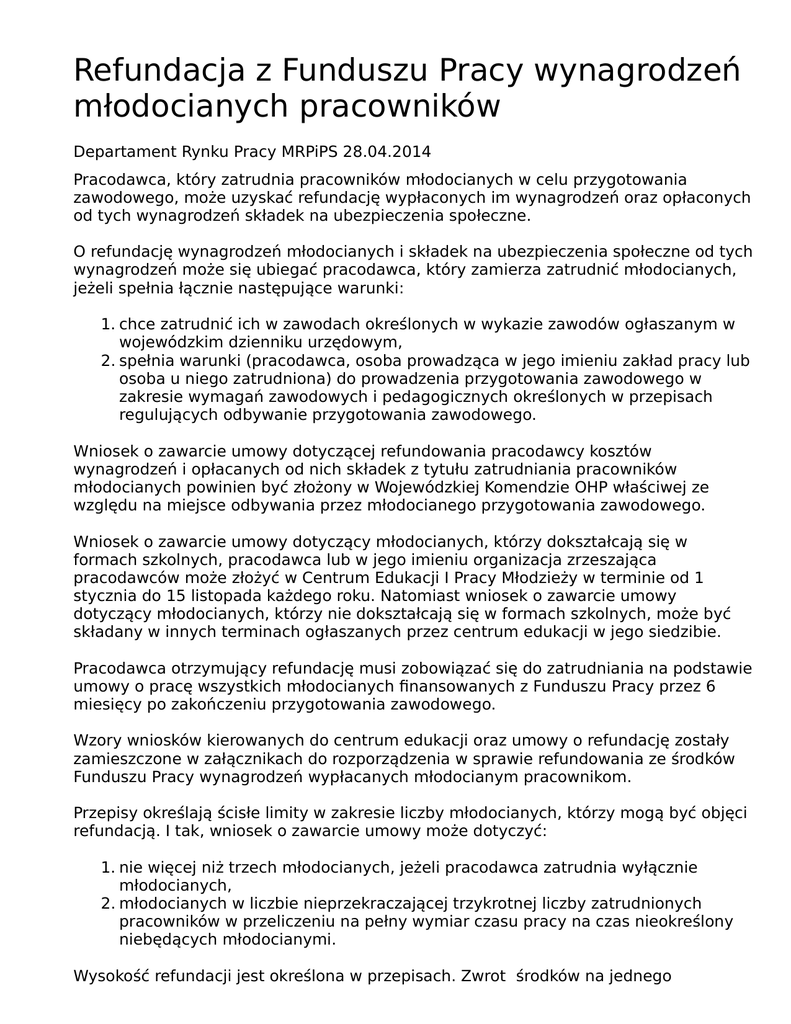 Refundacja z Funduszu Pracy wynagrodzeń młodocianych pracowników Departament Rynku Pracy MRPiPS 28.04.2014 Pracodawca, który zatrudnia pracowników młodocianych w celu przygotowania zawodowego, może uzyskać refundację wypłaconych im wynagrodzeń oraz opłaconych od tych wynagrodzeń składek na ubezpieczenia społeczne. O refundację wynagrodzeń młodocianych i składek na ubezpieczenia społeczne od tych wynagrodzeń może się ubiegać pracodawca, który zamierza zatrudnić młodocianych, jeżeli spełnia łącznie następujące warunki: 1. chce zatrudnić ich w zawodach określonych w wykazie zawodów ogłaszanym w wojewódzkim dzienniku urzędowym, 2. spełnia warunki (pracodawca, osoba prowadząca w jego imieniu zakład pracy lub osoba u niego zatrudniona) do prowadzenia przygotowania zawodowego w zakresie wymagań zawodowych i pedagogicznych określonych w przepisach regulujących odbywanie przygotowania zawodowego. Wniosek o zawarcie umowy dotyczącej refundowania pracodawcy kosztów wynagrodzeń i opłacanych od nich składek z tytułu zatrudniania pracowników młodocianych powinien być złożony w Wojewódzkiej Komendzie OHP właściwej ze względu na miejsce odbywania przez młodocianego przygotowania zawodowego. Wniosek o zawarcie umowy dotyczący młodocianych, którzy dokształcają się w formach szkolnych, pracodawca lub w jego imieniu organizacja zrzeszająca pracodawców może złożyć w Centrum Edukacji I Pracy Młodzieży w terminie od 1 stycznia do 15 listopada każdego roku. Natomiast wniosek o zawarcie umowy dotyczący młodocianych, którzy nie dokształcają się w formach szkolnych, może być składany w innych terminach ogłaszanych przez centrum edukacji w jego siedzibie. Pracodawca otrzymujący refundację musi zobowiązać się do zatrudniania na podstawie umowy o pracę wszystkich młodocianych finansowanych z Funduszu Pracy przez 6 miesięcy po zakończeniu przygotowania zawodowego. Wzory wniosków kierowanych do centrum edukacji oraz umowy o refundację zostały zamieszczone w załącznikach do rozporządzenia w sprawie refundowania ze środków Funduszu Pracy wynagrodzeń wypłacanych młodocianym pracownikom. Przepisy określają ścisłe limity w zakresie liczby młodocianych, którzy mogą być objęci refundacją. I tak, wniosek o zawarcie umowy może dotyczyć: 1. nie więcej niż trzech młodocianych, jeżeli pracodawca zatrudnia wyłącznie młodocianych, 2. młodocianych w liczbie nieprzekraczającej trzykrotnej liczby zatrudnionych pracowników w przeliczeniu na pełny wymiar czasu pracy na czas nieokreślony niebędących młodocianymi. Wysokość refundacji jest określona w przepisach. Zwrot środków na jednego pracownika młodocianego nie może przekroczyć wysokości wynagrodzenia młodocianego ustalonego w przepisach oraz opłacanych od tego wynagrodzenia składek na ubezpieczenia społeczne finansowanych przez pracodawcę. Młodocianemu w okresie nauki zawodu przysługuje wynagrodzenie obliczane w stosunku procentowym do przeciętnego miesięcznego wynagrodzenia w gospodarce narodowej w poprzednim kwartale, obowiązujące od pierwszego dnia następnego miesiąca po ogłoszeniu przez Prezesa Głównego Urzędu Statystycznego w Dzienniku Urzędowym Rzeczypospolitej Polskiej "Monitor Polski" wysokości tego wynagrodzenia. Wynagrodzenie młodocianych jest zatem zmienne. • w pierwszym roku nauki nie mniej niż 4% przeciętnego wynagrodzenia, • w drugim roku nauki nie mniej niż 5% przeciętnego wynagrodzenia, • w trzecim roku nauki nie mniej niż 6% przeciętnego wynagrodzenia. W przypadku przyuczenia do wykonywania określonej pracy stawka jest równa kwocie wypłacanej pracownikowi młodocianemu uczącemu się w pierwszej klasie nauki zawodu. Młodociani zatrudnieni w celu przygotowania zawodowego pozostają w stosunku pracy,. Obowiązkowo podlegają ubezpieczeniom emerytalnemu, rentowym, chorobowemu i wypadkowemu. Pracodawca opłaca również składkę na ubezpieczenie wypadkowe. Podstawa prawna • ustawa z dnia 26 czerwca 1974 r. – Kodeks pracy (Dz. U. z 2014 r. poz. 1502, z późn. zm.) – art. 190, art. 191 • ustawa z dnia 20 kwietnia 2004 r. o promocji zatrudnienia i instytucjach rynku pracy (Dz. U. z 2016 r. poz. 645, z późn. zm.) – art. 12 ust. 6 – 6a • rozporządzenie Ministra Pracy i Polityki Społecznej z dnia 25 czerwca 2014 r. w sprawie refundowania ze środków Funduszu Pracy wynagrodzeń wypłacanych młodocianym pracownikom (Dz.U. z 2014 r. poz. 865) • rozporządzenie Rady Ministrów z 28 maja 1996 r. w sprawie przygotowania zawodowego młodocianych i ich wynagradzania (Dz. U. z 2014 r. poz. 232)