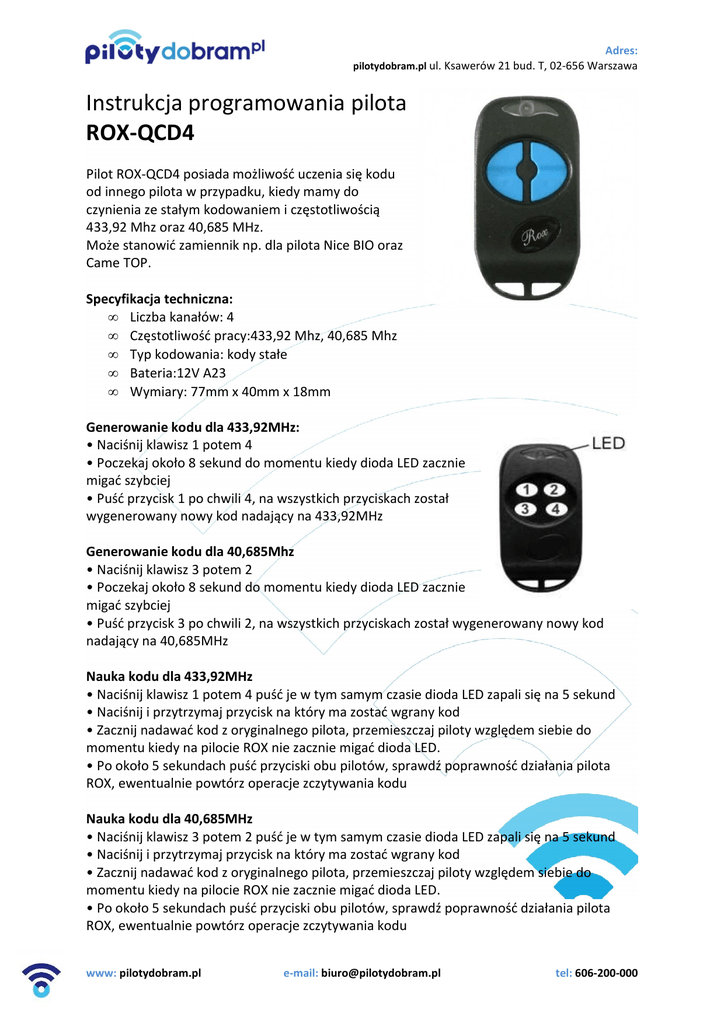 Adres: pilotydobram.pl ul. Ksawerów 21 bud. T, 02-656 Warszawa Instrukcja programowania pilota ROX-QCD4 Pilot ROX-QCD4 posiada możliwość uczenia się kodu od innego pilota w przypadku, kiedy mamy do czynienia ze stałym kodowaniem i częstotliwością 433,92 Mhz oraz 40,685 MHz. Może stanowić zamiennik np. dla pilota Nice BIO oraz Came TOP. Specyfikacja techniczna: • Liczba kanałów: 4 • Częstotliwość pracy:433,92 Mhz, 40,685 Mhz • Typ kodowania: kody stałe • Bateria:12V A23 • Wymiary: 77mm x 40mm x 18mm Generowanie kodu dla 433,92MHz: • Naciśnij klawisz 1 potem 4 • Poczekaj około 8 sekund do momentu kiedy dioda LED zacznie migać szybciej • Puść przycisk 1 po chwili 4, na wszystkich przyciskach został wygenerowany nowy kod nadający na 433,92MHz Generowanie kodu dla 40,685Mhz • Naciśnij klawisz 3 potem 2 • Poczekaj około 8 sekund do momentu kiedy dioda LED zacznie migać szybciej • Puść przycisk 3 po chwili 2, na wszystkich przyciskach został wygenerowany nowy kod nadający na 40,685MHz Nauka kodu dla 433,92MHz • Naciśnij klawisz 1 potem 4 puść je w tym samym czasie dioda LED zapali się na 5 sekund • Naciśnij i przytrzymaj przycisk na który ma zostać wgrany kod • Zacznij nadawać kod z oryginalnego pilota, przemieszczaj piloty względem siebie do momentu kiedy na pilocie ROX nie zacznie migać dioda LED. • Po około 5 sekundach puść przyciski obu pilotów, sprawdź poprawność działania pilota ROX, ewentualnie powtórz operacje zczytywania kodu Nauka kodu dla 40,685MHz • Naciśnij klawisz 3 potem 2 puść je w tym samym czasie dioda LED zapali się na 5 sekund • Naciśnij i przytrzymaj przycisk na który ma zostać wgrany kod • Zacznij nadawać kod z oryginalnego pilota, przemieszczaj piloty względem siebie do momentu kiedy na pilocie ROX nie zacznie migać dioda LED. • Po około 5 sekundach puść przyciski obu pilotów, sprawdź poprawność działania pilota ROX, ewentualnie powtórz operacje zczytywania kodu www: pilotydobram.pl e-mail: [email protected] tel: 606-200-000