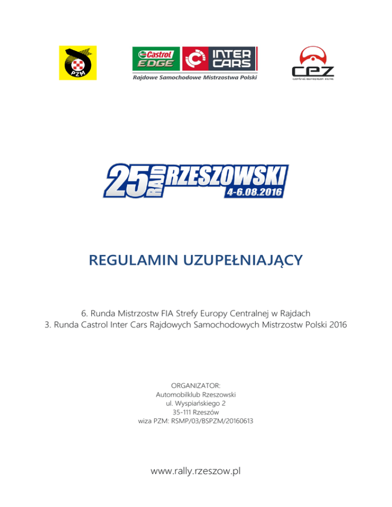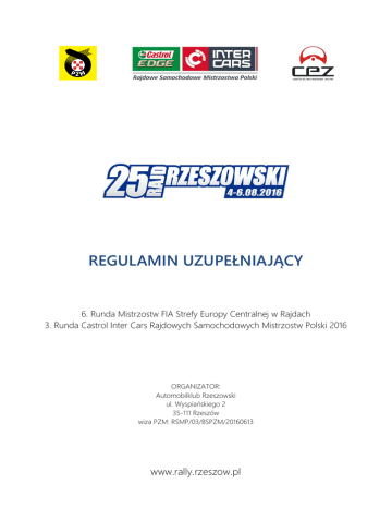 REGULAMIN UZUPEŁNIAJĄCY 6. Runda Mistrzostw FIA Strefy Europy Centralnej w Rajdach 3. Runda Castrol Inter Cars Rajdowych Samochodowych Mistrzostw Polski 2016 ORGANIZATOR: Automobilklub Rzeszowski ul. Wyspiańskiego 2 35-111 Rzeszów wiza PZM: RSMP/03/BSPZM/20160613 www.rally.rzeszow.pl SPIS TREŚCI 1. WSTĘP .................................................................................................................................................. 3 2. ORGANIZACJA.................................................................................................................................... 3 3. PROGRAM ........................................................................................................................................... 5 4. ZGŁOSZENIA ....................................................................................................................................... 6 5. UBEZPIECZENIE ................................................................................................................................. 11 6. REKLAMA I ZNAKOWANIE .............................................................................................................. 11 7. OPONY................................................................................................................................................ 12 8. PALIWO ............................................................................................................................................... 13 9. ZAPOZNANIE Z TRASĄ RAJDU ...................................................................................................... 13 10. ODBIÓR ADMINISTRACYJNY ..........................................................................................................14 11. BADANIE KONTROLNE BK 1, PLOMBOWANIE I ZNAKOWANIE .............................................14 12. INNE PROCEDURY ............................................................................................................................ 16 13. IDENTYFIKACJA OSÓB OFICJALNYCH......................................................................................... 20 14. NAGRODY ......................................................................................................................................... 20 15. KOŃCOWE BADANIE KONTROLNE I PROTESTY ....................................................................... 21 Załącznik nr 1 – Harmonogram rajdu ...................................................................................................... 22 Załącznik nr 2 – Harmonogram zapoznania z trasą rajdu .................................................................. 25 Załącznik nr 3 – Plan pracy odpowiedzialnego za kontakty z zawodnikami ................................... 25 Załącznik nr 4 – Rozmieszczenie reklamy organizatora ...................................................................... 26 Załącznik nr 5 – Instalacja i obsługa urządzenia PZM-GPS ................................................................. 27 2 REGULAMIN UZUPEŁNIAJĄCY – RSMP / FIA-CEZ 1. WSTĘP 1.1 25. Rajd Rzeszowski zostanie przeprowadzony zgodnie z postanowieniami: Międzynarodowego Kodeksu Sportowego FIA (MKS FIA) na rok 2016 wraz z załącznikami, Regulaminu Sportowego Rajdów Regionalnych FIA (Regulamin Sportowy) na rok 2016 wraz z załącznikami, Regulaminu Mistrzostw FIA Strefy Europy Centralnej w Rajdach na rok 2016 wraz z załącznikami, Regulaminu Ramowego Rajdowych Samochodowych Mistrzostw Polski (Regulamin RSMP) na rok 2016 wraz z załącznikami, Regulaminu Ochrony Środowiska w Sportach Motorowych PZM, Ustawy „Prawo o Ruchu Drogowym RP”, niniejszego Regulaminu Uzupełniającego. Modyfikacje, zmiany i/lub uzupełnienia do niniejszego Regulaminu Uzupełniającego będą publikowane wyłącznie w numerowanych i datowanych komunikatach ogłaszanych przez Organizatora lub ZSS 1.2 NAWIERZCHNIA Asfalt 1.3 CAŁKOWITA DŁUGOŚĆ OS I TRASY Całkowita długość OS - 214,51 km Całkowita długość trasy - 613,96 km 2. ORGANIZACJA 2.1 NAZWA ZAWODÓW, DO KTÓRYCH ZALICZA SIĘ RAJD 6. Runda Mistrzostw FIA Strefy Europy Centralnej w Rajdach 2016 3. Runda Castrol Inter Cars Rajdowych Samochodowych Mistrzostw Polski 2016 2.2 NUMER WIZY RSMP/03/BSPZM/20160613 2.3 NAZWA ORGANIZATORA, ADRES I DANE KONTAKTOWE Automobilklub Rzeszowski ul. Wyspiańskiego 2, 35-111 Rzeszów Tel: (+48 17) 853 31 39, Fax: (+48 17) 853 31 60 E-mail: [email protected] www: www.rally.rzeszow.pl 2.4 KOMITET ORGANIZACYJNY Przewodniczący: Członkowie: Jarosław Noworól Zdzisław Grzyb Jan Jędrzejko Marek Dobrowolski Łukasz Biegus Andrzej Makaran REGULAMIN UZUPEŁNIAJĄCY – RSMP / FIA-CEZ (POL) (POL) (POL) (POL) (POL) (POL) 3 2.5 ZESPÓŁ SĘDZIÓW SPORTOWYCH Przewodniczący Członek Członek Sekretarz Krzysztof Maciejewski Boris Kočergin Grzegorz Lewandowski Patrycja Bednarek (POL) (SVK) (POL) (POL) 2.6 OBSERWATORZY I DELEGACI Obserwator/Delegat ds. bezpieczeństwa PZM Delegat Techniczny PZM Arkadiusz Sąsara Wojciech Nowak (POL) (POL) Łukasz Biegus Andrzej Makaran Dominik Noworól Damian Dobrowolski Piotr Kłeczek Łukasz Szuba Agnieszka Świeca Artur Gawłowski Tomasz Brzeziński Marek Kisiel (POL) (POL) (POL) (POL) (POL) (POL) (POL) (POL) (POL) (POL) Szczepan Żmuda (POL) Marcin Fiejdasz Paweł Owczyński Jan Jędrzejko Andrzej Karaczun Marian Boczar Ireneusz Miklaszewski Andrzej Buziewicz Anna Noworól Jerzy Głuśniewski Radosław Mikuła Marek Rydz Daniel Poźniak Andrzej Jaremcio Mirosław Jaremcio Bartłomiej Korzeń (POL) (POL) (POL) (POL) (POL) (POL) (POL) (POL) (POL) (POL) (POL) (POL) (POL) (POL) (POL) 2.7 GŁÓWNE OSOBY OFICJALNE Dyrektor Rajdu Wicedyrektor ds. Bezpieczeństwa Wicedyrektor ds. Sportowych Wicedyrektor ds. Organizacyjnych Wicedyrektor ds. Mediów Asystent Dyrektora ds. PR Asystent Dyrektora ds. sędziów Lekarz Zawodów Odpowiedzialny za kontakty z zawodnikami Asystent odpowiedzialnego za k