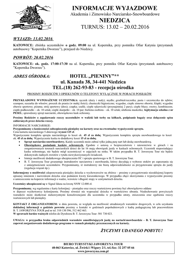 INFORMACJE WYJAZDOWE Akademia i Zimowisko Narciarsko-Snowboardowe NIEDZICA TURNUS: 13.02 – 20.02.2016 WYJAZD: 13.02.2016 KATOWICE: zbiórka uczestników o godz. 09:00 na ul. Kopernika, przy pomniku Ofiar Katynia (przystanek autobusowy ”Kopernika Dworzec”), przejazd do Niedzicy. POWRÓT: 20.02.2016 KATOWICE: ok. godz. 17:00-17:30 na ul. Kopernika, przy pomniku Ofiar Katynia (przystanek autobusowy ”Kopernika Dworzec”). ADRES OŚRODKA: HOTEL „PIENINY”** ul. Kanada 38, 34-441 Niedzica TEL.(18) 262-93-83 - recepcja ośrodka PROSIMY RODZICÓW I OPIEKUNÓW O TELEFONY WYŁĄCZNIE W PORACH POSIŁKÓW PRZYKŁADOWE WYPOSAŻENIE UCZESTNIKA: ręcznik (duży i mały); mydło; grzebień/szczotka; pasta i szczoteczka do zębów; szampon; suszarka do włosów; proszek do prania (w małej ilości); chusteczki higieniczne; wygodne, ciepłe zimowe obuwie; klapki; wygodne obuwie sportowe; piżama; strój sportowy (dres); czapka; szalik; ciepłe rękawiczki (przynajmniej 2 pary); ciepłe bluzy; swetry; kombinezon; ciepłe podkoszulki – ok. 10 sztuk; ciepłe skarpetki – ok. 10 par; bielizna osobista – ok. 10 sztuk; ulubiona maskotka; legitymacja szkolna z nr PESEL; sprawdzony sprzęt narciarski, obowiązkowo kask ochronny. Prosimy Rodziców o zapakowanie rzeczy uczestników w walizki lub torby na kółkach, podpisanie bagaży oraz dołączenie spisu zabieranych przez dziecko rzeczy. INFORMACJE NARCIARSKIE: Przypominamy o konieczności zabezpieczenia pieniędzy na karnety oraz na ewentualne wypożyczenie sprzętu. Cena karnetu narciarskiego 5-dniowego wynosi 125 zł. Wypożyczenie kompletu sprzętu narciarskiego to koszt ok. 45 zł za dobę. Wypożyczenie kompletu sprzętu snowboardowego to koszt ok. 45 zł za dobę. Wypożyczenie kasku to dodatkowy koszt 15 zł za dobę. Sprzęt narciarsko-snowboardowy. Każdy uczestnik może zabrać tylko jedną parę nart lub deskę snowboardową. Obowiązkowe posiadanie kasków ochronnych. Zgodnie z ustawą o bezpieczeństwie i ratownictwie w górach i na zorganizowanych terenach narciarskich dzieci do lat 16 mają obowiązek jazdy w kaskach ochronnych. Uczestnik nieposiadający kasku ochronnego, nie będzie mógł uczestniczyć w zajęciach na stoku. W takim przypadku B. T. Jaworzyna Tour nie będzie dokonywało żadnych zwrotów z tytułu niewykorzystanych świadczeń. Istnieje możliwość dodatkowego ubezpieczenia OC i sprzętu sportowego w B. T. Jaworzyna Tour. B. T. Jaworzyna Tour gwarantuje instruktorów narciarstwa i snowboardu, którzy decydują o wyborze stoków po zapoznaniu się z umiejętnościami uczestników. Przypominamy, iż instruktorzy nie biorą odpowiedzialności za przygotowanie sprzętu do jazdy (regulacja wiązań itp.). Informujemy o możliwości zdeponowania pieniędzy dziecka u wychowawców na zbiórce – prosimy o przygotowanie niezaklejonej koperty opisanej imieniem i nazwiskiem dziecka oraz podaniem kwoty kieszonkowego. W przypadku chęci skorzystania z wypożyczalni prosimy o umieszczenie na kopercie informacji o wadze, wzroście i długość stopy w centymetrach dziecka. Uczestnicy ubezpieczeni są w Signal Iduna na kwotę NNW 12.000 zł. Przypominamy, wg regulaminu z karty kolonijnej – pieniądze oraz rzeczy wartościowe powinny być obowiązkowo oddane w depozyt wychowawcy kolonijnemu. Prosimy również nie wyposażać dziecka w wartościowe ubrania. Niedochowanie powyższych warunków może skutkować niekorzystnymi konsekwencjami dla uczestnika w przypadku utraty, zniszczenia oraz zgubienia rzeczy wartościowych lub pieniędzy. KONTAKT Z ORGANIZATOREM: w dniu powrotu, ze względu na możliwość utrudnionych warunków drogowych, w celu uzyskania dokładnej informacji o godzinie powrotu prosimy o kontakt w godzinach popołudniowych z kadrą pedagogiczną lub pracownikiem B. T. JAWORZYNA TOUR pod nr tel. 510 130 596, 512 462 463. W sprawach bardzo ważnych telefon do Dyrektora B. T. Jaworzyna Tour: 501 730 023. UWAGA: w przypadku braku odpowiednich warunków umożliwiających jazdę na nartach/snowboardzie – B. T. Jaworzyna Tour zapewni zorganizowanie dodatkowego programu w ramach pieniędzy przeznaczonych na karnety. ŻYCZYMY UDANEGO POBYTU! BIURO TURYSTYKI JAWORZYNA TOUR 40-063 Katowice, ul. Żwirki i Wigury 2/1, tel./fax: 32 257 05 66 www.jaworzyna.com.pl