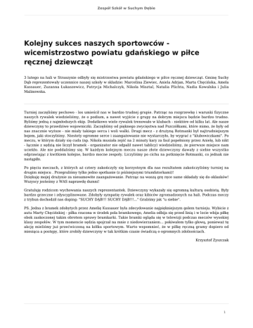 Zespół Szkół w Suchym Dębie Kolejny sukces naszych sportowców wicemistrzostwo powiatu gdańskiego w piłce ręcznej dziewcząt 3 lutego na hali w Straszynie odbyły się mistrzostwa powiatu gdańskiego w piłce ręcznej dziewcząt. Gminę Suchy Dąb reprezentowały uczennice naszej szkoły w składzie: Marcelina Ziewiec, Aniela Adrjan, Marta Chęcińska, Amela Kussauer, Zuzanna Łukaszewicz, Patrycja Michalczyk, Nikola Misztal, Natalia Plichta, Nadia Kowalska i Julia Malinowska. Turniej zaczęliśmy pechowo - los umieścił nas w bardzo trudnej grupie. Patrząc na rozgrzewkę i warunki fizyczne naszych rywalek wiedzieliśmy, że o podium, a nawet wyjście z grupy na dobrym miejscu będzie bardzo trudno. Byliśmy jedną z najmłodszych ekip. Dodatkowo wiele rywalek trenowało w klubach - niektóre od kilku lat. Ale nasze dziewczyny to prawdziwe wojowniczki. Zaczęliśmy od pięknego zwycięstwa nad Pszczółkami, które mimo, że były od nas znacznie wyższe - nie miały takiego serca i woli walki. Drugi mecz - z drużyną Rotmanki był najtrudniejszym bojem, jaki stoczyliśmy. Niestety ogromne serce i zaangażowanie nie wystarczyło, by wygrać z "klubowiczkami". Po meczu, w którym działy się cuda (np. Nikola musiała zejść na 2 minuty kary za faul popełniony przez Anielę, lub nikt - łącznie z sędzią nie liczył bramek - organizator nie odpalił nawet tablicy) wiedzieliśmy, że pierwsze miejsce nam uciekło. Ale nie poddaliśmy się. W każdym kolejnym meczu nasze złote dziewczyny dawały z siebie wszystko odprawiając z kwitkiem kolejne, bardzo mocne zespoły. Liczyliśmy po cichu na potknięcie Rotmanki, co jednak nie nastąpiło. Po pięciu meczach, z których aż cztery zakończyły się korzystnym dla nas rezultatem zakończyliśmy turniej na drugim miejscu . Przegraliśmy tylko jedno spotkanie (z późniejszymi triumfatorkami)! Dziękuję mojej drużynie za niesamowite zaangażowanie. Patrząc na waszą grę ręce same składały się do oklasków! Wszyscy jesteśmy z WAS naprawdę dumni! Gratuluję rodzicom wychowania naszych reprezentantek. Dziewczyny wykazały się ogromną kulturą osobistą. Były bardzo grzeczne i zdyscyplinowane. Zdobyły sympatię rywalek oraz kibiców zgromadzonych na hali. Podczas meczy z trybun dochodził nas doping: "SUCHY DĄB!!! SUCHY DĄB!!!..." Graliśmy jak "u siebie". PS. Jedna z bramek zdobytych przez Amelię Kussauer była zdecydowanie najpiękniejszym golem turnieju. Wybicie z autu Marty Chęcińskiej - piłka rzucona w środek pola bramkowego, Amelia odbija się przed linią i w locie wbija piłkę obok zaskoczonej takim obrotem sprawy bramkarki. Takie bramki ogląda się w telewizji podczas meczów wysokiej klasy zespołów. W tym momencie sędzia spojrzał na mnie z niedowierzaniem... pokiwałem tylko głową, ponieważ tę akcję mieliśmy już przećwiczoną na kółku sportowym. Warto wspomnieć, że w piłkę ręczną gramy dopiero od miesiąca a postępy, które zrobiły dziewczyny w tak krótkim czasie świadczą o ogromnych zdolnościach. Krzysztof Zyszczak 1