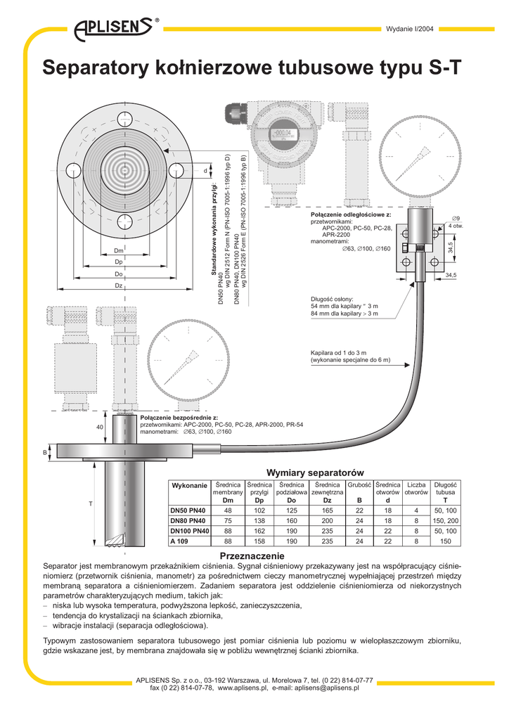 Wydanie I/2004 Dp Do Dz Po³¹czenie odleg³oœciowe z: przetwornikami: APC-2000, PC-50, PC-28, APR-2200 manometrami: ∅63, ∅100, ∅160 ∅9 4 otw. 34,5 Dm DN80 PN40, DN100 PN40 wg DIN 2526 Form E (PN-ISO 7005-1:1996 typ B) d Standardowe wykonania przylgi: DN50 PN40 wg DIN 2512 Form N (PN-ISO 7005-1:1996 typ D) Separatory ko³nierzowe tubusowe typu S-T 34,5 D³ugoœæ os³ony: 54 mm dla kapilary ≤ 3 m 84 mm dla kapilary > 3 m Kapilara od 1 do 3 m (wykonanie specjalne do 6 m) 40 Po³¹czenie bezpoœrednie z: przetwornikami: APC-2000, PC-50, PC-28, APR-2000, PR-54 manometrami: ∅63, ∅100, ∅160 B Wymiary separatorów Wykonanie T Œrednica Œrednica Œrednica Œrednica Gruboœæ Œrednica Liczba D³ugoœæ membrany przylgi podzia³owa zewnêtrzna otworów otworów tubusa Dm Dp Do Dz B d DN50 PN40 48 102 125 165 22 18 4 50, 100 T DN80 PN40 75 138 160 200 24 18 8 150, 200 DN100 PN40 88 162 190 235 24 22 8 50, 100 A 109 88 158 190 235 24 22 8 150 Przeznaczenie Separator jest membranowym przekaŸnikiem ciœnienia. Sygna³ ciœnieniowy przekazywany jest na wspó³pracuj¹cy ciœnieniomierz (przetwornik ciœnienia, manometr) za poœrednictwem cieczy manometrycznej wype³niaj¹cej przestrzeñ miêdzy membran¹ separatora a ciœnieniomierzem. Zadaniem separatora jest oddzielenie ciœnieniomierza od niekorzystnych parametrów charakteryzuj¹cych medium, takich jak: – niska lub wysoka temperatura, podwy¿szona lepkoœæ, zanieczyszczenia, – tendencja do krystalizacji na œciankach zbiornika, – wibracje instalacji (separacja odleg³oœciowa). Typowym zastosowaniem separatora tubusowego jest pomiar ciœnienia lub poziomu w wielop³aszczowym zbiorniku, gdzie wskazane jest, by membrana znajdowa³a siê w pobli¿u wewnêtrznej œcianki zbiornika. APLISENS Sp. z o.o., 03-192 Warszawa, ul. Morelowa 7, tel. (0 22) 814-07-77 fax (0 22) 814-07-78, www.aplisens.pl, e-mail: [email protected] Wydanie I/2004 Polecana minimalna szerokoœæ zakresu pomiarowego (kPa) w zale¿noœci od wybranego zestawu ciœnieniomierz-separator Ciœnieniomierz APC-2000* PC-28 PC-50 Manometr ∅63 Manometr ∅100 Manometr ∅160 Rodzaj separacji bezpoœrednia odleg³oœciowa (2 m) bezpoœrednia odleg³oœciowa (2 m) bezpoœrednia odleg³oœciowa (2 m) bezpoœrednia odleg³oœciowa (2 m) bezpoœrednia odleg³oœciowa (2 m) bezpoœrednia odleg³oœciowa (2 m) Wykonanie separatora DN80 PN40 20 50 10 50 10 50 100 250 100 250 100 250 DN50 PN40 200 600 10 200 10 200 250 600 600 600 600 600 DN100 PN40, A 109 10 25 10 25 10 25 100 100 100 100 100 100 * Podane w tabeli zakresy dla zmiennozakresowego przetwornika APC-2000 nale¿y rozumieæ jako nastawione. Zalecenia dotycz¹ce doboru separatorów Podstawowym problemem metrologicznym przy stosowaniu separatorów jest bezwzglêdny b³¹d temperaturowy „zera”, wynikaj¹cy z wp³ywu rozszerzalnoœci cieplnej cieczy manometrycznej, która musi zostaæ skompensowana podatnoœci¹ membrany separuj¹cej. Dla zminimalizowania tego wp³ywu korzystne jest: – stosowanie jak najkrótszych kapilar, co zmniejszy objêtoœæ cieczy manometrycznej w uk³adzie, – stosowanie wiêkszych DN w celu maksymalizacji podatnoœci membran, – sytuowanie kapilar tak, aby zminimalizowaæ zmiany ich temperatur. Dodatkowy bezwzglêdny b³¹d „zera” od zmian temperatury otoczenia dla zestawu przetwornik ciœnienia-separator z tubusem 100 mm Bezwzglêdny b³¹d „zera” na 10°C dla separatora DN50 DN80 DN100 bezpoœrednia 0,2 kPa 0,06 kPa 0,04 kPa odleg³oœciowa kapilara 2 m 1 kPa 0,2 kPa 0,1 kPa Rodzaj separacji Dodatkowy b³¹d „zera” od zmian temperatury medium zale¿y od gradientu temperatury w uk³adzie olejowym separacji i w ka¿dym przypadku jest zdecydowanie mniejszy ni¿ b³êdy podane w tabeli. Zakres temperatur mierzonego medium Ciecz manometryczna wysokotemperaturowa (DC) niskotemperaturowa (AK) Separacja odleg³oœciowa Pomiary podciœnieñ -10...150°C nie zalecana do pomiarów ciœnieñ < 50 kPa ABS Separacja bezpoœrednia Pomiary nadciœnieñ -10...315°C -60...200°C -30...150°C Uwaga: Przy pracy w temp. otoczenia < -15°C zaleca siê podgrzewanie kapilar wype³nionych ciecz¹ DC Ciœnienie maksymalne dla PN40 – 4 MPa Materia³ membrany, tubusa i ko³nierza separatora 00H17N14M2 (316Lss) Wykonania specjalne Separator na ciœnienia do 10 MPa (PN100) Separator wed³ug normy ANSI Wyprowadzenie kapilary w osi separatora Separacja bezpoœrednia medium powy¿ej 150°C Inne – po uzgodnieniu z konsultantem Aplisens, tel. (0 22) 814 07 77 Sposób zamawiania separacja bezpoœrednia: ciœnieniomierz / S-T – DN..... / T = ..... mm / wyk. spec. – opis separacja odleg³oœciowa: ciœnieniomierz / S-TK – DN..... / T = ..... mm / K = ..... m / ..... / wyk. spec. – opis Przetwornik lub manometr Pe³ne dane – zgodnie z w³aœciw¹ kart¹ katalogow¹ Wykonanie separatora D³ugoœæ tubusa D³ugoœæ kapilary Typ cieczy manometrycznej: DC (wys. temp.), AK (nisk. temp.) (mo¿na równie¿ podaæ warunki pracy: temp. medium, temp. otoczenia, P statyczne) Przyk³ad: Przetwornik ciœnienia APC-2000, obudowa typu PZ, zakres 0 ÷ 2,5 MPa, separator tubusowy odleg³oœciowy DN50, tubus 100 mm, kapilara 2 m, wype³nienie ciecz¹ DC. APC-2000 / PZ / 0 ÷ 2,5 MPa / S-TK – DN50 / T = 100 mm / K = 2 m / DC APLISENS Sp. z o.o., 03-192 Warszawa, ul. Morelowa 7, tel. (0 22) 814-07-77 fax (0 22) 814-07-78, www.aplisens.pl, e-mail: [email protected]