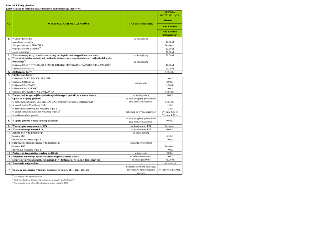 Rozdział 5. Karty płatnicze Karty wydane do rachunku oszczędnościowo-rozliczeniowego (debetowe) STAWKA OBOWIĄZUJĄCA Maestro WYSZCZEGÓLNIENIE CZYNNOŚCI L.p. Tryb pobierania opłaty Visa Electron Visa Electron "młodzieżowa" 1. Wydanie karty dla: 1) posiadacza rachunku *dla posiadaczy e-UNIKONTA 5) 2) współposiadacza rachunku 5) 3) osoby wskazanej 2. Wydanie nowej karty w miejsce utraconej lub duplikatu w przypadku uszkodzenia 3. Wznowienie karty, wydanie kolejnej karty posiadaczowi, współposiadaczowi rachunku lub osobie wskazanej: 6) 1) Unikonto START, STANDARD, SENIOR, PRESTIŻ, PRACOWNIK, BANKIER, VIP, e-UNIKOTO 2) Unikonto MINIMUM 4. Zastrzeżenie karty 6) 5. Użytkowanie karty 1) Unikonto START, SENIOR, PRESTIŻ 2) Unikonto MINIMUM 3) Unikonto STANDARD 4) Unikonto PRACOWNIK 5) Unikonto BANKIER, VIP, e-UNIKONTO 6. Zmiana limitów operacji bezgotówkowych lub wypłat gotówki na wniosek klienta 7. Opłata za wypłatę gotówki: 1) w bankomatach banków SGB oraz BPS S.A. i zrzeszonych banków spółdzielczych 7) 2) w kasach banku BS w Starej Białej 3) w bankomatach innych, niż wskazane w pkt 1 7) 4) w kasach innych banków, niż wskazane w pkt 2 5) w bankomatach za granicą 8. Wypłata gotówki w ramach usługi cash back 9. 10. 11. 1) 2) 12. 1) 2) 13. 14. 15. 16. Wydanie pierwszego numeru PIN Wydanie nowego numeru PIN Zmiana PIN w bankomatach: banków SGB innych, niż wskazane w pkt 1 Sprawdzenie salda rachunku w bankomatach: banków SGB innych, niż wskazane w pkt 1 Zestawienie transakcji przesyłane do klienta Przesłanie ponownego zestawienia transakcji na życzenie klienta Ekspresowe przesłanie karty lub numeru PIN (dostarczenie w ciągu 3 dni roboczych) Transakcje bezgotówkowe 17. Opłata za przeliczenie transakcji dokonanej w walucie obcej innej niż euro 5) Nie dotyczy kart młodziezowych 6) Karty młodziezowe dostępne są wyłącznie w pakiecie Unikonto Start Pod warunkiem, że placówka udostępnia usługę wypłat w POS 7) za każdą kartę za każdą kartę 12,00 zł bez opłat 12,00 zł 20,00 zł 20,00 zł za każdą kartę - miesięcznie za każdą zmianę za każdą wypłatę, pobierana w dniu rozliczenia operacji naliczana od wypłacanej kwoty za każdą wypłatę, pobierana w dniu rozliczenia operacji za każdy numer PIN za każdy numer PIN za każdą zmianę 12,00 zł 12,00 zł bez opłat 2,00 zł 2,00 zł 1,00 zł. 1,00 zł bez opłat 5,00 zł bez opłat 1,50 zł 1,30 zł 3% min. 4,50 zł 3% min. 4,50 zł 0,60 zł bez opłat 6,00 zł 4,50 zł 7,00 zł za każde sprawdzenie bez opłat 1,00 zł 2,00 zł 2,00 zł 45,00 zł bez prowizji miesięcznie za każde zestawienie za każdą przesyłkę naliczana od kwoty transakcji, pobierana w dniu rozliczenia 1% (dot. Visa Electron) operacji Karty kredytowe 1. 1) 2) 2. 1) 2) 3. 4. 5. 6. 7. 1) 2) 3) 4) 5) 8. 9. 10. WYSZCZEGÓLNIENIE CZYNNOŚCI Wydanie karty głównej dołączonej Użytkowanie karty (opłata niepobierana w pierwszym roku użytkowania pierwszej karty) głównej dołączonej Wydanie nowej karty w miejsce utraconej Wydanie duplikatu karty z PIN lub bez PIN Wznowienie karty Zastrzeżenie karty Opłata za wypłatę gotówki: w bankomatach banków SGB oraz BPS S.A. i zrzeszonych banków spółdzielczych w kasach banków SGB7) w bankomatach innych, niż wskazane w pkt 1 w kasach innych banków, niż wskazane w pkt 2 7) w bankomatach za granicą Zmiana PIN w bankomatach Wydanie nowego numeru PIN Zmiana limitu kredytowego 11. Minimalna kwota do zapłaty Opłata za wysłanie upomnienia (nie więcej niż jedno w okresie rozliczeniowym) lub wezwania do spłaty zadłużenia w przypadkach określonych w umowie o kartę 13. Przesłanie ponownego zestawienia transakcji na życzenie klienta 12. 14. Opłata za przeliczenie transakcji dokonanej w walucie obcej innej niż euro 5) 6) 7) Nie dotyczy kart młodziezowych Karty młodziezowe dostępne są wyłącznie w pakiecie Unikonto Start Pod warunkiem, że placówka udostępnia usługę wypłat w POS Tryb pobierania opłaty MasterCard/Visa za każdą kartę bez opłat bez opłat rocznie, z góry za każdy rok ważności karty (pierwszej i wznowionych) 42,00 zł 30,00 zł za każdą kartę za każdą kartę za każdą kartę 25,00 zł 25,00 zł bez opłat - bez opłat za każdą wypłatę, naliczana od wypłacanej kwoty, pobierana w dniu rozliczenia operacji za każdą zmianę za każdy numer PIN - 3% min. 6,00 zł 3% min. 6,00 zł 3% min. 6,00 zł 3% min. 6,00 zł 3% min. 7,00 zł 4,50 zł 6,00 zł bez opłat naliczana zgodnie z regulaminem funkcjonowania kart kredytowych i umową 5% min. 50,00 zł za każde upomnienie/wezwanie 10,00 zł za każde zestawienie naliczana od kwoty transakcji, pobierana w dniu rozliczenia operacji 2,00 zł 1% (dot. kart Visa)