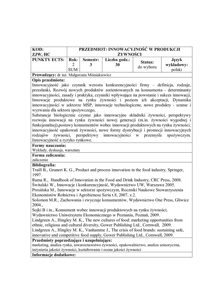 KOD: PRZEDMIOT: INNOWACYJNOŚĆ W PRODUKCJI ZJW, HC ŻYWNOŚCI PUNKTY ECTS: Rok: Semestr: Liczba godz.: Język Status: 2 3 30 wykładowy: do wyboru SUM polski Prowadzący: dr inż. Małgorzata Miśniakiewicz Opis przedmiotu: Innowacyjność jako czynnik wzrostu konkurencyjności firmy – definicja, rodzaje, przesłanki, Rozwój nowych produktów zorientowanych na konsumenta - determinanty innowacyjności, zasady i praktyka, czynniki wpływające na powstanie i sukces innowacji, Innowacje produktowe na rynku żywności i poziom ich akceptacji, Dynamika innowacyjności w sektorze MSP, innowacje technologiczne, nowe produkty - szanse i wyzwania dla sektora spożywczego, Substancje biologicznie czynne jako innowacyjne składniki żywności, perspektywy rozwoju innowacji na rynku żywności nowej generacji (m.in. żywności wygodnej i funkcjonalnej),postawy konsumentów wobec innowacji produktowych na rynku żywności, innowacyjność opakowań żywności, nowe formy dystrybucji i promocji innowacyjnych rodzajów żywności, perspektywy innowacyjności w przemyśle spożywczym. Innowacyjność a ryzyko rynkowe. Formy nauczania: Wykłady, dyskusja, warsztaty Forma zaliczenia: zaliczenie Bibliografia: Traill B., Grunert K. G., Product and process innovation in the food industry, Springer, 1997. Rama R., Handbook of Innovation in the Food and Drink Industry, CRC Press, 2008. Świtalski W., Innowacje i konkurencyjność, Wydawnictwo UW, Warszawa 2005. Prosińska M., Innowacje w sektorze spożywczym, Roczniki Naukowe Stowarzyszenia Ekonomistów Rolnictwa i Agrobiznesu Seria t.8, 2007, z.2. Solomon M.R., Zachowania i zwyczaje konsumentów, Wydawnictwo One Press, Gliwice 2004., Sojki B i in., Konsument wobec innowacji produktowych na rynku żywności, Wydawnictwo Uniwersytetu Ekonomicznego w Poznaniu, Poznań, 2009. Lindgreen A., Hingley M. K., The new cultures of food: marketing opportunities from ethnic, religious and cultural diversity, Gower Publishing Ltd., Cornwall, 2009. Lindgreen A., Hingley M. K., Vanhamme J., The crisis of food brands: sustaining safe, innovative and competitive food supply, Gower Publishing Ltd., Cornwall, 2009. Przedmioty poprzedzające i uzupełniające: marketing, analiza rynku, towaroznawstwo żywności, opakowalnictwo, analiza sensoryczna, inżynieria jakości żywności, kształtowanie i ocena jakości żywności Informacje dodatkowe: