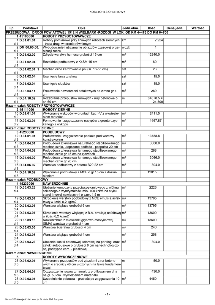 KOSZTORYS OFERTOWY Lp. Podstawa Opis Jedn.obm. Ilość Cena jedn. PRZEBUDOWA DROGI POWIATOWEJ 1512 N WIELBARK -ROZOGI W LOK. OD KM 4+476 DO KM 6+700 1 45100000 ROBOTY PRZYGOTOWAWCZE 1 D.01.01.01 Roboty pomiarowe przy liniowych robotach ziemnych km 2.224 d.1 - trasa drogi w terenie równinnym 2 DM.00.00.00. Wybudowanie i utrzymanie objazdów czasowej orga- ryczłt 1 d.1 nizacji ruchu 3 D.01.02.02 Zdjęcie warstwy humusu grubości 15 cm m2 12240.0 d.1 4 D.01.02.04 Rozbiórka podbudowy z KŁSM 15 cm m2 80 d.1 5 D.01.02.01 1 Mechaniczne karczowanie pni (śr. 16-55 cm) szt 23 d.1 6 D.01.02.04 Usunięcie tarcz znaków szt 15.0 d.1 7 D.01.02.04 Usunięcie słupków szt 15.0 d.1 8 D.05.03.11 Frezowanie nawierzchni asfaltowych na zimno gr 4 m2 289 d.1 cm 9 D.04.10.02 Rozebranie przepustów rurowych - rury betonowe o m 8+8+8.5 = d.1 śr. 60 cm 24.500 Razem dział: ROBOTY PRZYGOTOWAWCZE 2 45111000 ROBOTY ZIEMNE 10 D.02.01.01 Wykonanie wykopów w gruntach kat. I-V z wywiezie- m3 2411.5 d.2 niem materiału 11 D.02.03.01 Formowanie i zagęszczanie nasypów z gruntu uzys- m3 1667.87 d.2 kanego z wykopu Razem dział: ROBOTY ZIEMNE 3 45233000 PODBUDOWY 12 D.04.01.01 Profilowanie i zagęszczanie podłoża pod warstwy m2 13788.8 d.3 konstrukcyjne 13 D.04.04.01 Podbudowa z kruszywa naturalnego stabilizowanego m2 3088.0 d.3 mechanicznie, ulepszone podłoże - pospółka 20 cm 14 D.04.04.02 Podbudowa z kruszywa łamanego stabilizowanego m2 268 d.3 mechanicznie gr 15 cm,na zjazdach 15 D.04.04.02 Podbudowa z kruszywa łamanego stabilizowanego m2 3066.0 d.3 mechanicznie gr 20 cm 16 D.04.06.02 Warstwa podbudowy z betonu B20 22 cm m2 304.0 d.3 17 D.04.10.02 Wykonanie podbudowy z MCE o gr 15 cm z doziar- m2 12015 d.3 nieniem Razem dział: PODBUDOWY 4 45233000 NAWIERZCHNIE 18 D.05.03.26 Ułożenie kompozytu przeciwspękaniowego z włókna m2 2226 d.4 szklanego o wytrzymałości min. 100 kN/m na styku starej i nowej nawierzchni o szer. 1,5 m 19 D.04.03.01 Skropienie warstwy podbudowy z MCE emulsją asfal- m2 13795 d.4 tową w ilości 0,2 kg/m2 20 D.05.03.05 Warstwa wiążąca grubości 6 cm m2 13795 d.4 21 D.04.03.01 Skropienie warstwy wiążącej z B.A. emulsją asfaltową m2 13600 d.4 w ilości 0,2 kg/m2 22 D.05.03.13 Nawierzchnia z mieszanki grysowo-mastyksowej m2 13600 d.4 (SMA) warstwa o grubości 4 cm 23 D.05.03.05 Warstwa ścieralna grubości 4 cm m2 246 d.4 24 D.05.03.05 Warstwa wiążąca grubości 4 cm m2 258 d.4 25 D.05.03.23 Ułożenie kostki betonowej kolorowej na parkingi oraz m2 304.0 d.4 zatoki autobusowe o grubości 8 cm na technologicznej podsypce cem. - piaskowej Razem dział: NAWIERZCHNIE 5 ROBOTY WYKOŃCZENIOWE 26 D.06.02.01 Wykonanie przepustów pod zjazdami z rur betonom 50.0 d.5 wych o średnicy 40 cm ułożonych na ławie fundamentowej 27 D.06.04.01 Oczyszczenie rowów z namułu z profilowaniem dna m 430.0 d.5 na gł. 50 cm i wywiezieniem materiału 28 D.02.03.01 Uzupełnienie pobocza - grubość po zagęszczeniu 10 m2 4450 d.5 cm -1Norma STD Wersja 4.20a Licencja: 6418 dla ZDP Szczytno Wartość KOSZTORYS OFERTOWY Lp. Podstawa Opis 29 KNR 2-31 Przepusty rurowe - rury betonowe o śr. 60 cm d.5 0605-08 Razem dział: ROBOTY WYKOŃCZENIOWE 6 45233000 URZĄDZENIA BEZPIECZEŃSTWA RUCHU 30 D.07.02.01 Przymocowanie tarcz znaków średnich z folii typ 1; d.6 ostrzegawcze (A) 31 D.07.02.01 Przymocowanie tarcz znaków średnich z folii typ 1; d.6 zakazu i informacyjne (D - 600x600) 32 D.07.02.01 Przymocowanie tarcz znaków E d.6 33 D.07.02.01 Przymocowanie tarcz znaków średnich z folii typ 1; d.6 tabliczki dom znaków (T) 34 D.07.02.01 Przymocowanie tarcz znaków U3c, U3e d.6 35 D.07.02.01 Ustawienie słupków stalowych d.6 Razem dział: URZĄDZENIA BEZPIECZEŃSTWA RUCHU 7 45233000 ELEMENTY ULIC 36 D.08.01.01 Ustawienie krawężników betonowych 30x20x100 na d.7 ławie betonowej z oporem z B-15 37 D.08.01.01 Ustawienie krawężników betonowych wtopionych d.7 30x20x100 na ławie betonowej z oporem z B-15 38 D.08.01.01 Ustawienie krawężników betonowych najazdowych d.7 22x15x100 na ławie betonowej z B-15 39 D.08.03.01 Ustawienie obrzeży betonowych 30x8x100 cm d.7 40 GG.00.12.01 Pomiar powykonawczy zrealizowanych obiektów drod.7 gowych i mostowych Razem dział: ELEMENTY ULIC Wartość kosztorysowa robót bez podatku VAT Podatek VAT Ogółem wartość kosztorysowa robót Słownie: -2Norma STD Wersja 4.20a Licencja: 6418 dla ZDP Szczytno Jedn.obm. m szt Ilość 8+8+8.5 = 24.500 14 szt 4.0 szt 12.0 szt 4.0 szt 3.0 szt 37 m 112.0 m 116 m 112 m km 89.5 1.933 Cena jedn. Wartość