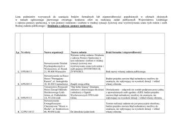 Lista podmiotów wzywanych do usunięcia braków formalnych lub nieprawidłowości popełnionych w ofertach złożonych w ramach ogłoszonego pierwszego otwartego konkursu ofert na realizację zadań publicznych Województwa Łódzkiego z zakresu pomocy społecznej, w tym pomocy rodzinom i osobom w trudnej sytuacji życiowej oraz wyrównywania szans tych rodzin i osób. Rodzaj zadania publicznego : Działania z zakresu pomocy społecznej . Lp. Nr oferty 1. 5/PS/68/13 2. 6/PS/69/13 3. 9/PS/97/13 4. 12/PS/110/13 Nazwa organizacji Stowarzyszenie Działań Psychospołecznych w Wieruszowie, ul. Rynek 21, 98-400 Wieruszów Stowarzyszenie na Rzecz Dzieci "Pomagajmy Razem", ul. Jasnogórska 34, 42-202 Częstochowa Towarzystwo Przyjaciół Dzieci Zarząd Oddziału Dzielnicowego ŁódźGórna, ul. Podhalańska 2A, 93-224 Łódź Stowarzyszenie EwangelizacyjnoCharytatywne "Mocni w Duchu", ul. Sienkiewicza 60, 90-058 Łódź Nazwa zadania Braki formalne i nieprawidłowości Wpisano rodzaj zadania: Działania z zakresu Pomocy Społecznej w tym rodzinom i osobom w trudnej sytuacji życiowej oraz wyrównywanie szans tych rodzin i osób poprzez DYSTRYBUCJĘ ŻYWNOŚCI. Brak nazwy własnej zadania publicznego. Znajdź swoją orbitę "Daj Sobie Szansę" Działania osłonowe i aktywizujące dla dzieci i młodzieży z Ognisk Wychowawczych TPD ŁódźGórna. Do dorosłości jeden krok Budżet projektu zawiera błąd rachunkowy możliwy do usunięcia, nie wpływający na wysokość dotacji i wkład własny oferenta. Oświadczenie – załącznik nie zostało podpisane przez jedną z upoważnionych osób zgodnie z KRS, budżet projektu zawiera błąd rachunkowy możliwy do usunięcia, nie wpływający na wysokość dotacji i wkład własny oferenta. Termin realizacji zadania nie jest precyzyjnie określony, budżet projektu zawiera błąd rachunkowy możliwy do usunięcia, nie wpływający na wysokość dotacji i wkład własny oferenta. Fundacja "UWOLNIENIE", ul. Inowrocławska 5A, 91020 Łódź Aktywizacja społeczna osób w wieku emerytalnym 6. 16/PS/142/13 Fundacja "Dzieci i My", ul. Pasłęcka 12 C, lok. 66, 03-137 Warszawa Dofinansowana diagnostyka i terapia Integracji Sensorycznej w ramach działań z zakresu pomocy społecznej - projekt osłonowy i aktywizujący dla dzieci w wieku przedszkolnym i wczesnoszkolnym Brak oświadczenia – załącznika, oświadczenie na końcu oferty nie zostało w całości wypełnione, budżet projektu zawiera błędy rachunkowe możliwe do usunięcia i nie wpływające na wysokość kwoty wnioskowanej dotacji i wkładu własnego oferenta. Brak terminu realizacji zadania w harmonogramie oferty, oświadczenie na końcu oferty nie zostało kompletnie wypełnione oraz zawiera błędną datę do której oferent związany jest z ofertą, budżet projektu zawiera błąd rachunkowy możliwy do usunięcia i nie wpływający na wysokość kwoty wnioskowanej dotacji i wkładu własnego oferenta. 7. 22/PS/238/13 Fundacja Wsparcia Psychospołecznego, ul. Bydgoska 15, lok. 8, 91036 Łódź Prowadzenie jednostki specjalistycznego poradnictwa Termin realizacji zadania nie jest jednoznacznie określony. "Wykluczenie - wykluczone!" Budżet projektu zawiera błąd rachunkowy możliwy do usunięcia, nie wpływający na wysokość dotacji i wkład własny oferenta. Poradnictwo prawne dla osób niesłyszących Budżet projektu zawiera błąd rachunkowy możliwy do usunięcia, nie wpływający na wysokość dotacji i wkład własny oferenta. Prowadzenie zajęć świetlicowych. Brak dokumentu potwierdzającego powołanie Przełożonej Domu Zakonnego w Poddębicach. 5. 14/PS/120/13 8. 23/PS/239/13 9. 24/PS/240/13 10. 27/PS/243/13 "FUNDACJA PRESTERNO - Ośrodek w Łodzi", ul. Nawrot 46, 90-014 Łódź Polski Związek Głuchych Oddział Łódzki, ul. Nawrot 94/96, 90-040 Łódź Dom Zakonny Zgromadzenia Sióstr Maryi Niepokalanej w Poddębicach, ul. Łęczycka 24, 99-200 Poddębice 11. 33/PS/276/13 Łowickie Stowarzyszenie "Dać Szanse", ul. Mostowa 4, 99-400 Łowicz "Wyjazdowe warsztaty terapeutyczno-edukacyjne dla osób Budżet projektu zawiera błąd rachunkowy możliwy do i rodzin w trudnej sytuacji usunięcia, nie wpływający na wysokość dotacji i wkład życiowej" własny oferenta. 12. 35/PS/280/13 Caritas Archidiecezji Łódzkiej, ul. Gdańska 111, 90-507 Łódź Dystrybucja żywności wśród podopiecznych Punktu Pomocy Charytatywnej 13. 45/PS/290/13 Fundacja Centrum Praw Kobiet Oddział w Łodzi, ul. Piotrkowska 115, lok.4, 90-430 Łódź 14. 47/PS/292/13 Międzynarodowa Fundacja Kobiet, ul. Więckowskiego 13, 90721 Łódź 15. 48/PS/293/13 Stowarzyszenie Niecodzienni, ul. Łagiewnicka 79, lok.8, 91-855 Łódź Budżet projektu zawiera błąd rachunkowy możliwy do usunięcia i nie wpływający na wysokość kwoty wnioskowanej dotacji i wkładu własnego oferenta. Termin realizacji zadania nie jest jednoznacznie określony, budżet projektu zawiera błędy rachunkowe możliwe do usunięcia, nie wpływające na wysokość dotacji i wkład własny oferenta, oświadczenie – załącznik zostało złożone Równe szanse - zapewnienie poradnictwa i wsparcia dla kobiet i na nieprawidłowym druku, kserokopie KRS i statutu nie rodzin w woj. łódzkim poświadczone za zgodność z oryginałem na każdej stronie. Termin realizacji zadania nie jest precyzyjnie określony, "Wojewódzki ośrodek wsparcia oświadczenie na końcu oferty nie zostało kompletnie prawno-psychologicznego dla osób wypełnione, budżet projektu zawiera błędy rachunkowe zagrożonych wykluczeniem możliwe do usunięcia i nie wpływające na wysokość kwoty społecznym" wnioskowanej dotacji i wkładu własnego oferenta. Oświadczenie – załącznik nie zostało podpisane przez jedną z upoważnionych osób zgodnie z KRS, brak możliwości "Republika Młodych" czyli klub stwierdzenia, czy KRS i statut zostały poświadczone za działań osłonowych i zgodność z oryginałem przez osoby upoważnione do aktywizujących dl