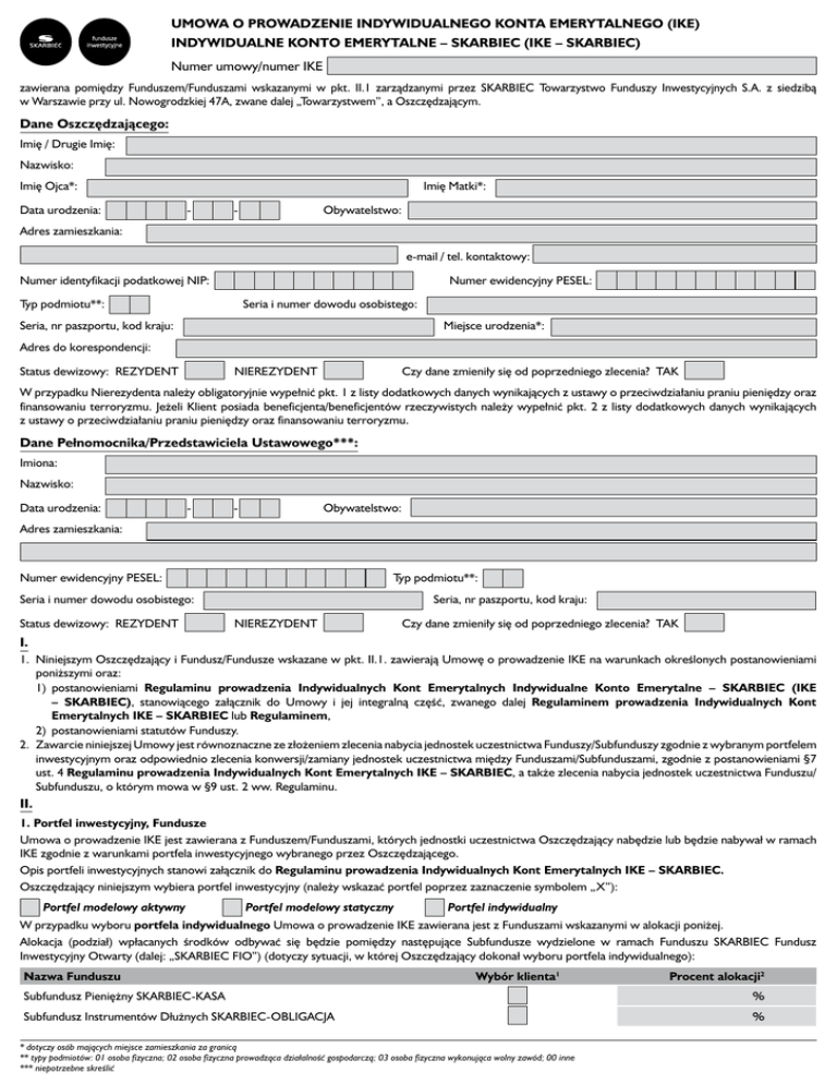 Umowa o prowadzenie IndywidualnEGO KontA EmerytalnEGO (IKE) INDYWIDUALNE KONTO EMERYTALNE – SKARBIEC (IKE – SKARBIEC) Numer umowy/numer IKE zawierana pomi´dzy Funduszem/Funduszami wskazanymi w pkt. II.1 zarzàdzanymi przez SKARBIEC Towarzystwo Funduszy Inwestycyjnych S.A. z siedzibà w Warszawie przy ul. Nowogrodzkiej 47A, zwane dalej „Towarzystwem”, a Oszcz´dzajàcym. Dane Oszcz´dzajàcego: Imi´ / Drugie Imi´: Nazwisko: Imi´ Ojca*: Imi´ Matki*: Data urodzenia: - - Obywatelstwo: Adres zamieszkania: e-mail / tel. kontaktowy: Numer identyfikacji podatkowej NIP: Typ podmiotu**: Numer ewidencyjny PESEL: Seria i numer dowodu osobistego: Seria, nr paszportu, kod kraju: Miejsce urodzenia*: Adres do korespondencji: Status dewizowy: REZYDENT NIEREZYDENT Czy dane zmieni∏y si´ od poprzedniego zlecenia? TAK W przypadku Nierezydenta nale˝y obligatoryjnie wype∏niç pkt. 1 z listy dodatkowych danych wynikajàcych z ustawy o przeciwdzia∏aniu praniu pieni´dzy oraz finansowaniu terroryzmu. Je˝eli Klient posiada beneficjenta/beneficjentów rzeczywistych nale˝y wype∏niç pkt. 2 z listy dodatkowych danych wynikajàcych z ustawy o przeciwdzia∏aniu praniu pieni´dzy oraz finansowaniu terroryzmu. Dane Pełnomocnika/Przedstawiciela Ustawowego***: Imiona: Nazwisko: Data urodzenia: - - Obywatelstwo: Adres zamieszkania: Numer ewidencyjny PESEL: Typ podmiotu**: Seria i numer dowodu osobistego: Status dewizowy: REZYDENT Seria, nr paszportu, kod kraju: NIEREZYDENT Czy dane zmieni∏y si´ od poprzedniego zlecenia? TAK I. 1. Niniejszym Oszcz´dzajàcy i Fundusz/Fundusze wskazane w pkt. II.1. zawierajà Umow´ o prowadzenie IKE na warunkach okreÊlonych postanowieniami poni˝szymi oraz: 1) postanowieniami Regulaminu prowadzenia Indywidualnych Kont Emerytalnych Indywidualne Konto Emerytalne – SKARBIEC (IKE – SKARBIEC), stanowiàcego załàcznik do Umowy i jej integralnà cz´Êç, zwanego dalej Regulaminem prowadzenia Indywidualnych Kont Emerytalnych IKE – SKARBIEC lub Regulaminem, 2) postanowieniami statutów Funduszy. 2. Zawarcie niniejszej Umowy jest równoznaczne ze zło˝eniem zlecenia nabycia jednostek uczestnictwa Funduszy/Subfunduszy zgodnie z wybranym portfelem inwestycyjnym oraz odpowiednio zlecenia konwersji/zamiany jednostek uczestnictwa mi´dzy Funduszami/Subfunduszami, zgodnie z postanowieniami §7 ust. 4 Regulaminu prowadzenia Indywidualnych Kont Emerytalnych IKE – SKARBIEC, a tak˝e zlecenia nabycia jednostek uczestnictwa Funduszu/ Subfunduszu, o którym mowa w §9 ust. 2 ww. Regulaminu. II. 1. Portfel inwestycyjny, Fundusze Umowa o prowadzenie IKE jest zawierana z Funduszem/Funduszami, których jednostki uczestnictwa Oszcz´dzajàcy nab´dzie lub b´dzie nabywał w ramach IKE zgodnie z warunkami portfela inwestycyjnego wybranego przez Oszcz´dzajàcego. Opis portfeli inwestycyjnych stanowi załàcznik do Regulaminu prowadzenia Indywidualnych Kont Emerytalnych IKE – SKARBIEC. Oszcz´dzajàcy niniejszym wybiera portfel inwestycyjny (nale˝y wskazaç portfel poprzez zaznaczenie symbolem „X”): Portfel modelowy aktywny Portfel modelowy statyczny Portfel indywidualny W przypadku wyboru portfela indywidualnego Umowa o prowadzenie IKE zawierana jest z Funduszami wskazanymi w alokacji poni˝ej. Alokacja (podział) wpłacanych Êrodków odbywaç si´ b´dzie pomi´dzy nast´pujàce Subfundusze wydzielone w ramach Funduszu SKARBIEC Fundusz Inwestycyjny Otwarty (dalej: „SKARBIEC FIO”) (dotyczy sytuacji, w której Oszcz´dzajàcy dokonał wyboru portfela indywidualnego): Nazwa Funduszu Wybór klienta1 Procent alokacji2 Subfundusz Pieni´˝ny SKARBIEC-KASA % Subfundusz Instrumentów Dłu˝nych SKARBIEC-OBLIGACJA % * dotyczy osób majàcych miejsce zamieszkania za granicà ** typy podmiotów: 01 osoba fizyczna; 02 osoba fizyczna prowadzàca działalnoÊç gospodarczà; 03 osoba fizyczna wykonujàca wolny zawód; 00 inne *** niepotrzebne skreÊliç Nazwa Funduszu Wybór klienta1 Procent alokacji2 Subfundusz Dłu˝nych Papierów WartoÊciowych SKARBIEC-DEPOZYTOWY % Subfundusz SKARBIEC-RYNKÓW WSCHODZÑCYCH % Subfundusz SKARBIEC-III FILAR % Subfundusz Zrównowa˝ony SKARBIEC-WAGA % Subfundusz Akcji SKARBIEC-AKCJA % Subfundusz SKARBIEC-MARKET OPPORTUNITIES % Subfundusz SKARBIEC-AKCJI NOWEJ EUROPY % Subfundusz SKARBIEC-RYNKÓW SUROWCOWYCH % Subfundusz SKARBIEC-TOP BRANDS % Subfundusz SKARBIEC-MAŁYCH I ÂREDNICH SPÓŁEK % Subfundusz SKARBIEC-SPÓŁEK WZROSTOWYCH % Subfundusz SKARBIEC-LOKACYJNY % 1 nale˝y zaznaczyç poprzez zaznaczenie symbolem „X”; mo˝na zaznaczyç maksymalnie dwa Subfundusze, 2 procent alokacji mo˝e wahaç si´ w przedziale 10% - 90%, przy czym wartoÊci nale˝y podaç w pełnych dziesiàtkach; suma procentów alokacji wskazanych dla wybranych Subfunduszy musi wynosiç 100% 2. Przekroczenie limitu wpłat W przypadku, gdy suma wpłat dokonanych przez Oszcz´dzajàcego w danym roku kalendarzowym na IKE prowadzone przez Fundusze, przekroczy limit wpłat, ustalony zgodnie z §6 Regulaminu, wpłaty przewy˝szajàce ww. kwot´ zostanà przeznaczone, je˝eli nadpłata wynosi co najmniej 50 zł, na poczet nabycia na rzecz Oszcz´dzajàcego jednostek uczestnictwa Funduszu/Subfunduszu: NAZWA FUNDUSZU/SUBFUDNUSZU: W przypadku braku wskazania w zdaniu poprzednim Funduszu/Subfunduszu, którego jednostki majà byç nabywane na rzecz Oszcz´dzajàcego, wpłaty przewy˝szajàce limit, ustalony zgodnie z §6 Regulaminu zostanà: 1) przeznaczone na poczet nabycia na rzecz Oszcz´dzajàcego jednostek uczestnictwa w Subfunduszu SKARBIEC-DEPOZYTOWY – w przypadku gdy kwota nadpłaty b´dzie wynosiła co najmniej 50 zł; 2) przekazane Oszcz´dzajàcemu przelewem na rachunek bankowy wskazany poni˝ej – w przypadku, gdy kwota nadpłaty b´dzie ni˝sza ni˝ 50 zł. W przypadku niewskazania numeru rachunku bankowego w zdaniu poprzednim kwota nadpłaty zostanie przekazana na inny rachunek uzgodniony z Oszcz´dzajàcym. III. OÊwiadczenia Oszcz´dzajàcego dotyczàce IKE: 1. 